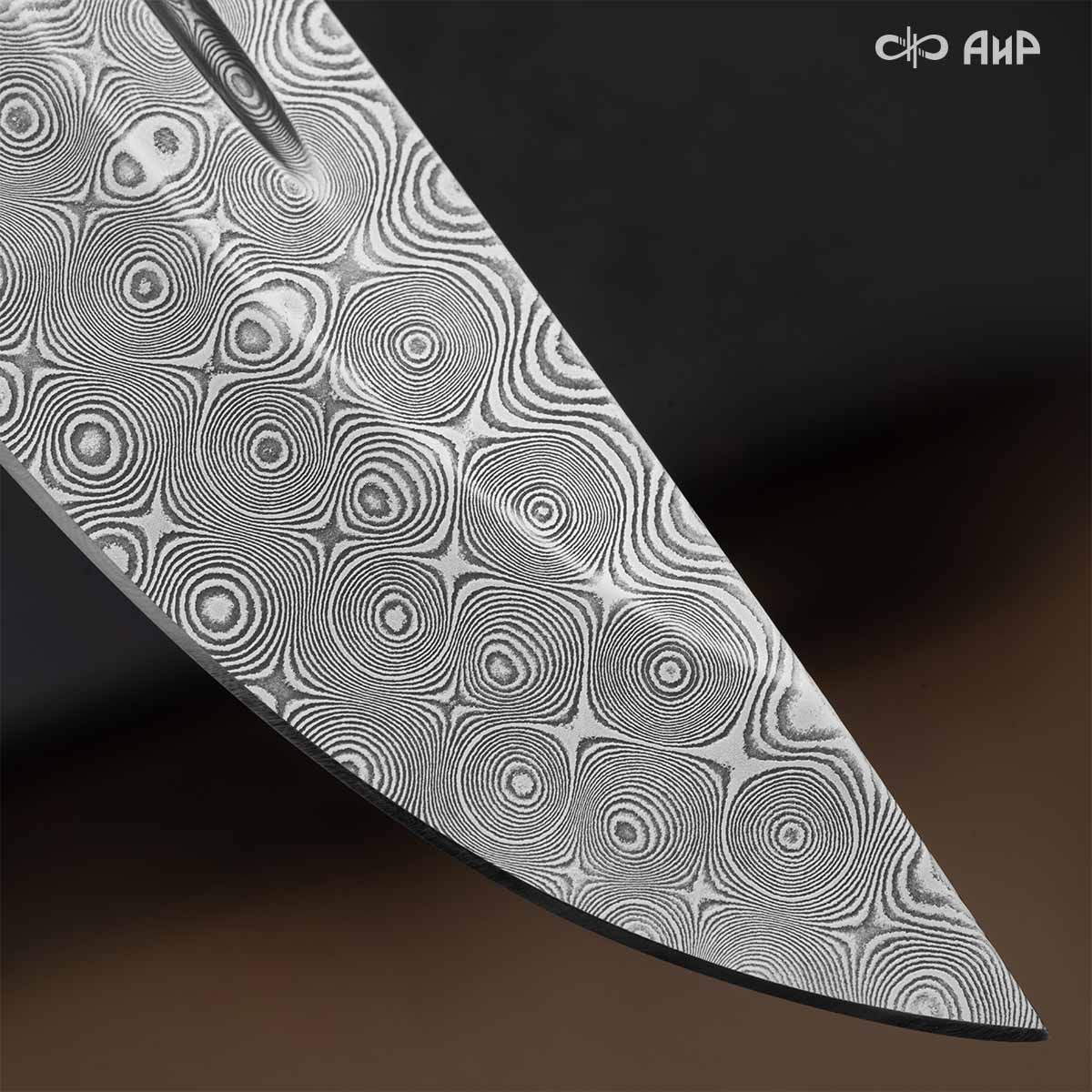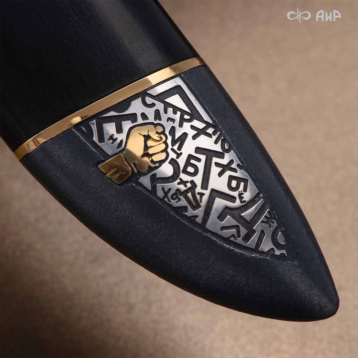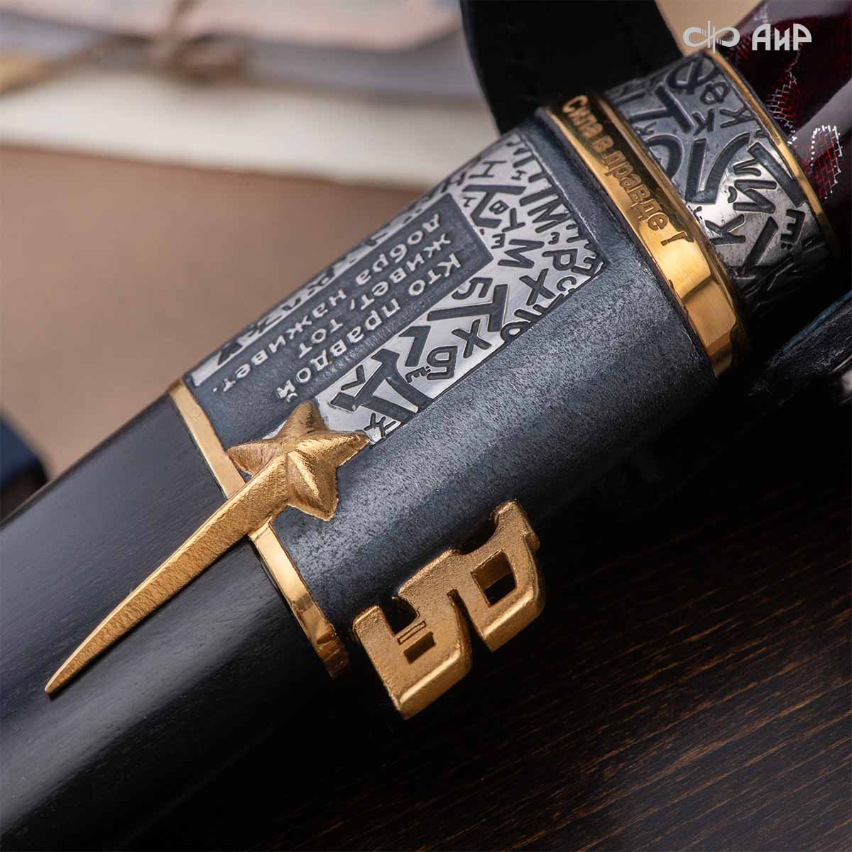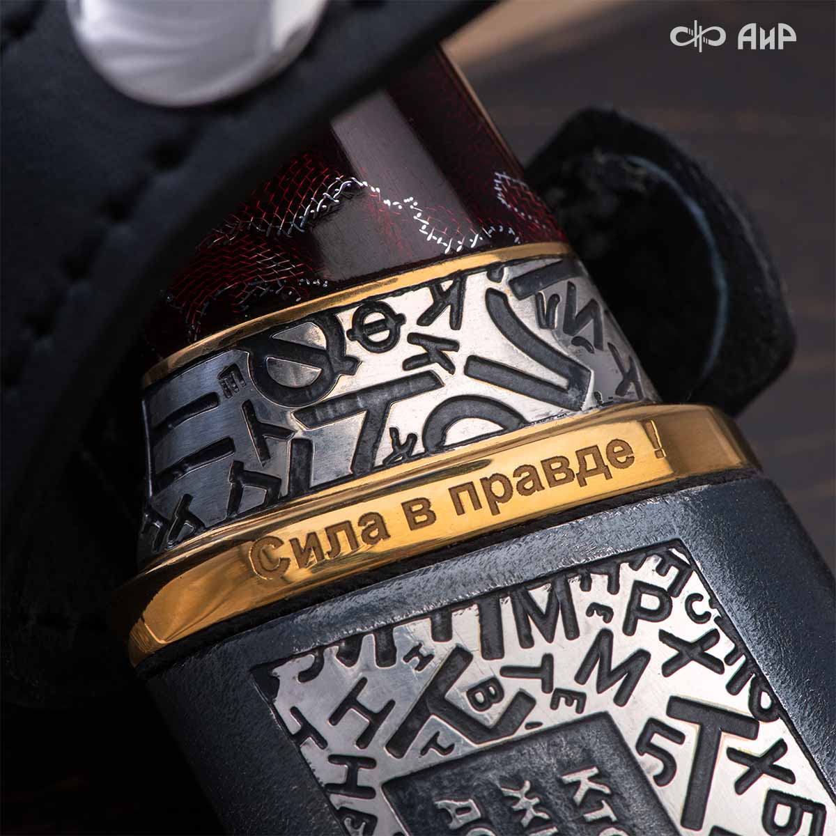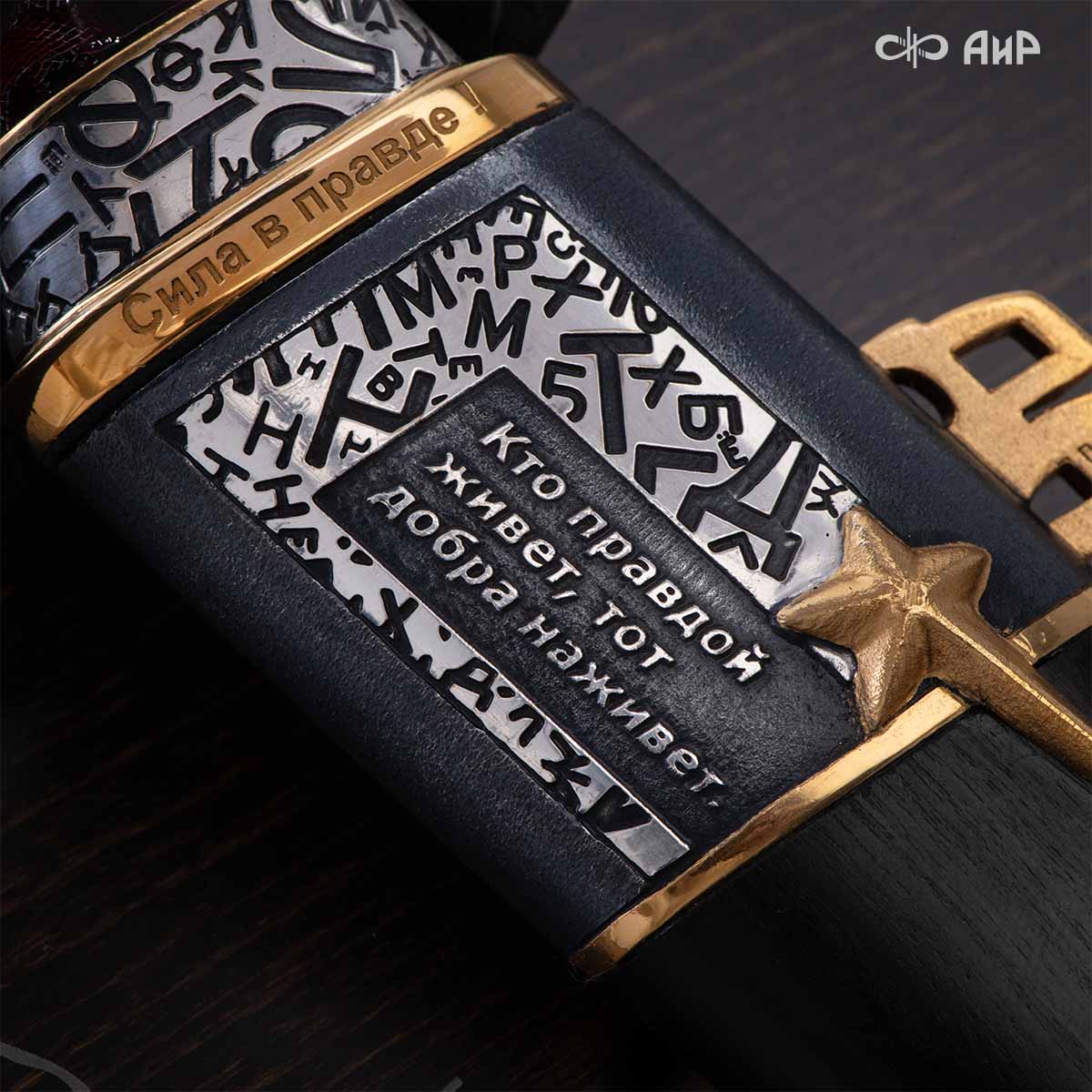 Авторский нож "Правда" с рукоятью из композита с алюминиевой микросеткой (узор "волны", цвет красный), с клинком из дамасской стали ZLADINOX и ножнами, оформленными в газетном стиле шрифтами советской эпохи.