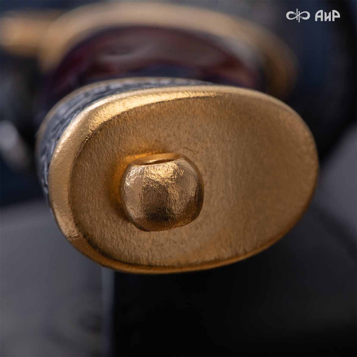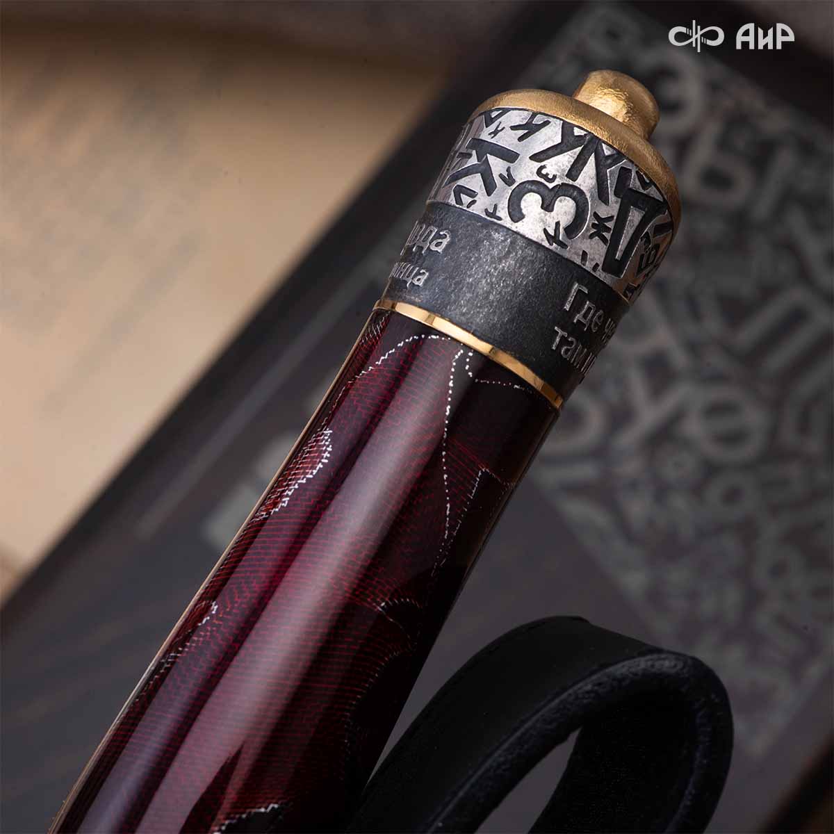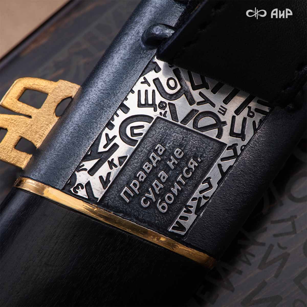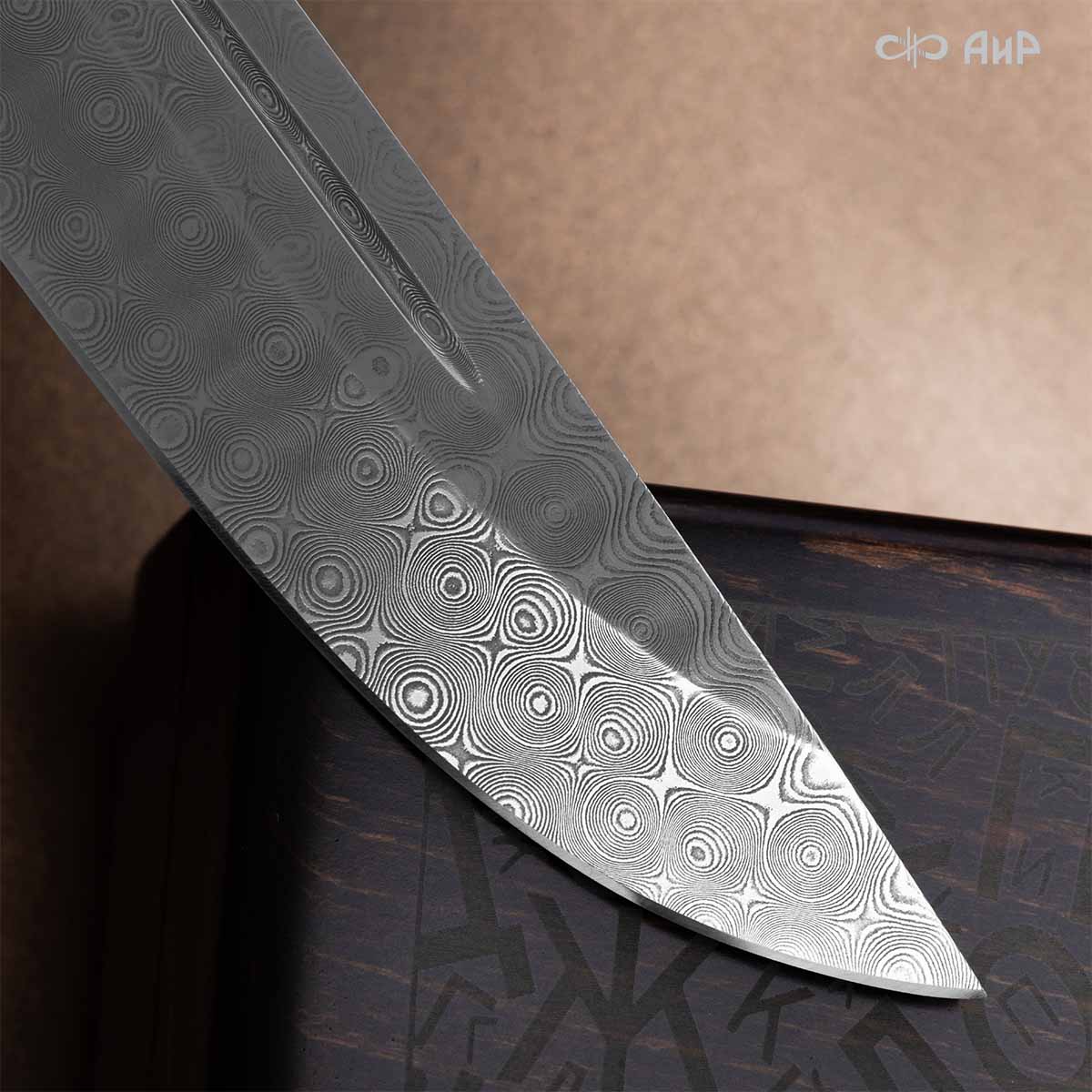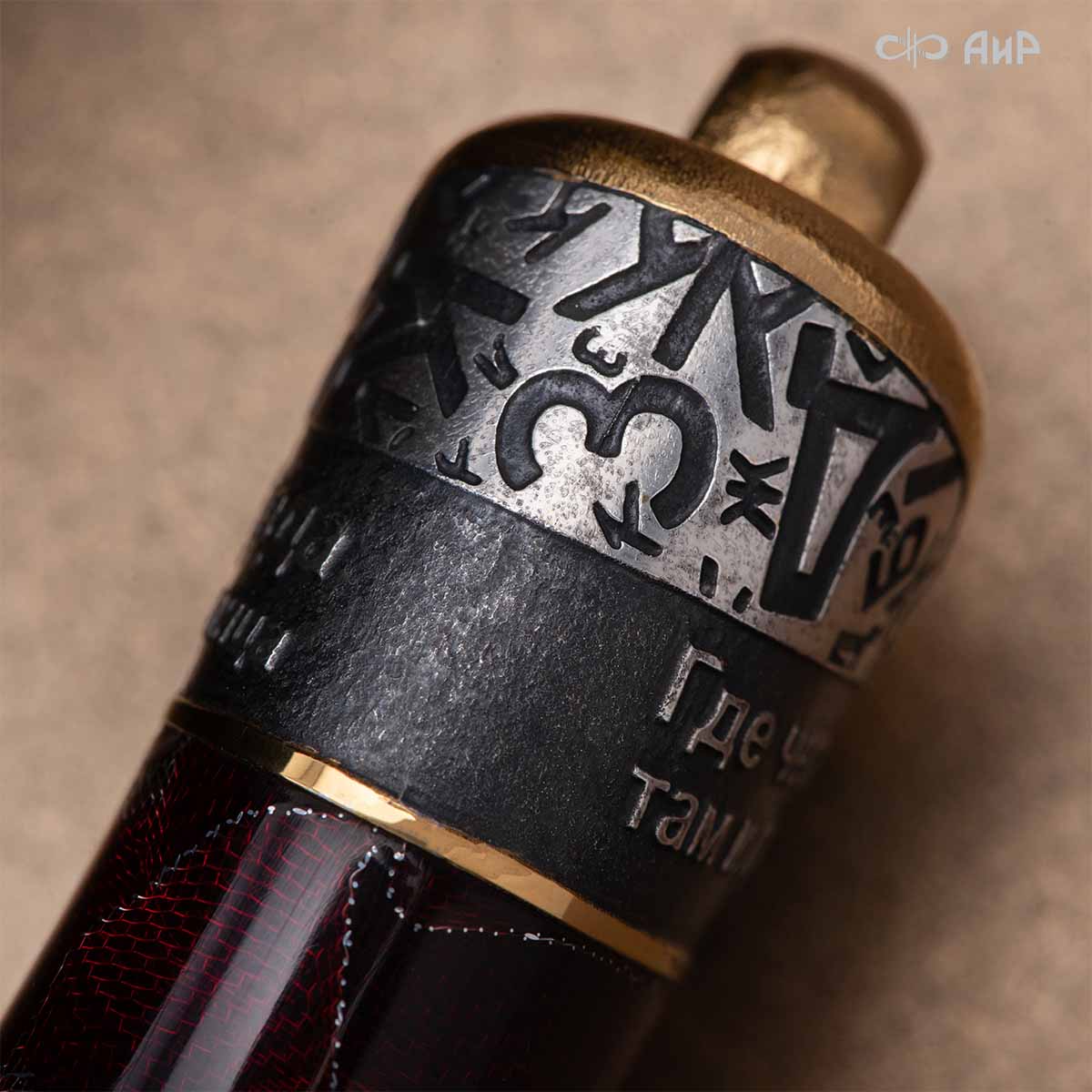 Авторский нож "Правда" с рукоятью из композита с алюминиевой микросеткой (узор "волны", цвет красный), с клинком из дамасской стали ZLADINOX и ножнами, оформленными в газетном стиле шрифтами советской эпохи.