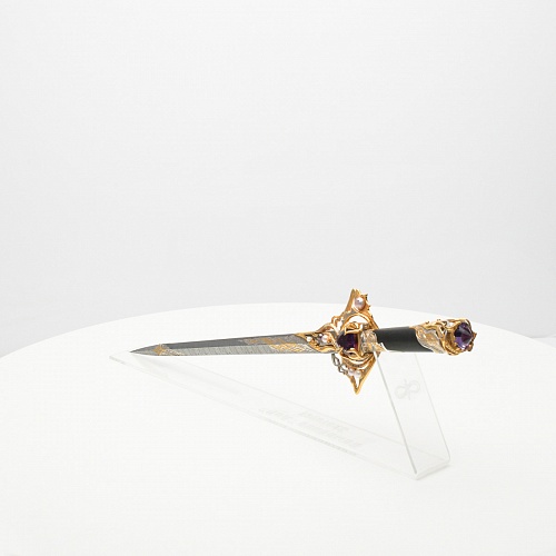 Стилет выражает чувство восхищения могущественной стихией – Водой, которая дает начало новой жизни, спасает и питает все живое на планете. Все детали оружия сочетаются друг с другом и имеют общую взаимосвязь, что гарантирует целостность его восприятия. На лицевой стороне изображено реальное проявление стихии воды, а на обратной стороне изображен знак, подчеркивающий поднебесную ее сущность или душу.