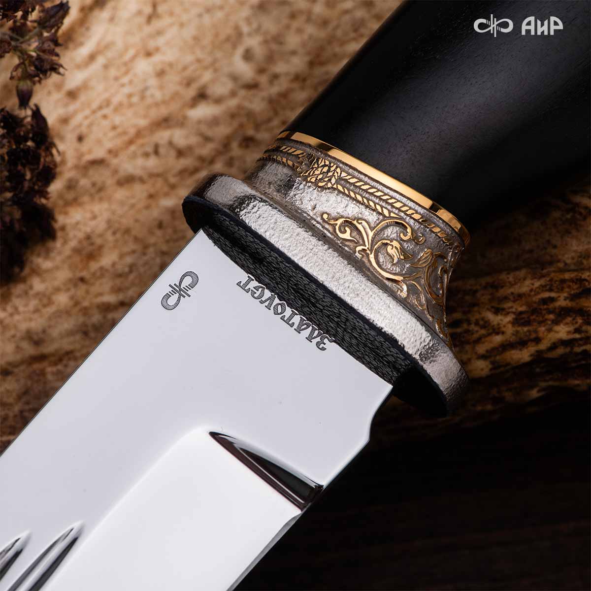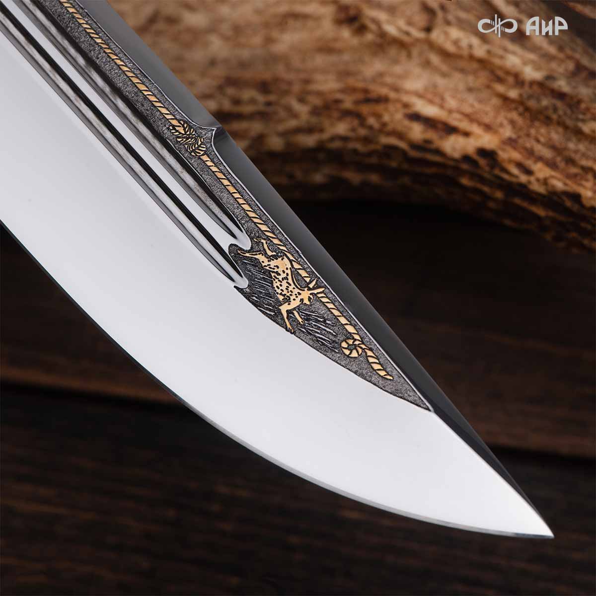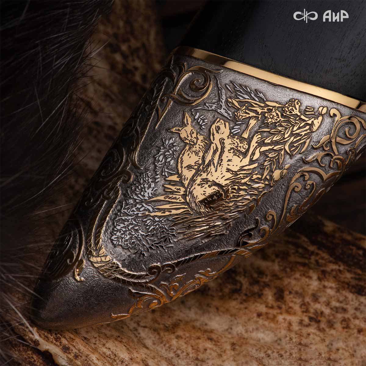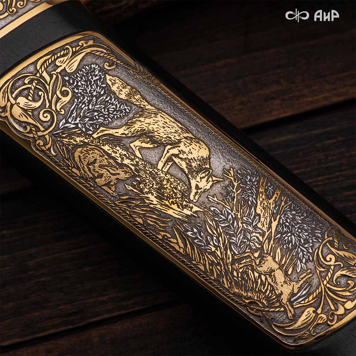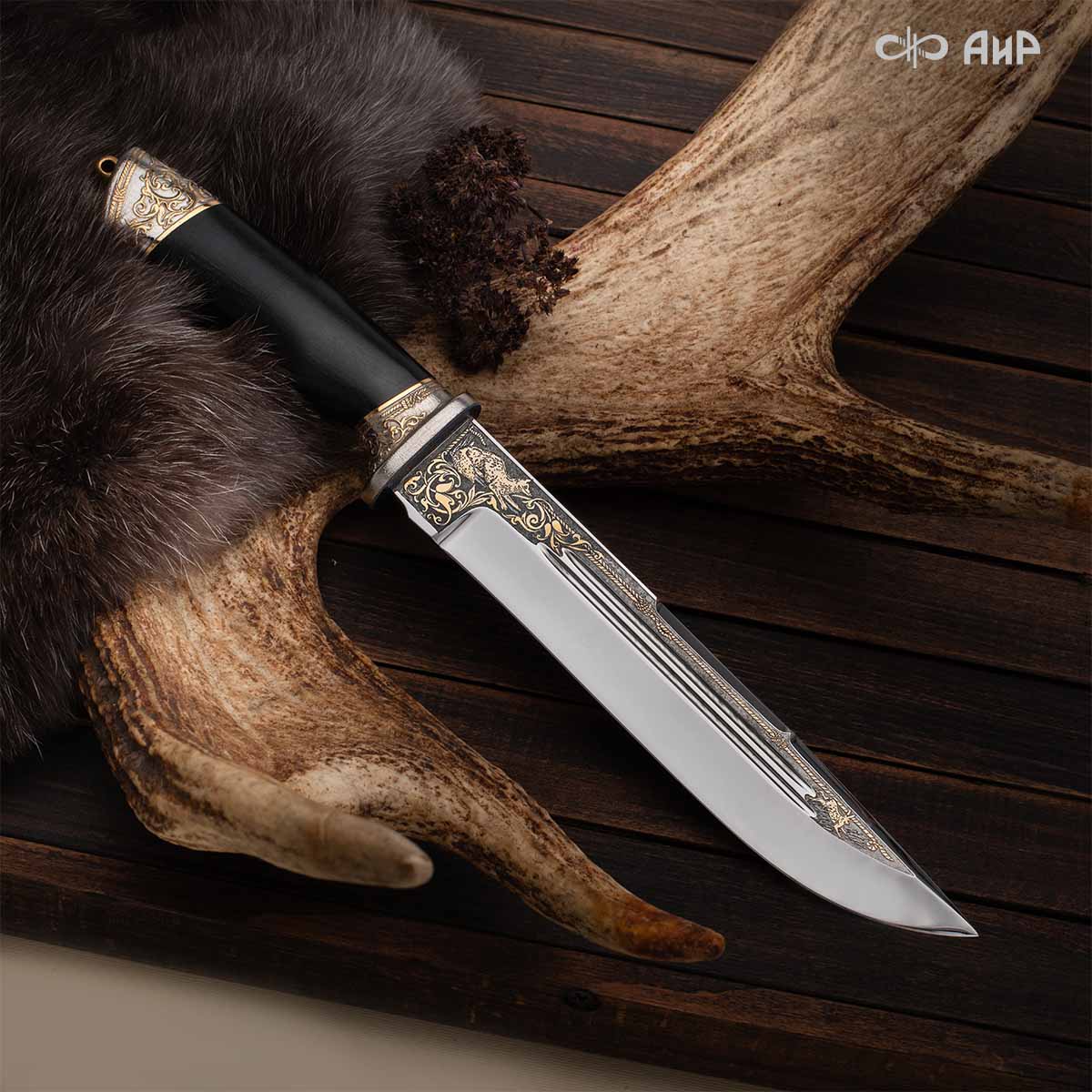 Опытные оружейники и художники Компании «АиР» учитывают особенности оружия, соразмеряя его украшение и практическое назначение ножа. Для охотников и туристов характерен некоторый консерватизм в восприятии художественных достоинств ножей. Поэтому излюбленными и наиболее удачными приемами украшения таких ножей остаются классические охотничьи мотивы, а разнообразие оформительских вариантов достигается за счет различных техник – травления, золочения, гравировки, то есть полного набора приемов создания златоустовской гравюры на металле.