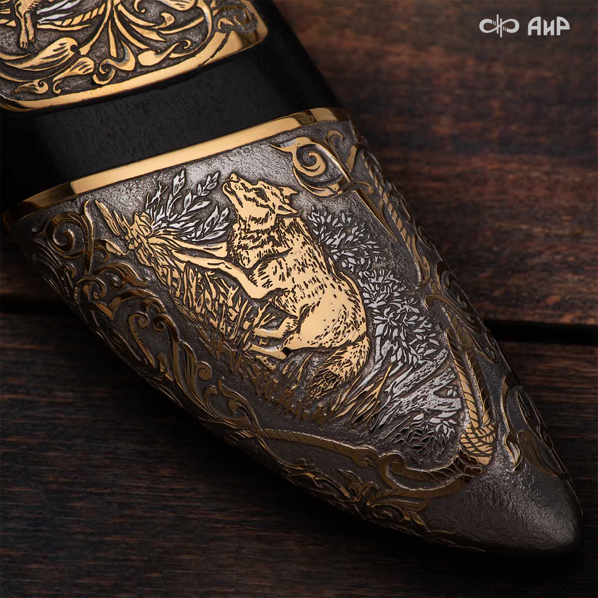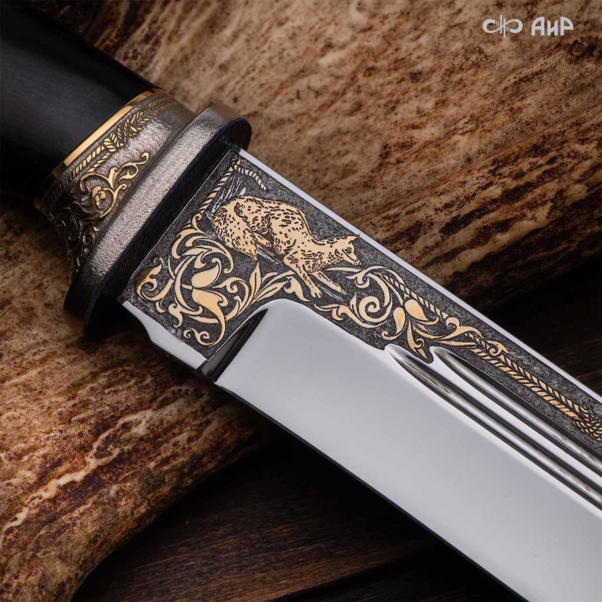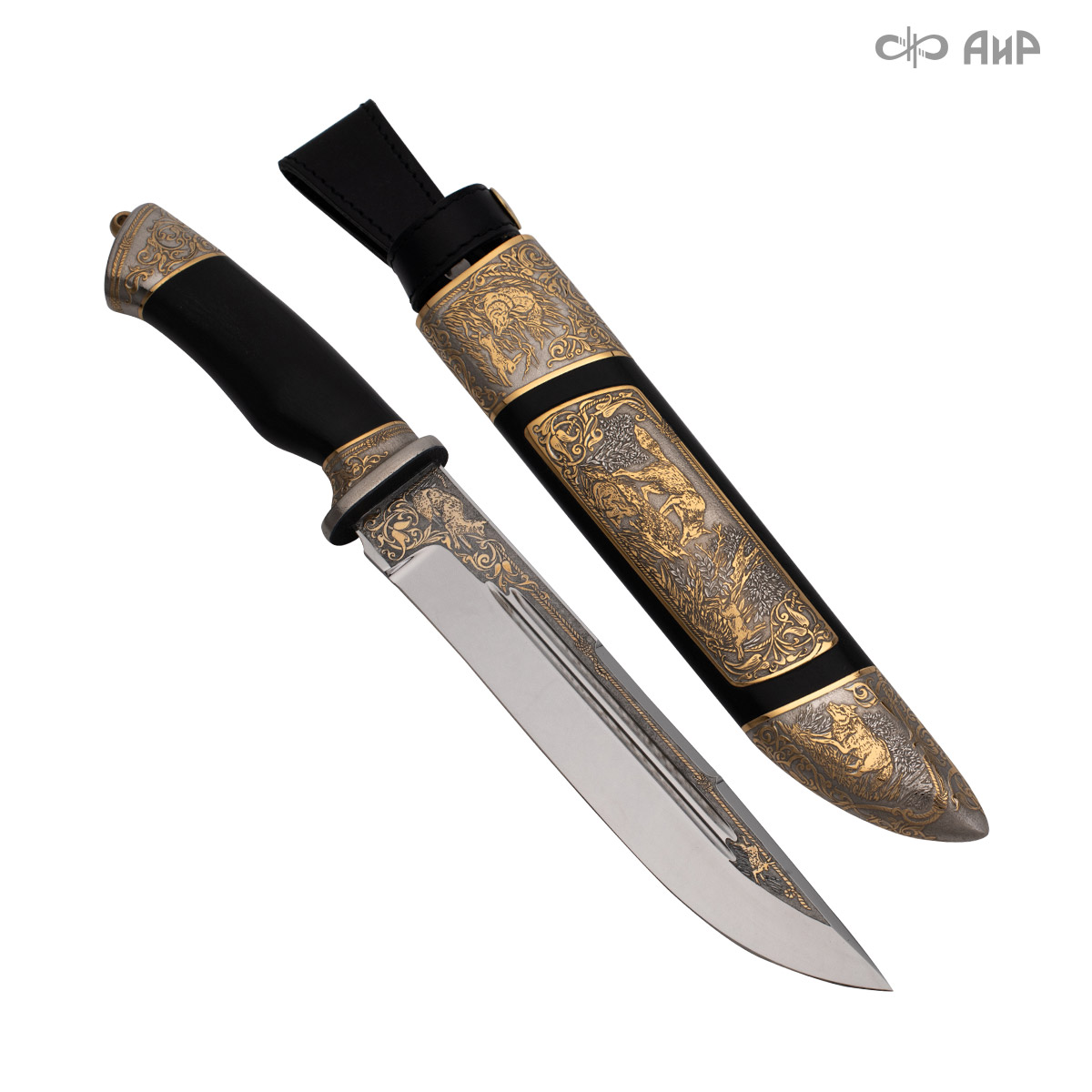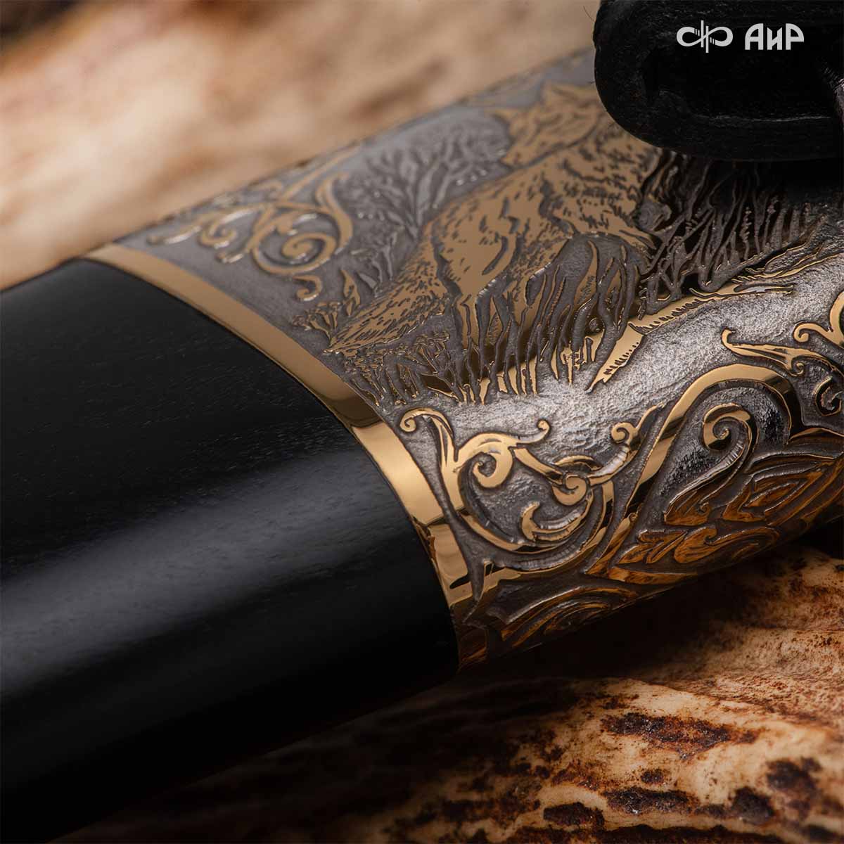 Опытные оружейники и художники Компании «АиР» учитывают особенности оружия, соразмеряя его украшение и практическое назначение ножа. Для охотников и туристов характерен некоторый консерватизм в восприятии художественных достоинств ножей. Поэтому излюбленными и наиболее удачными приемами украшения таких ножей остаются классические охотничьи мотивы, а разнообразие оформительских вариантов достигается за счет различных техник – травления, золочения, гравировки, то есть полного набора приемов создания златоустовской гравюры на металле.