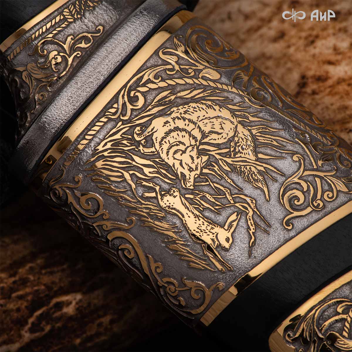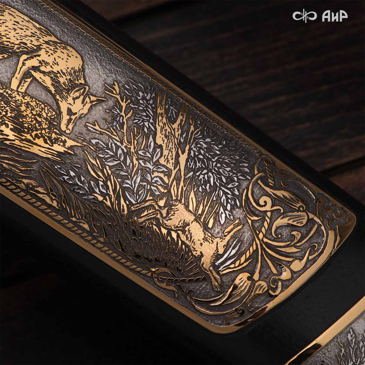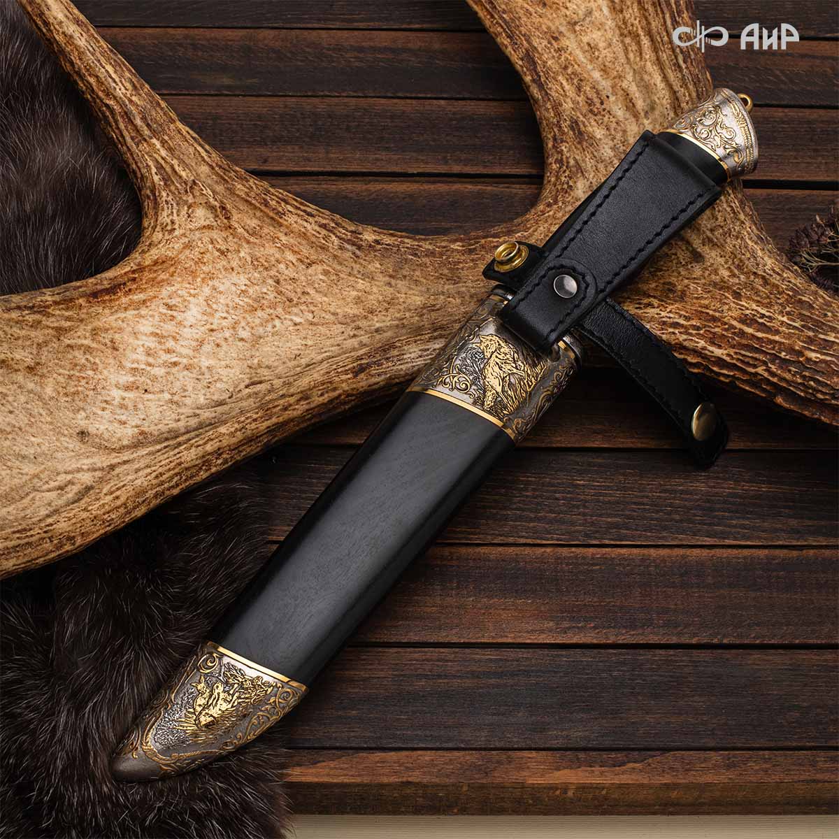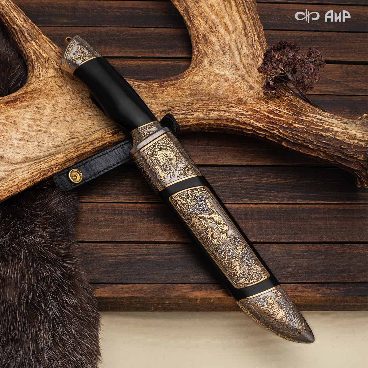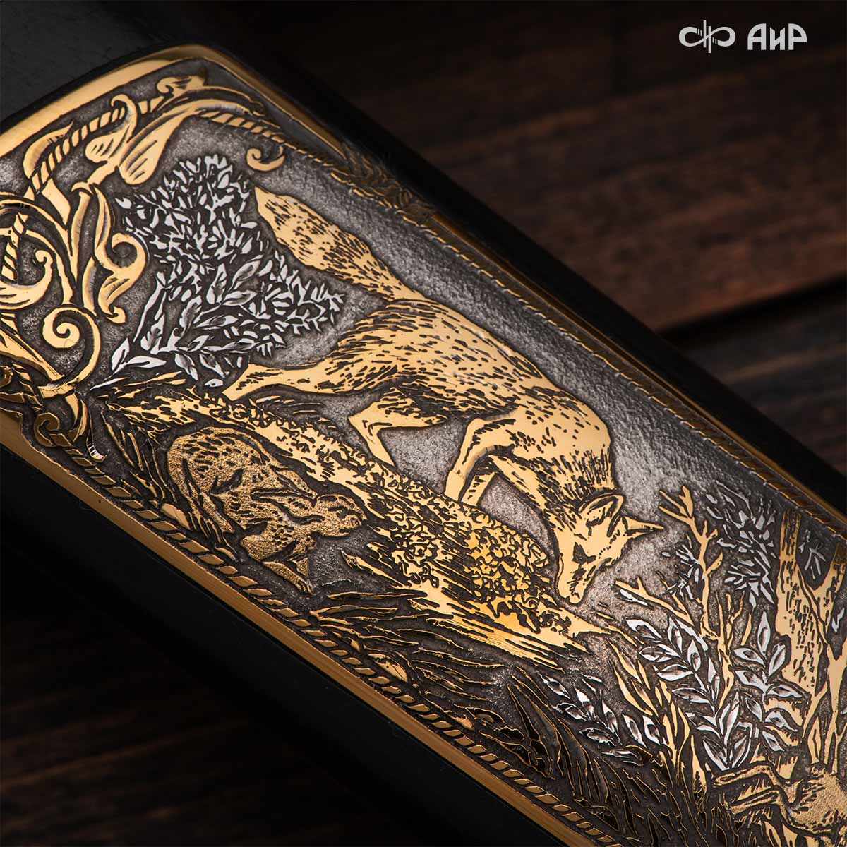 Опытные оружейники и художники Компании «АиР» учитывают особенности оружия, соразмеряя его украшение и практическое назначение ножа. Для охотников и туристов характерен некоторый консерватизм в восприятии художественных достоинств ножей. Поэтому излюбленными и наиболее удачными приемами украшения таких ножей остаются классические охотничьи мотивы, а разнообразие оформительских вариантов достигается за счет различных техник – травления, золочения, гравировки, то есть полного набора приемов создания златоустовской гравюры на металле.