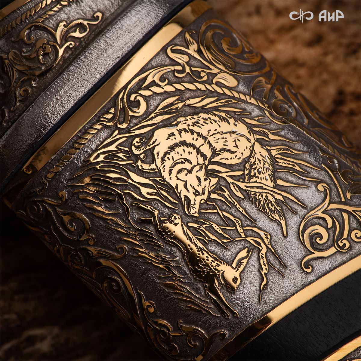 Красивый и функциональный нож, выбранный в качестве подарка, будет радовать владельца долгие годы. Сюжет рисунка на клинке и ножнах: "Лисья охота".