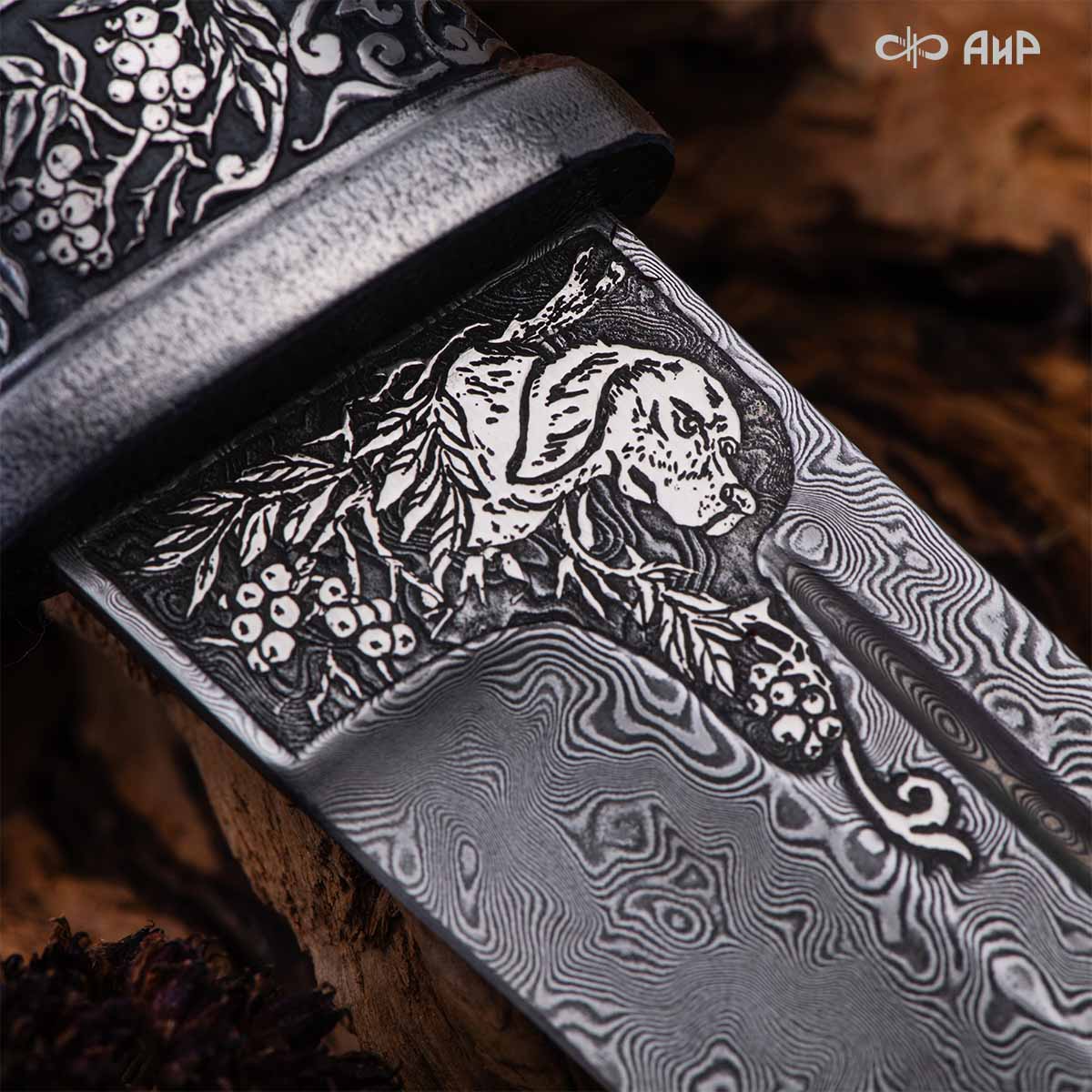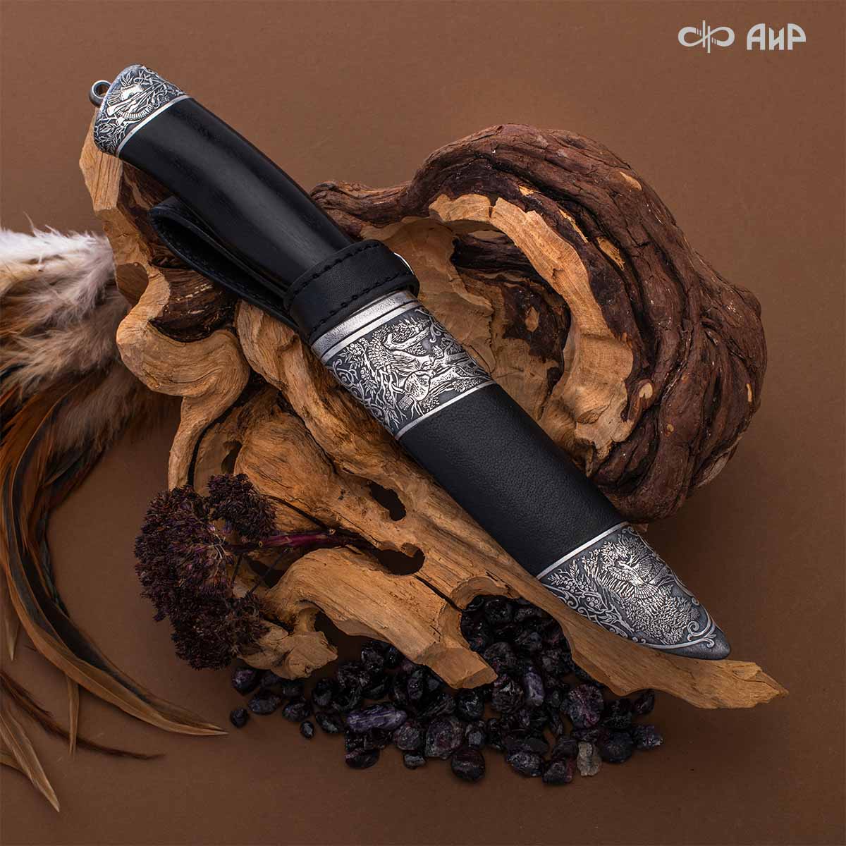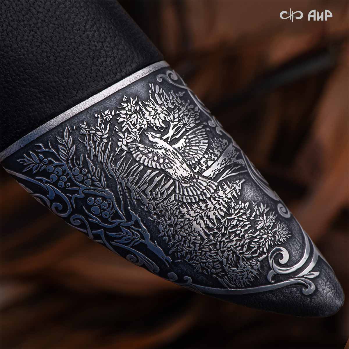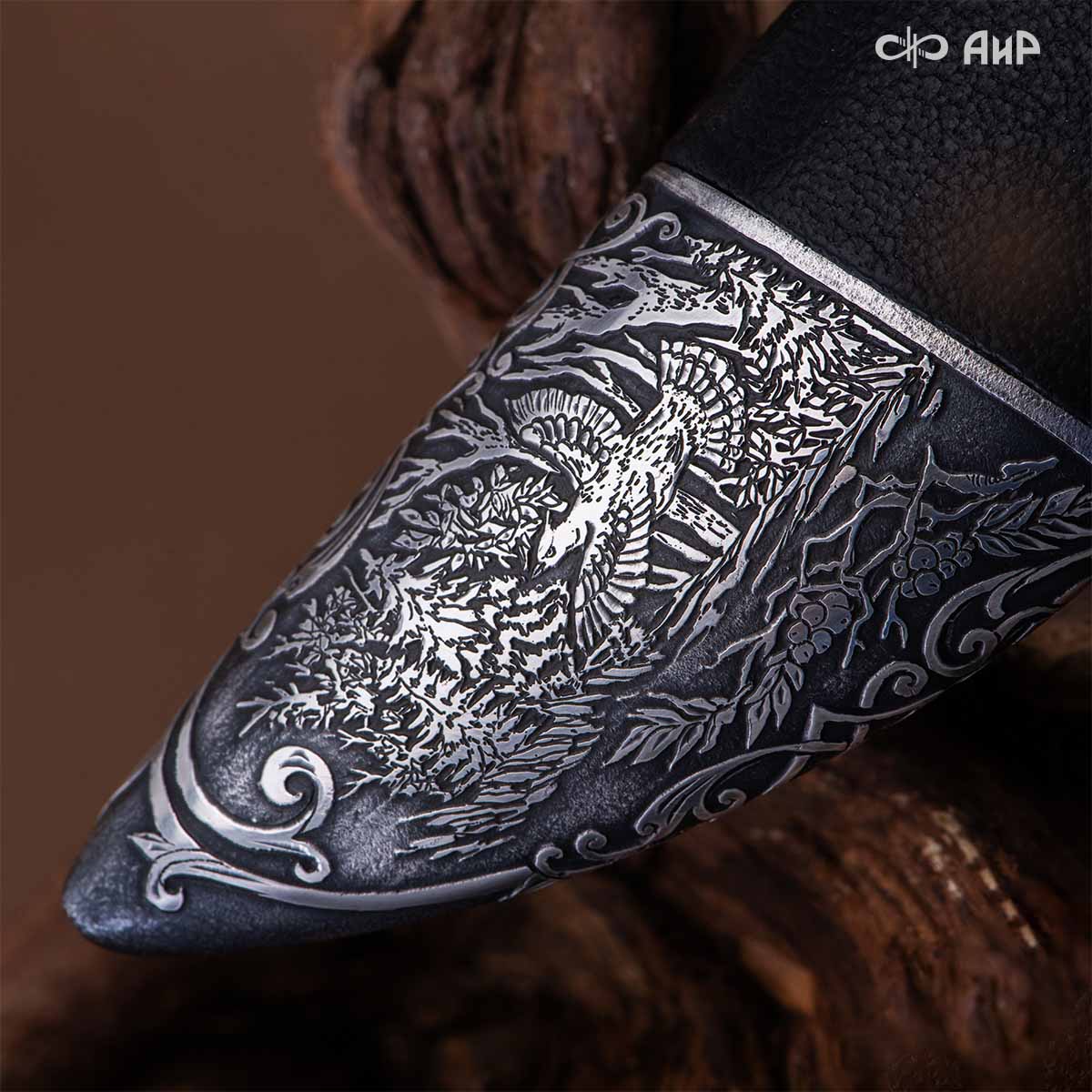 Нож в подарок ‒ сегодня вполне распространенное явление, особенно на дни рождения, юбилеи и другие знаменательные даты. Сюжет рисунка на клинке и ножнах: "Охота на глухаря".