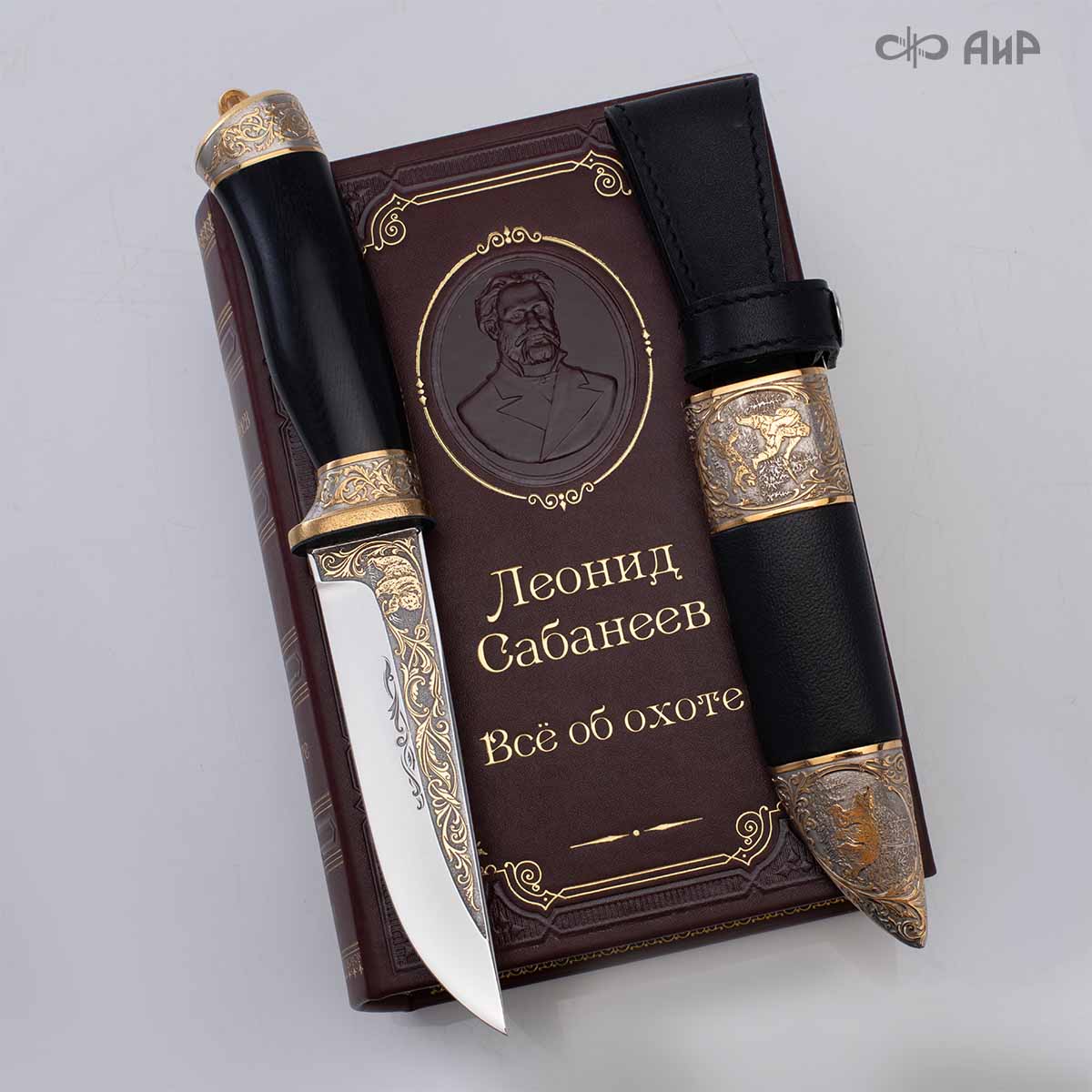 Подарочный нож "Лиса", изготовленный мастерами Компании «АиР», представляет собой удачное сочетание красоты и функциональности. Клинок изготовлен из стали 40Х10С2М. Рукоять выполнена из граба, тыльник и гарда ножа из латуни покрыты золотом и украшены растительным орнаментом. На клинке и комбинированных ножнах методом травления, золочения, гравировки нанесено изображение охотничьих сцен.