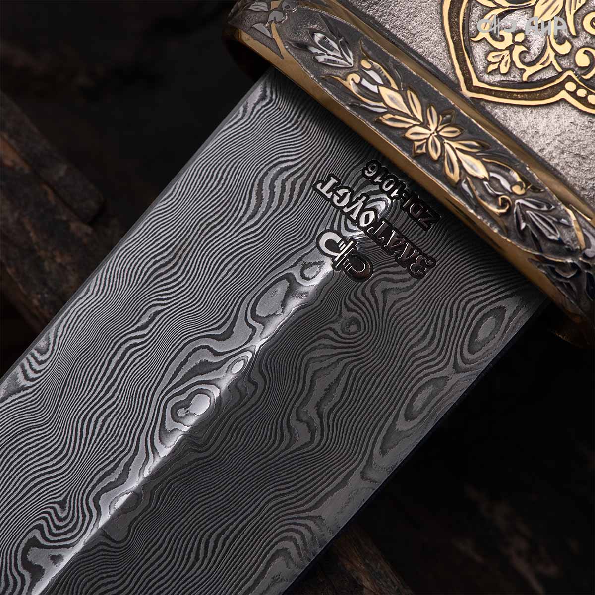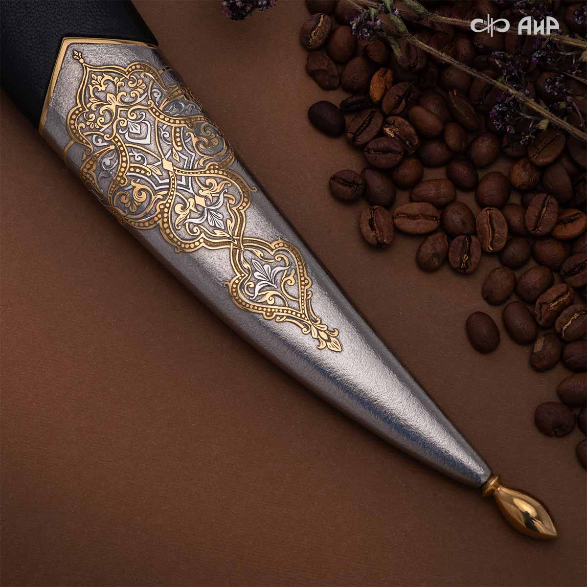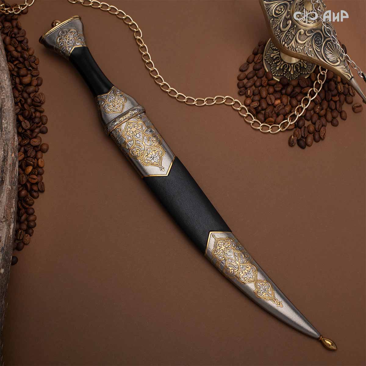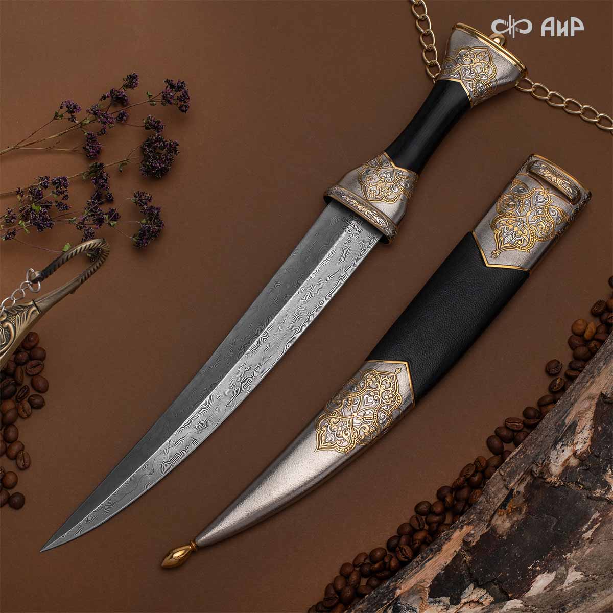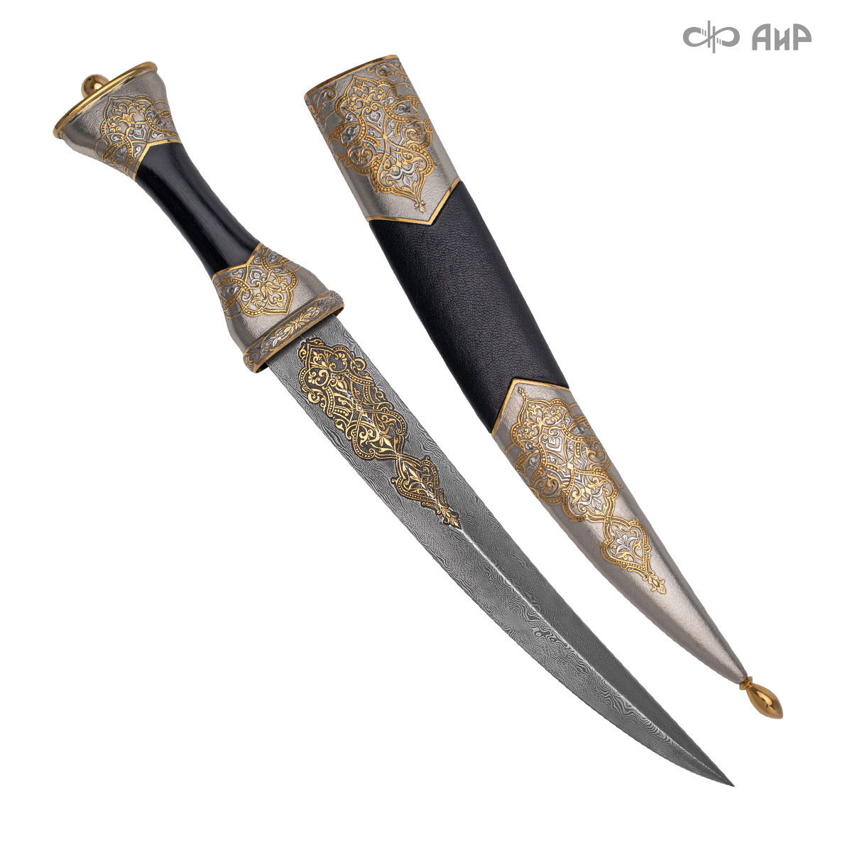 Украшенный золотом кинжал персидского типа из дамасской стали послужит харизматичным подарком для мужчины, который ценит холод стали и эстетику национального клинкового оружия.