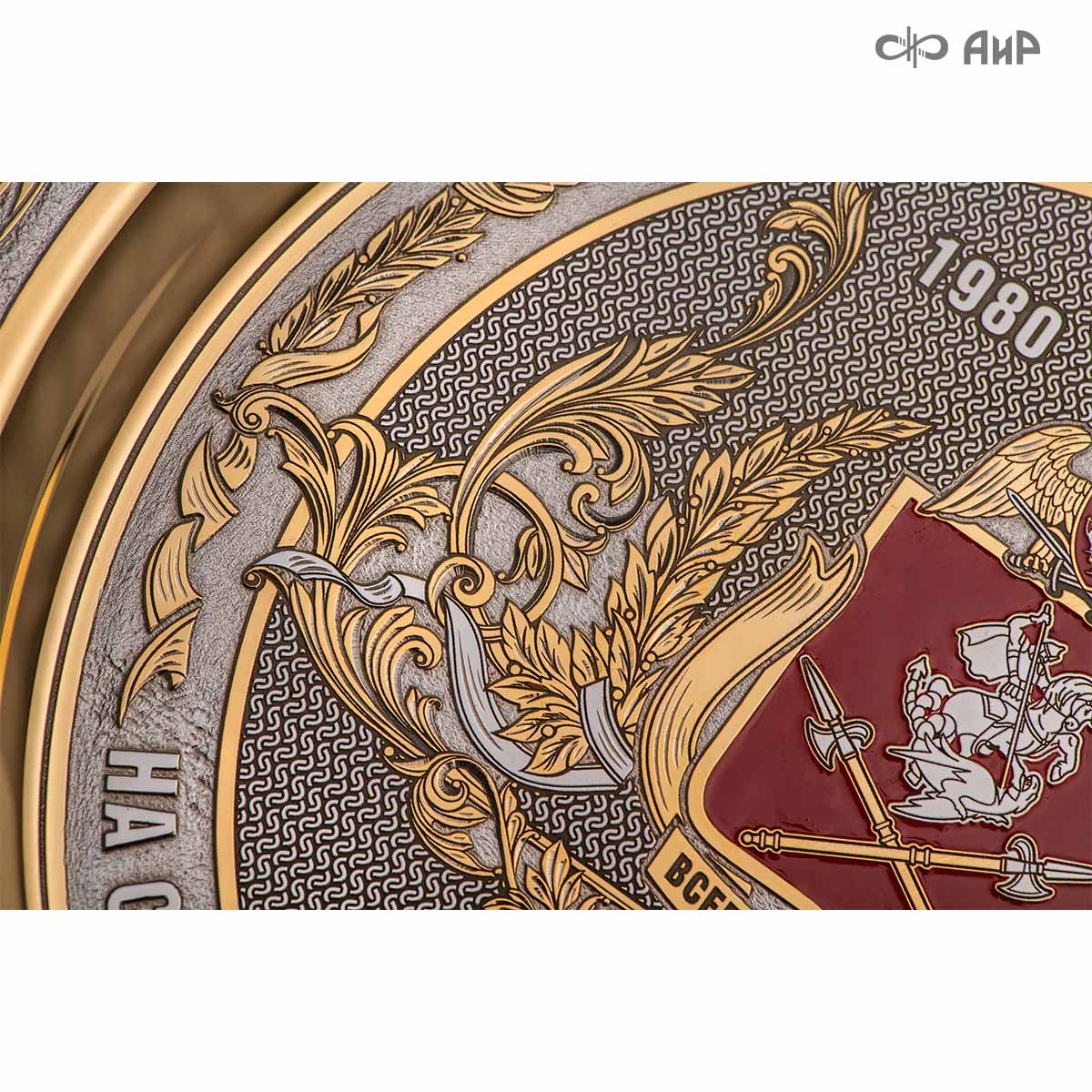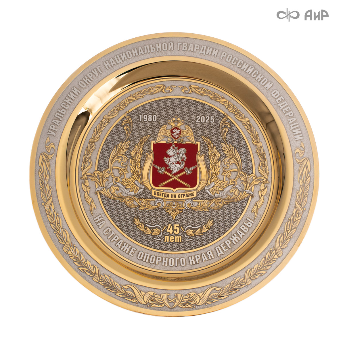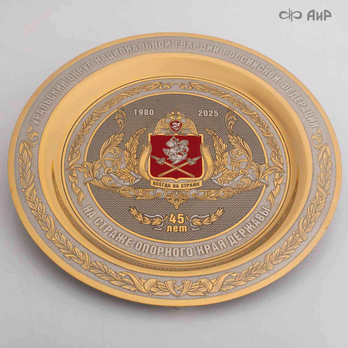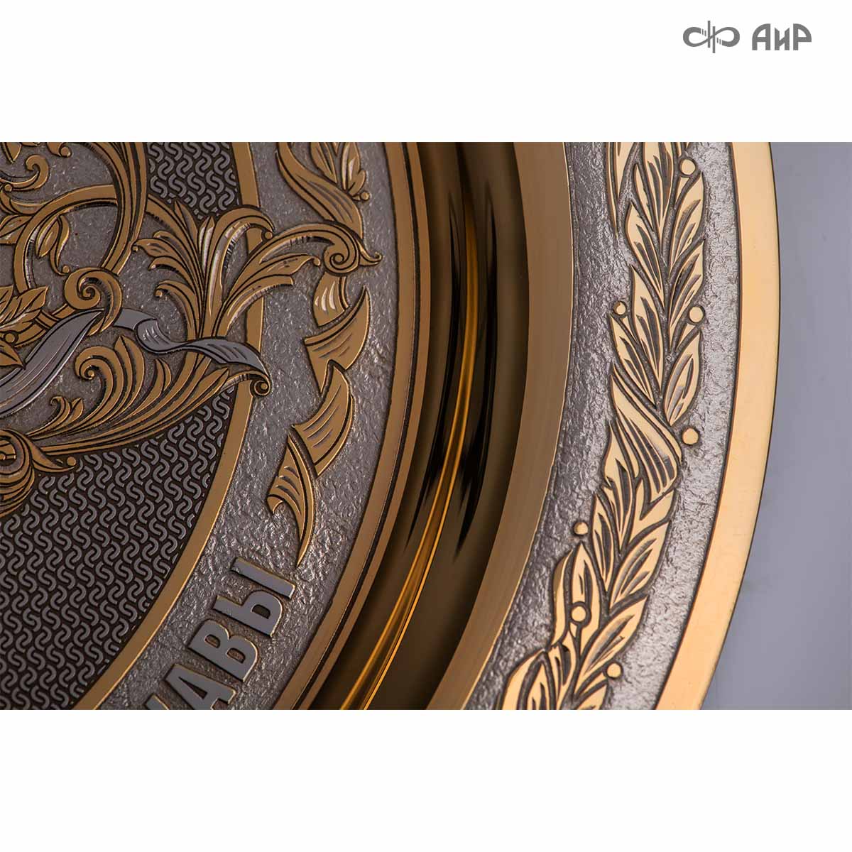 Тарель с нанесением поздравления, рисунка или корпоративной символики, выполненная в стиле златоустовской гравюры на металле, представляет собой практически не подверженное влиянию времени украшенное изделие. Это образец ручной работы мастеров Компании «АиР»: художника, гравера, гальваника, мастера-оружейника. Технологический процесс изготовления и украшения изделий из металла, существующий в Компании «АиР», практически не изменился за более чем 200 лет с момента зарождения искусства гравюры на металле.
