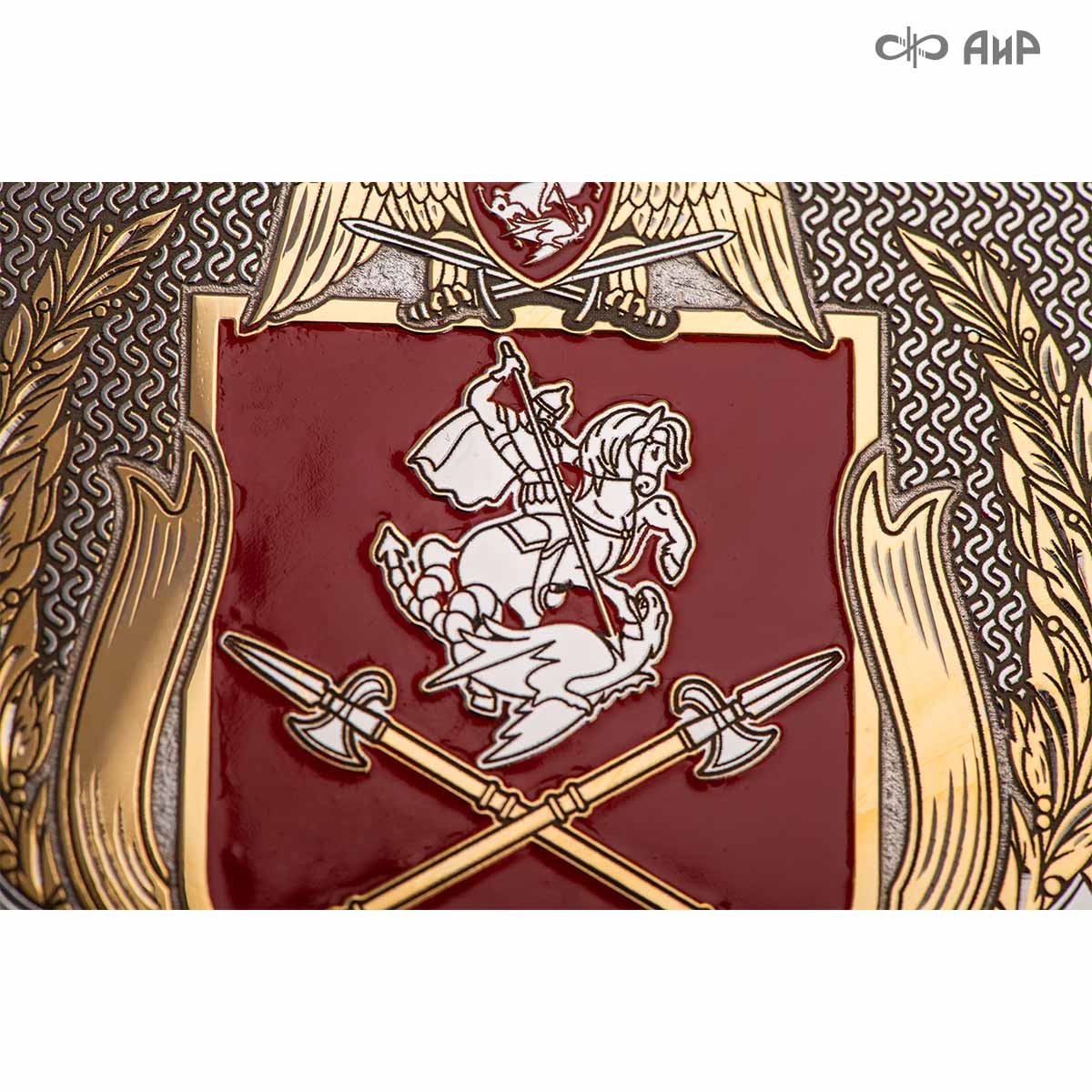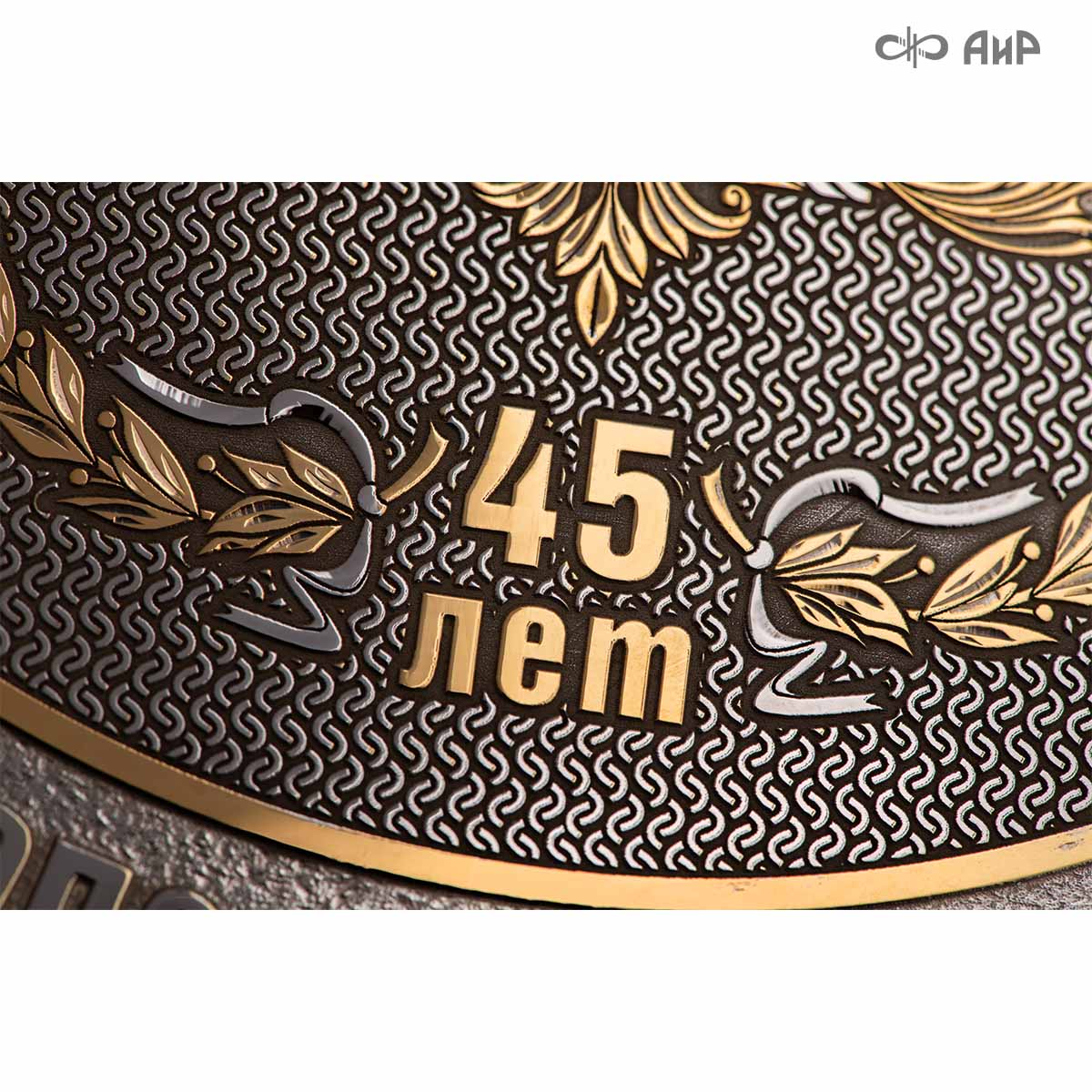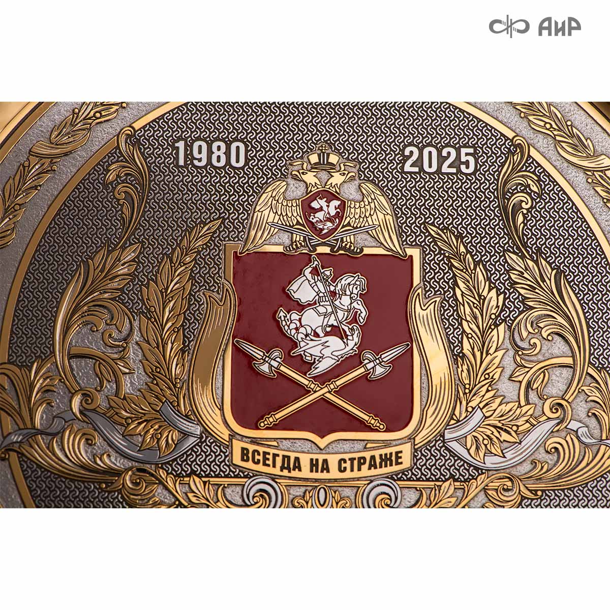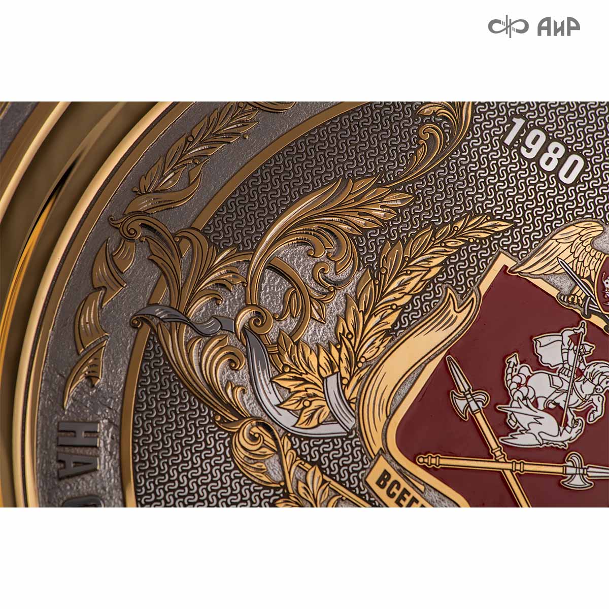 Тарель с нанесением поздравления, рисунка или корпоративной символики, выполненная в стиле златоустовской гравюры на металле, представляет собой практически не подверженное влиянию времени украшенное изделие. Это образец ручной работы мастеров Компании «АиР»: художника, гравера, гальваника, мастера-оружейника. Технологический процесс изготовления и украшения изделий из металла, существующий в Компании «АиР», практически не изменился за более чем 200 лет с момента зарождения искусства гравюры на металле.