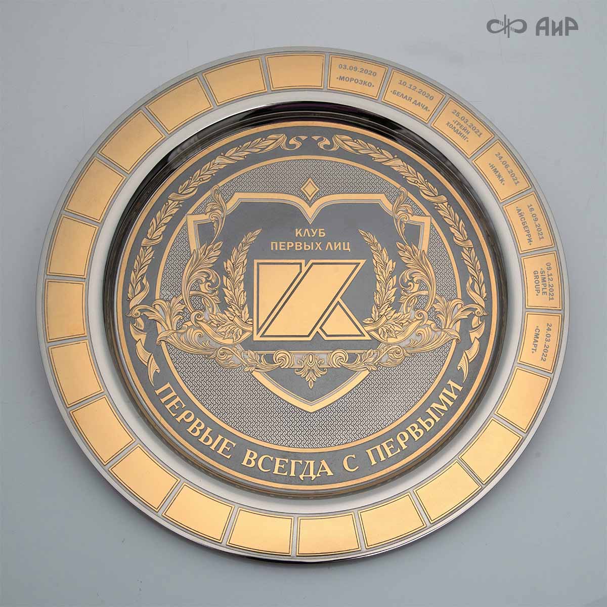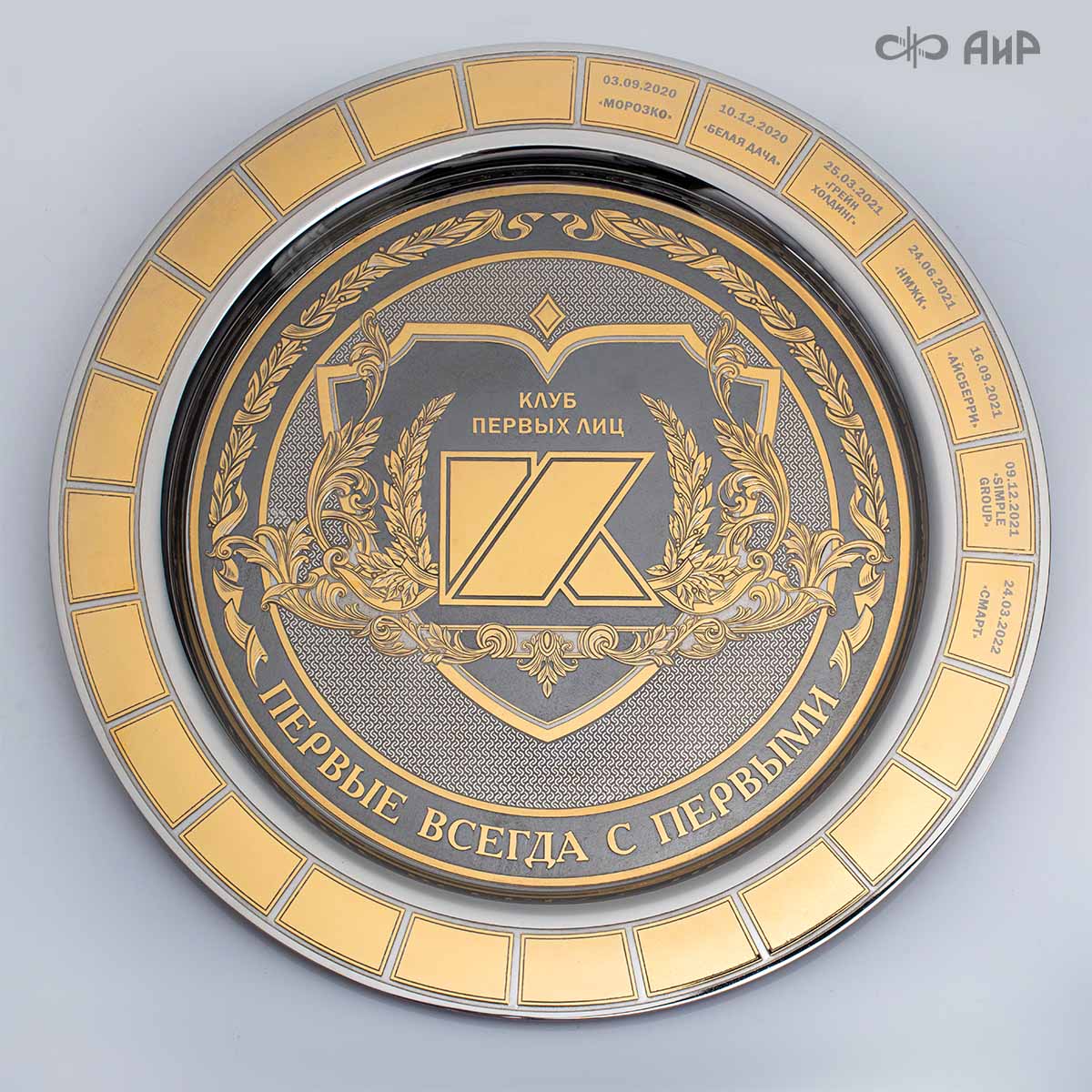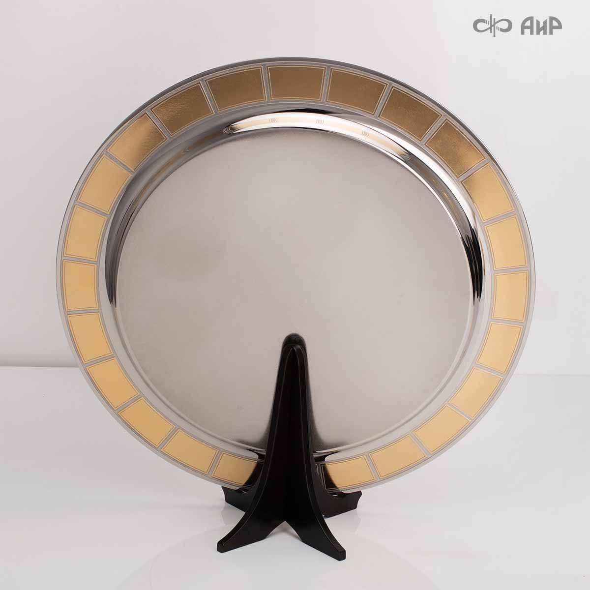 Тарель с нанесением поздравления, рисунка или корпоративной символики, выполненная в стиле златоустовской гравюры на металле, представляет собой практически не подверженное влиянию времени украшенное изделие. Это образец ручной работы мастеров Компании «АиР»: художника, гравера, гальваника, мастера-оружейника. Технологический процесс изготовления и украшения изделий из металла, существующий в Компании «АиР», практически не изменился за более чем 200 лет с момента зарождения искусства гравюры на металле.