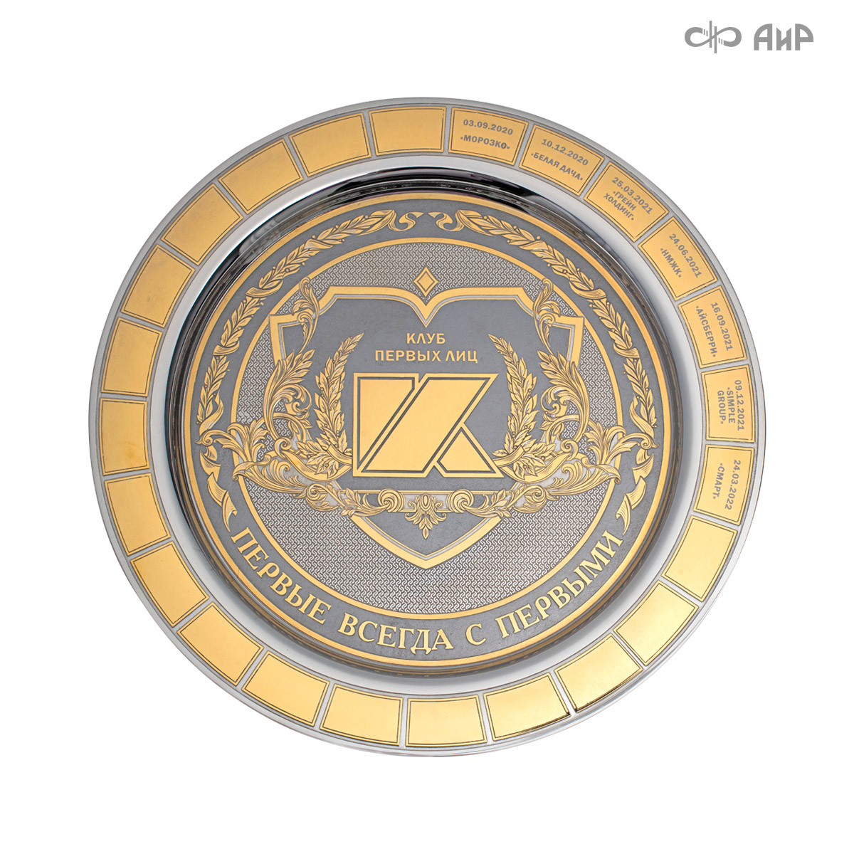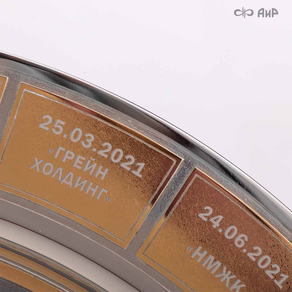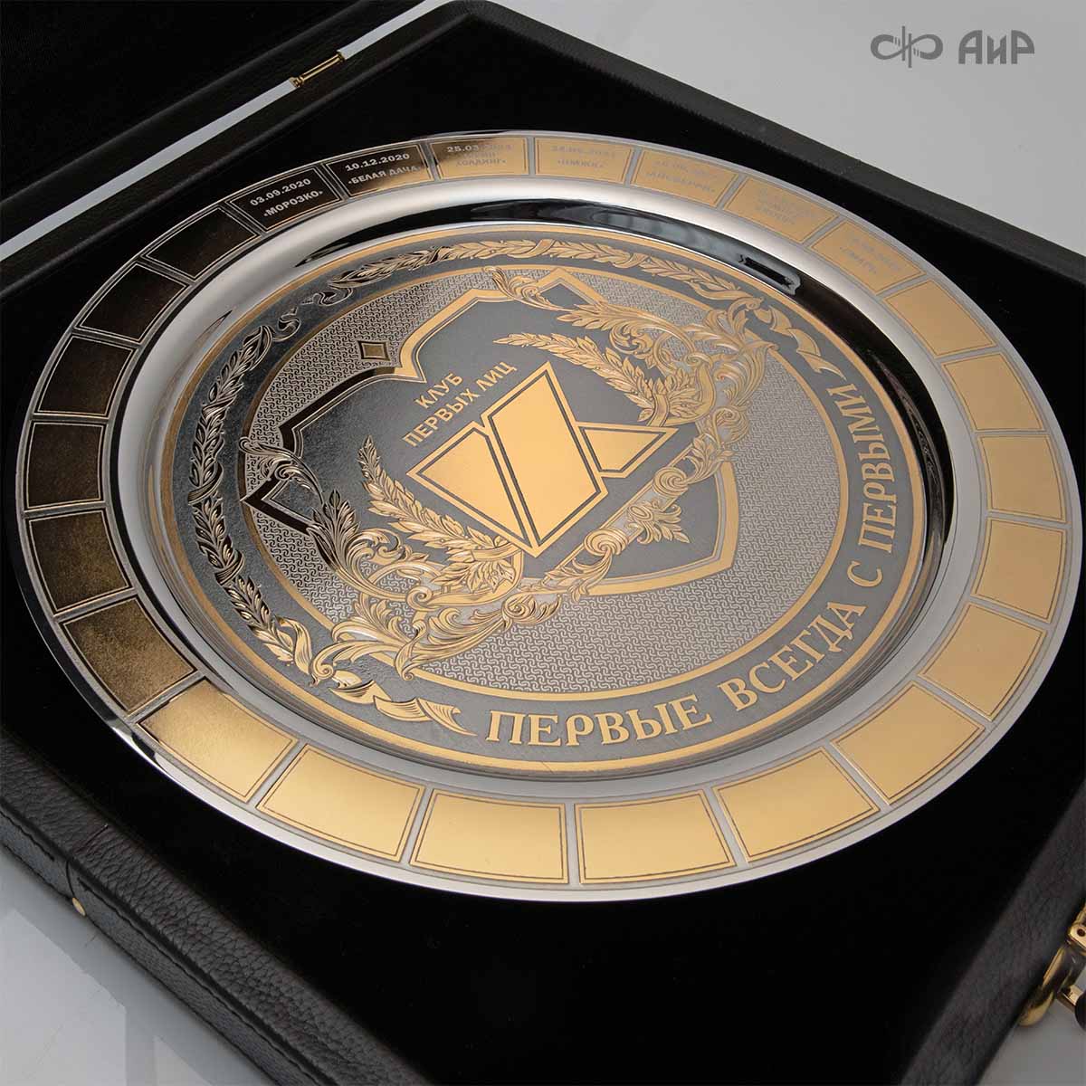 Тарель с нанесением поздравления, рисунка или корпоративной символики, выполненная в стиле златоустовской гравюры на металле, представляет собой практически не подверженное влиянию времени украшенное изделие. Это образец ручной работы мастеров Компании «АиР»: художника, гравера, гальваника, мастера-оружейника. Технологический процесс изготовления и украшения изделий из металла, существующий в Компании «АиР», практически не изменился за более чем 200 лет с момента зарождения искусства гравюры на металле.