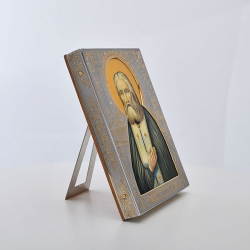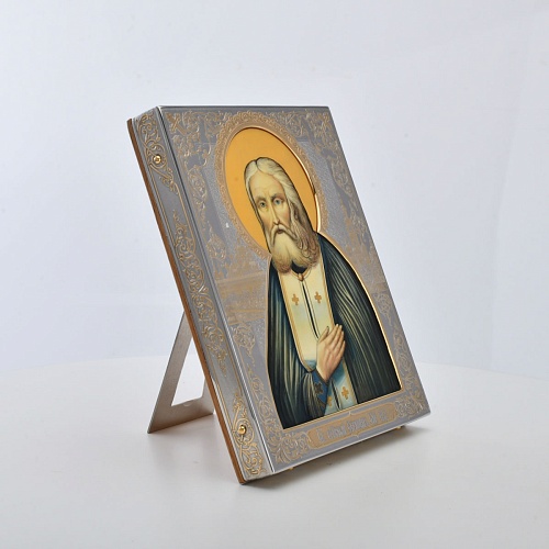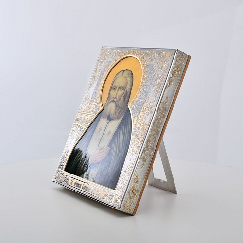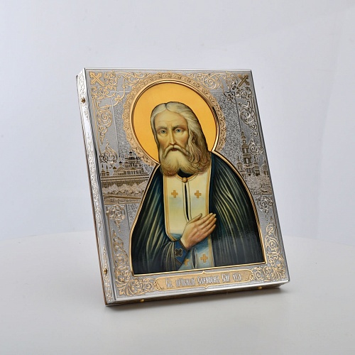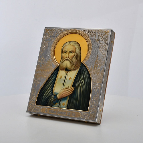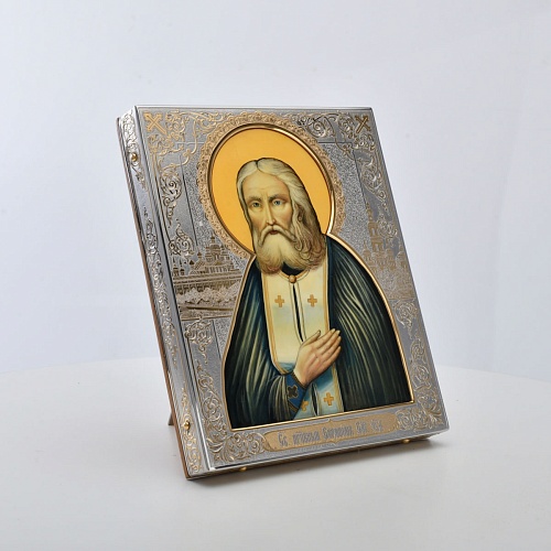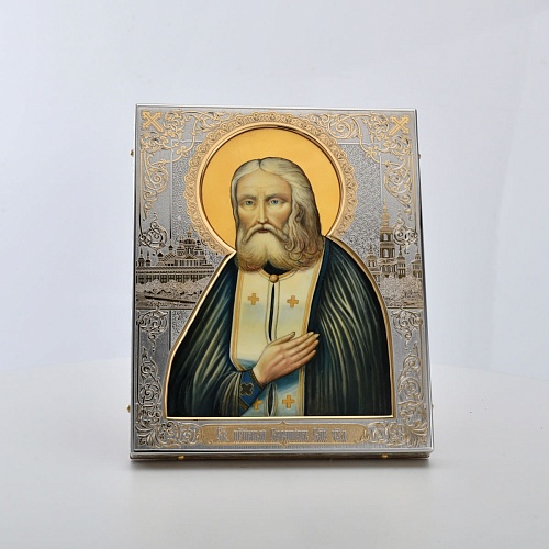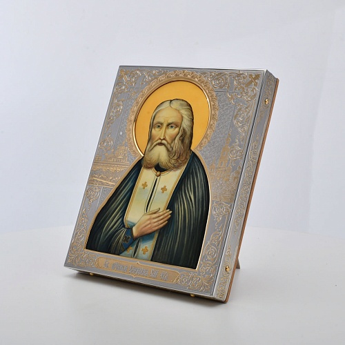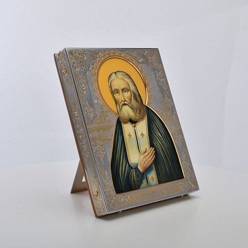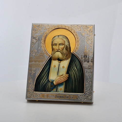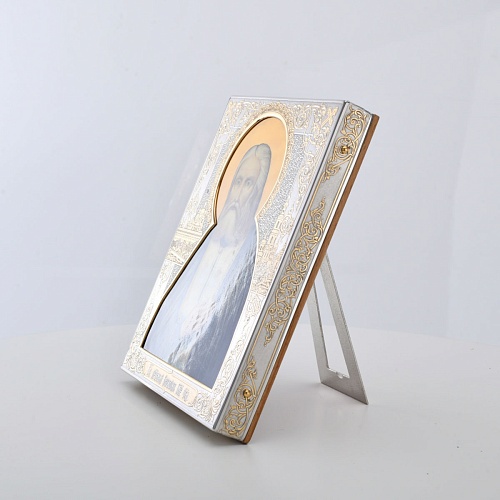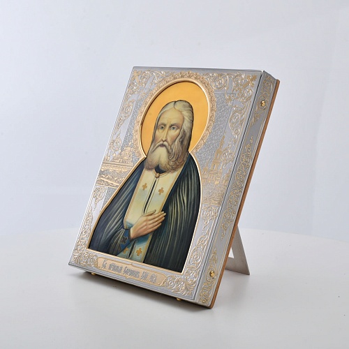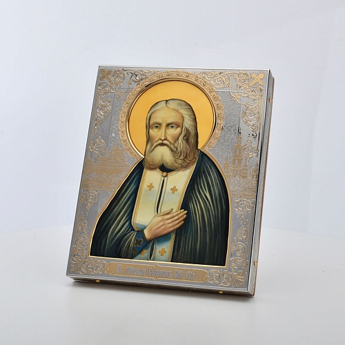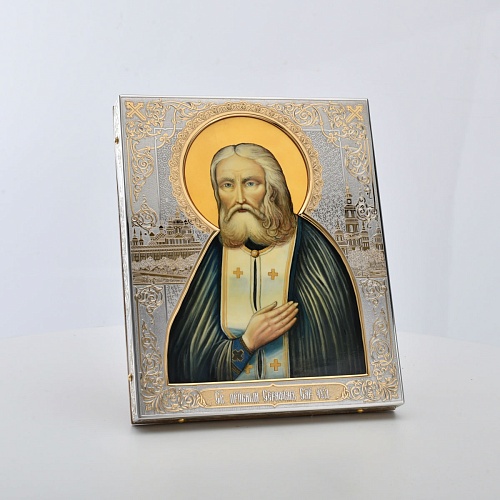 Православные верят, что искренняя молитва батюшке Серафиму перед иконой помогает во всех благих делах. Чаще всего его просят о душевной стойкости, обретении равновесия, смирении перед обстоятельствами и, конечно, об исцелении, потому что еще при жизни по молитвам преподобного Серафима излечивались тяжелобольные. Он известен как “скорый помощник”, то есть святой, который явно и скоро отвечает на молитвы верующих. Икону Преподобного Серафима Саровского можно поставить на полочку сбоку или снизу по отношению к центральным образам Богородицы и Иисуса Христа. Оклад иконы с любовью и мастерством выполнен в компании “АиР” г. Златоуст. Покрытый золотом высшей пробы (999,9°) толщиной 1 микрон, оклад идеально дополняет образ святого, подчеркивая его Божественное значение и вечную ценность. Эта икона станет не только предметом поклонения, но и символом духовного просвещения и надежды для каждого, кто обратится к Преподобному Серафиму Саровскому.