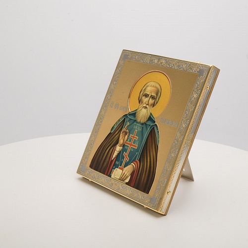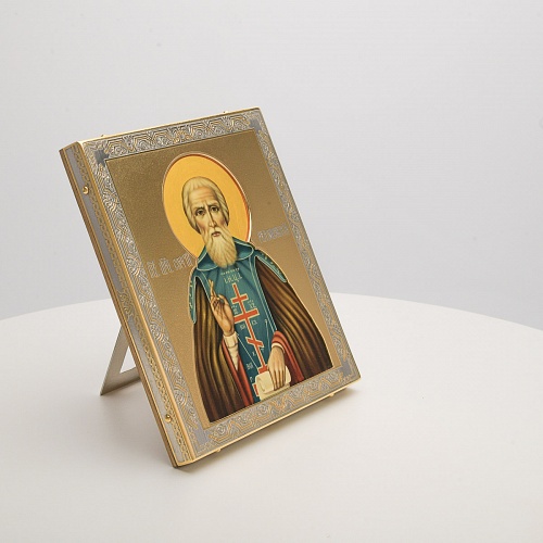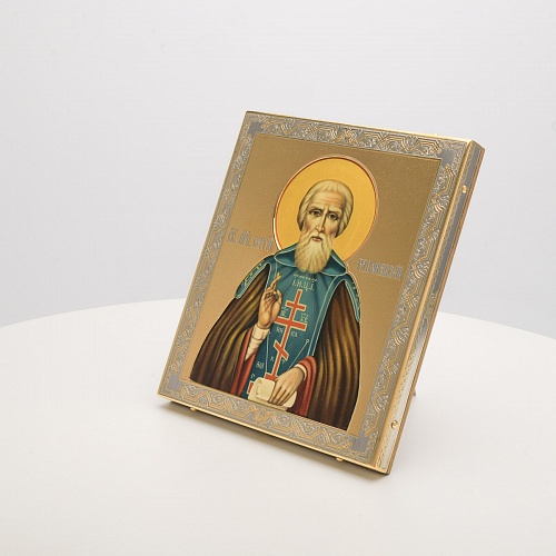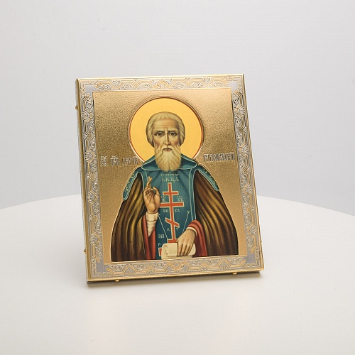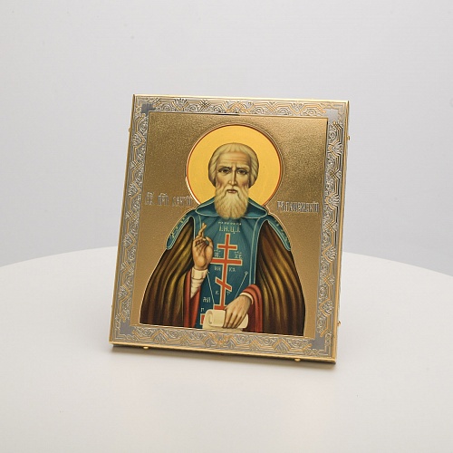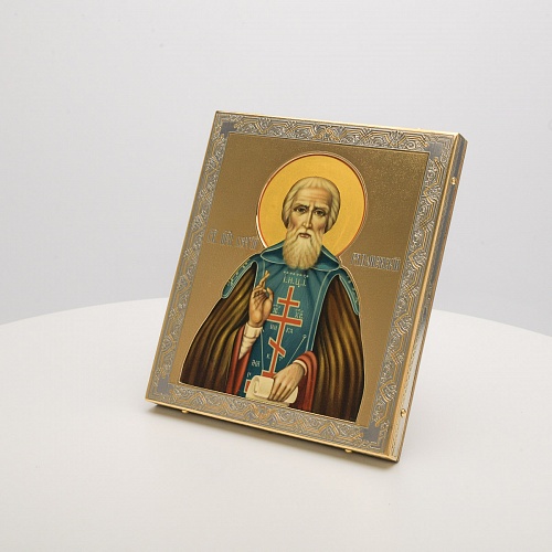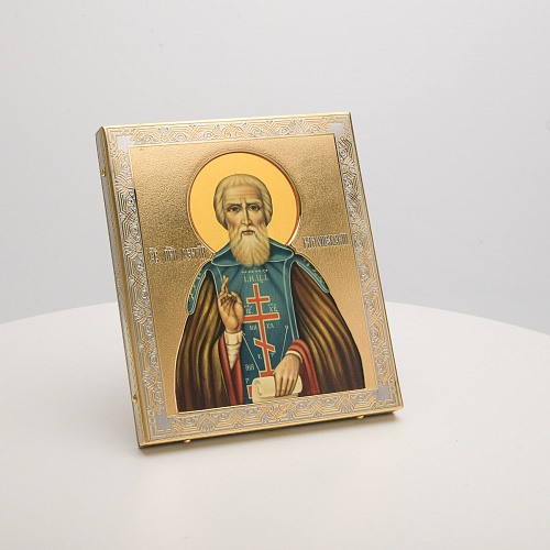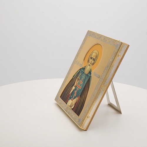 Икона Преподобного Сергия Радонежского представляет собой образ святого, который почитается как один из величайших духовных наставников и основателей монашества в России. На иконе Сергий изображен в монашеском одеянии, с длинной бородой и строгим, но добрым выражением лица. Его глаза излучают мудрость и спокойствие, а руки сложены в молитвенном жесте, символизируя его глубокую веру и преданность Богу.