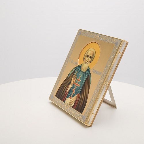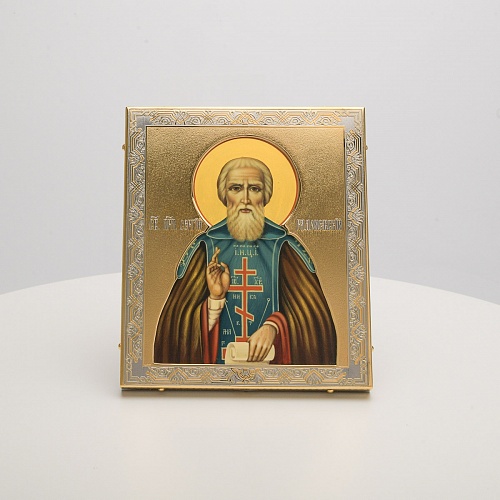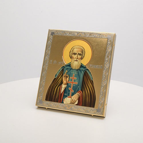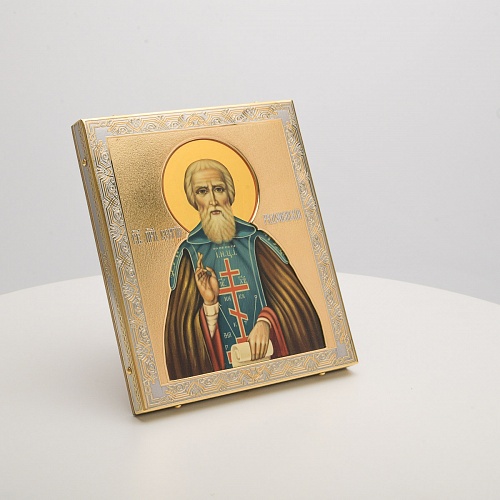 Фон иконы обычно выполнен в золотистых тонах, что подчеркивает святость и божественное происхождение изображенного. Вокруг головы святого часто изображается нимб, символизирующий его святость и духовное просветление. В некоторых вариантах иконы Сергий держит в руках свиток или крест, что указывает на его роль как учителя и наставника.