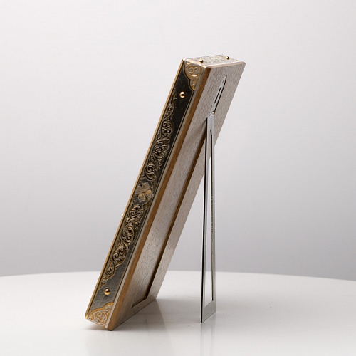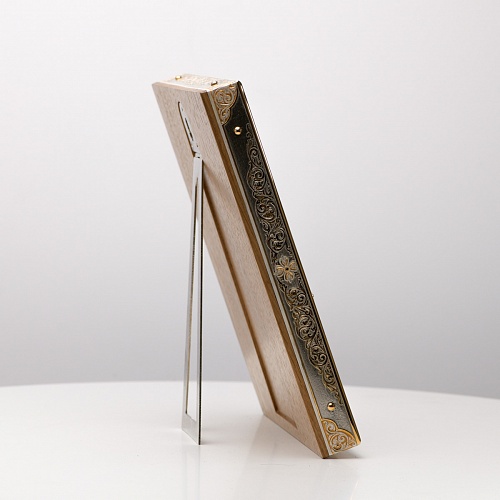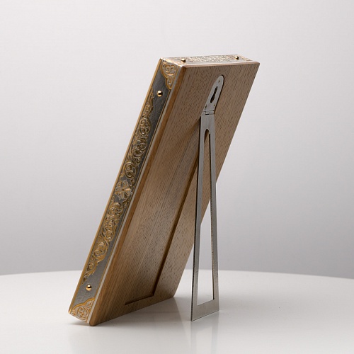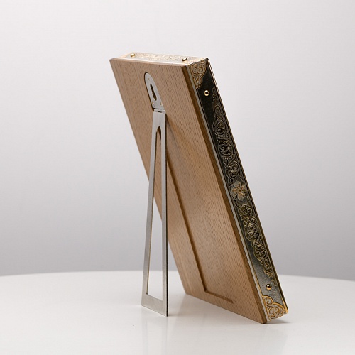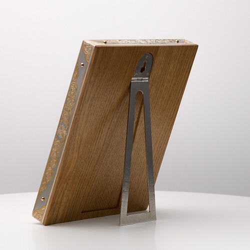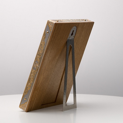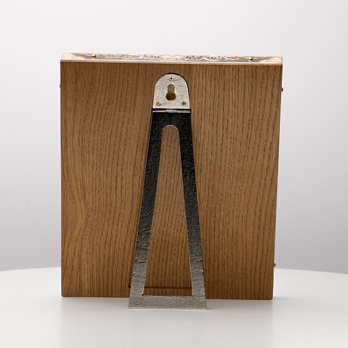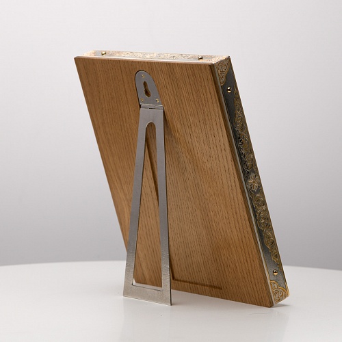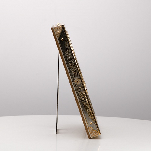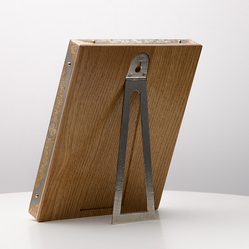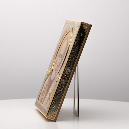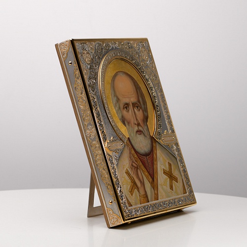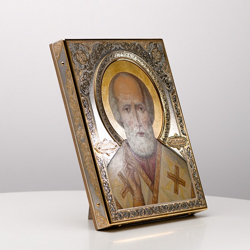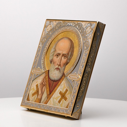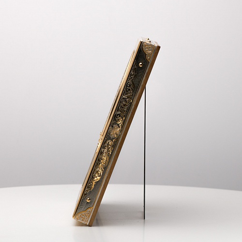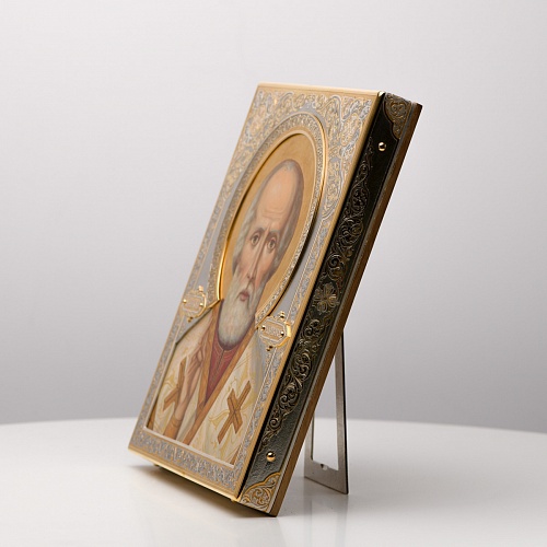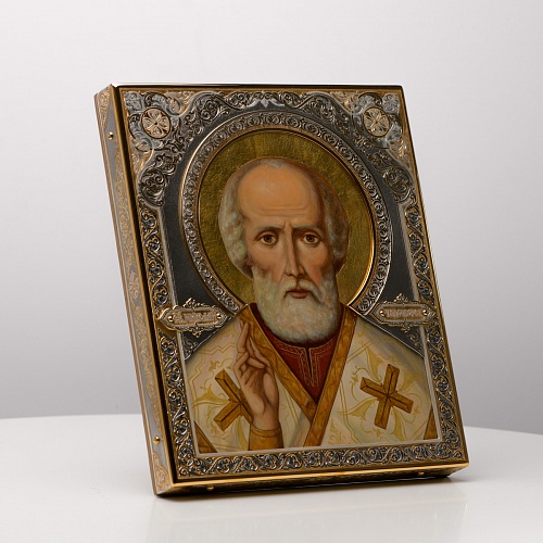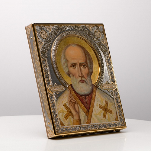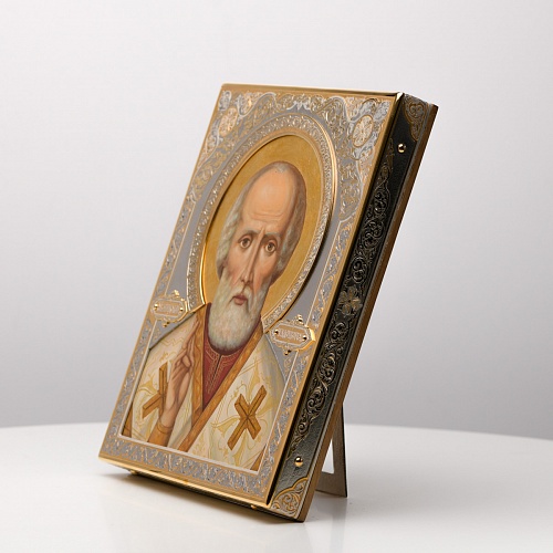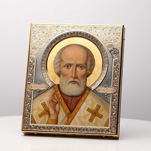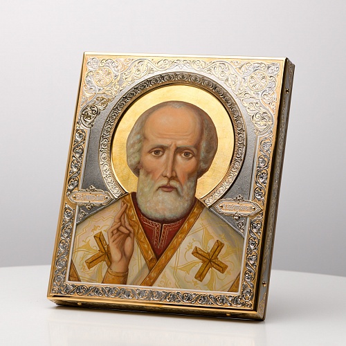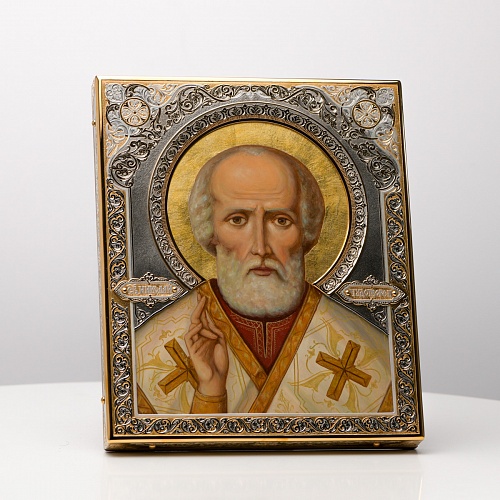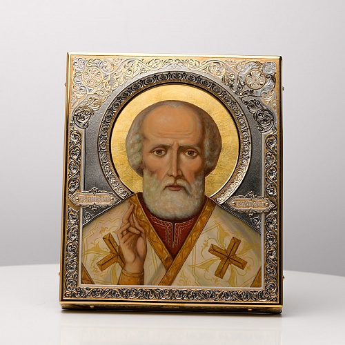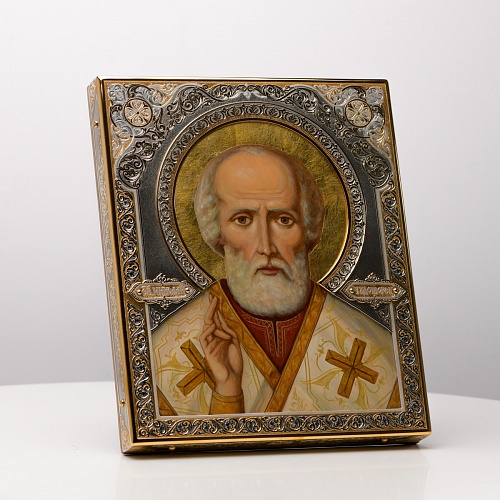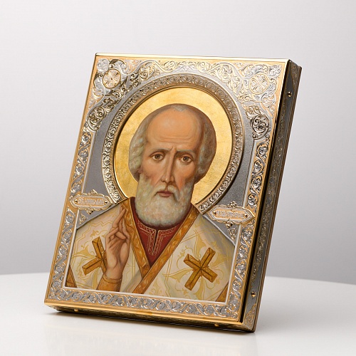 Оклад иконы Святителя Николая Чудотворца, выполненный мастерами компании “АиР” в г. Златоуст, придает ей особую ценность и торжественность. Оклад покрыт золотом высшей пробы (999,9°) толщиной в 1 микрон, что подчеркивает высокое мастерство и искусство создателей. Золотое покрытие не только украшает икону, но и символизирует вечность и непреходящую ценность духовного наследия. Оно защищает икону от внешних воздействий и придает ей дополнительное сияние, усиливая впечатление от образа святого. Такой оклад делает икону не только объектом религиозного почитания, но и произведением искусства, достойным восхищения и уважения.