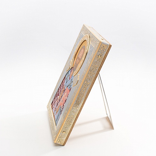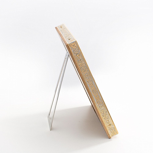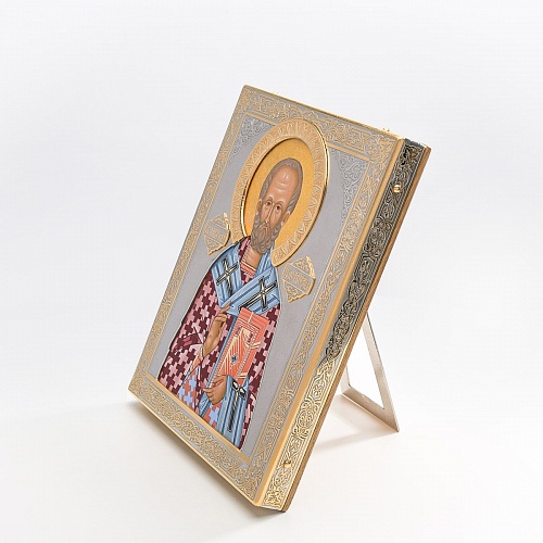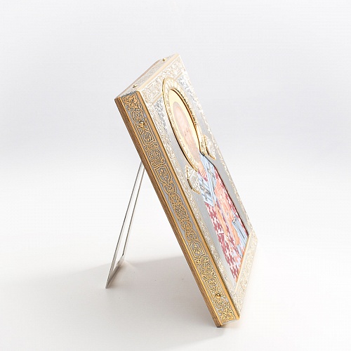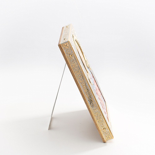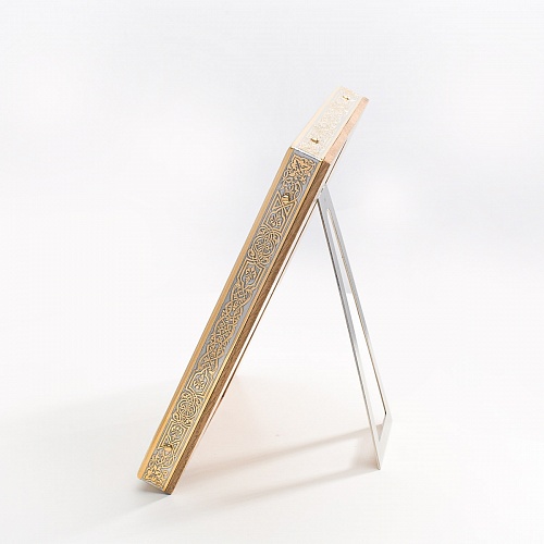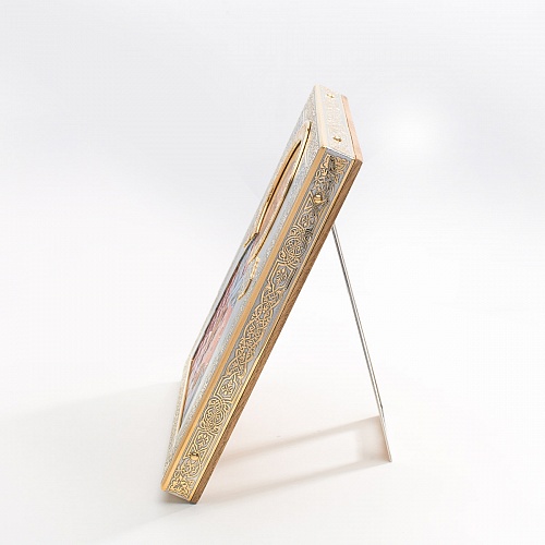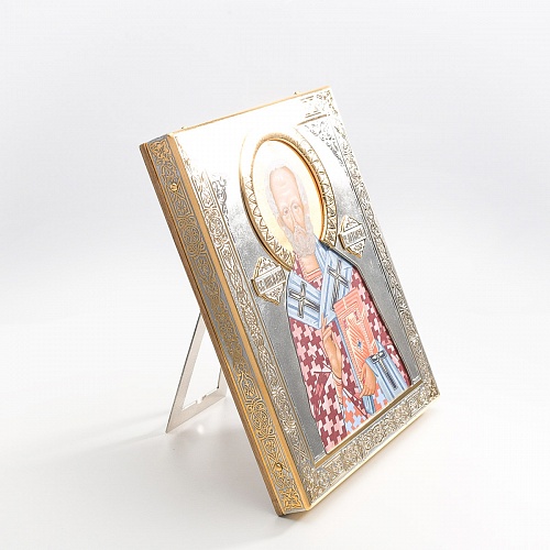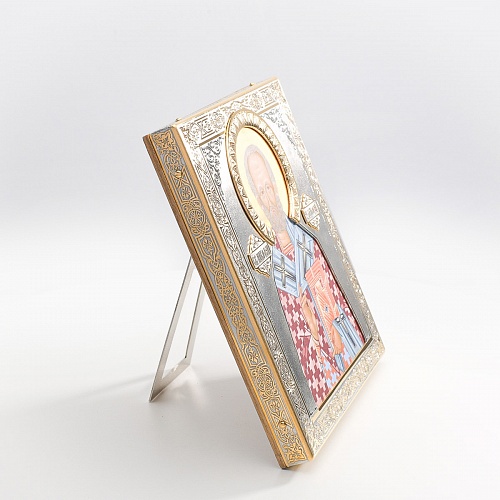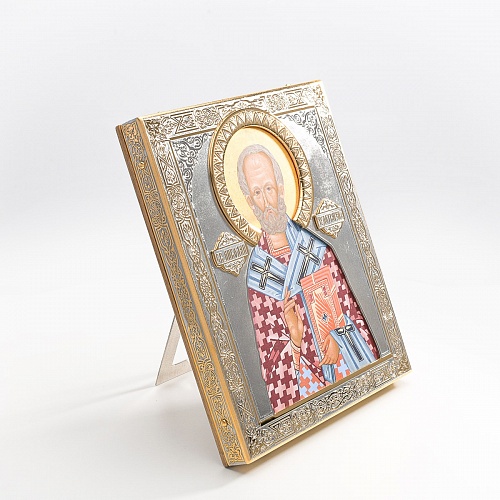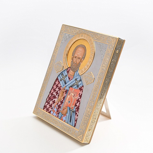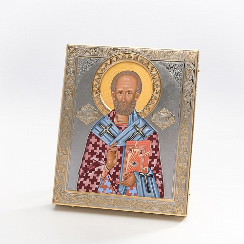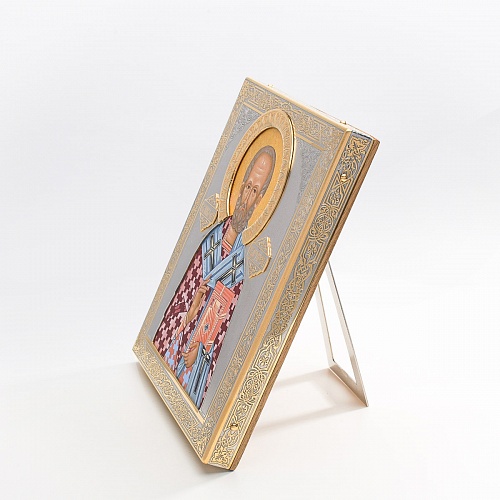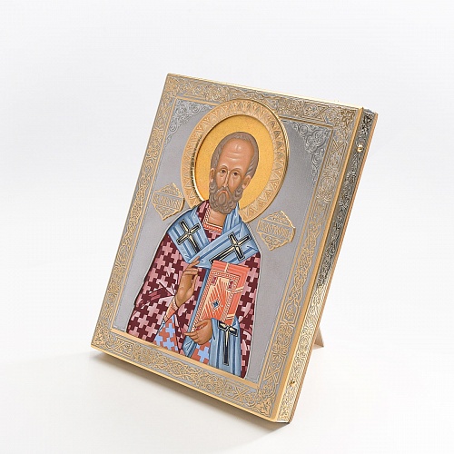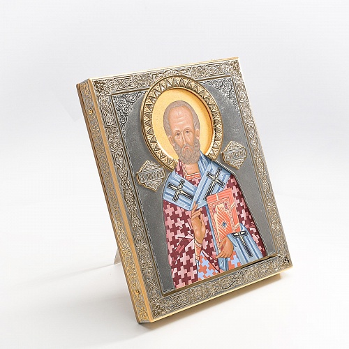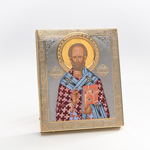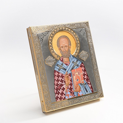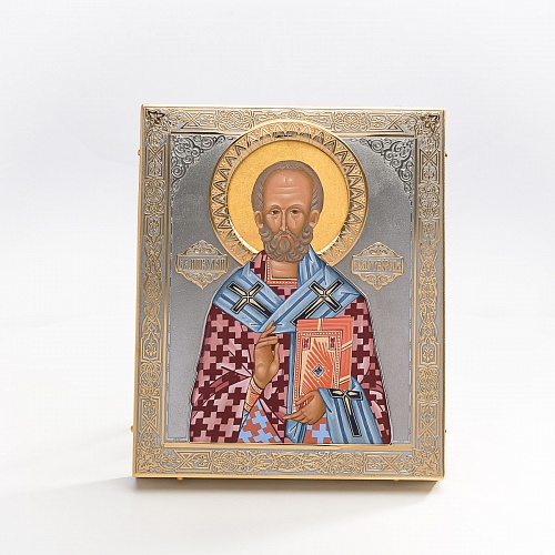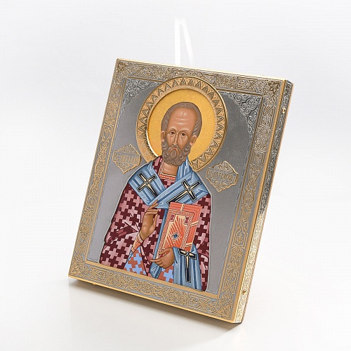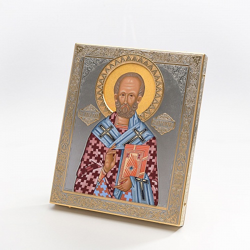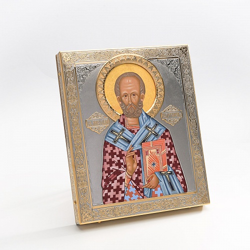 Оклад иконы Святителя Николая Чудотворца, выполненный мастерами компании “АиР” в г. Златоуст, придает ей особую ценность и торжественность. Оклад покрыт золотом высшей пробы (999,9°) толщиной в 1 микрон, что подчеркивает высокое мастерство и искусство создателей. Золотое покрытие не только украшает икону, но и символизирует вечность и непреходящую ценность духовного наследия. Оно защищает икону от внешних воздействий и придает ей дополнительное сияние, усиливая впечатление от образа святого. Такой оклад делает икону не только объектом религиозного почитания, но и произведением искусства, достойным восхищения и уважения.
