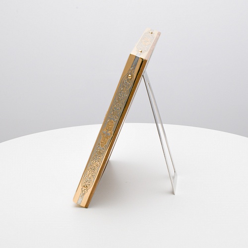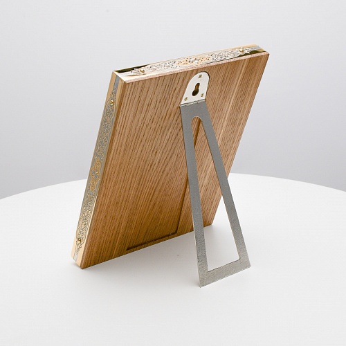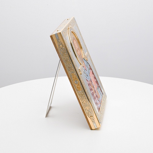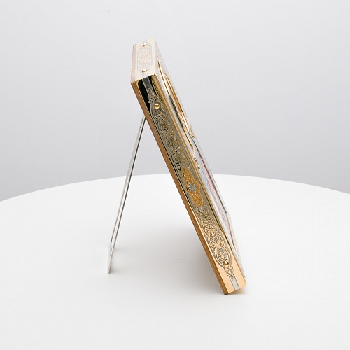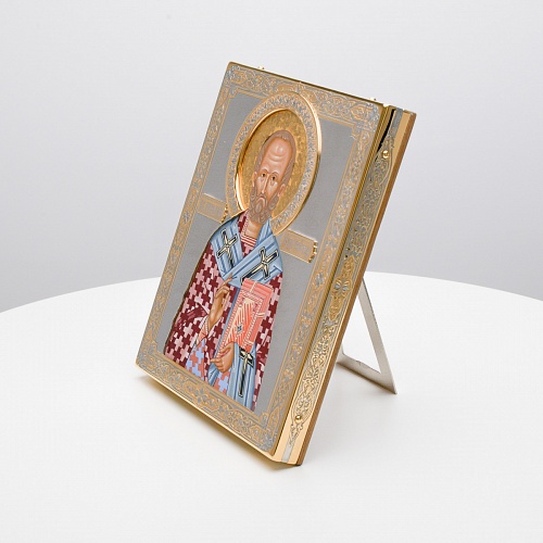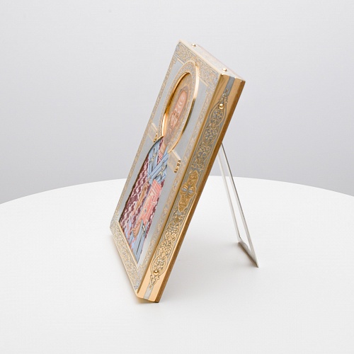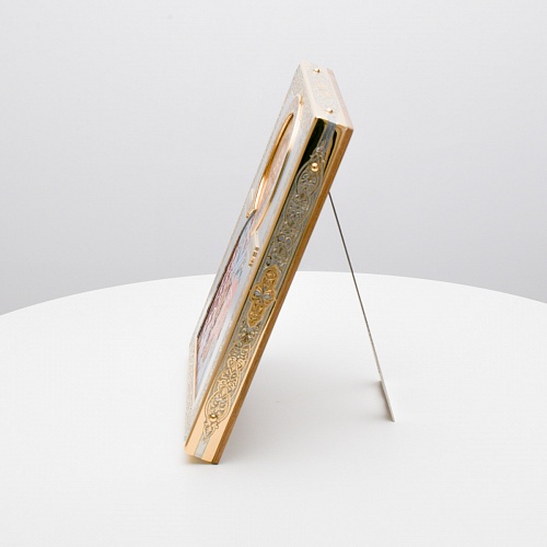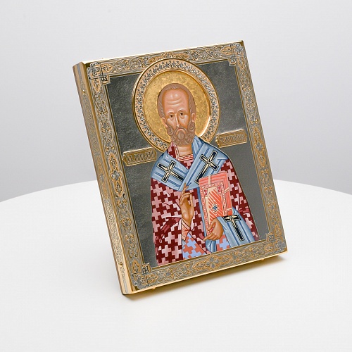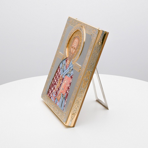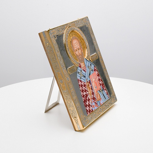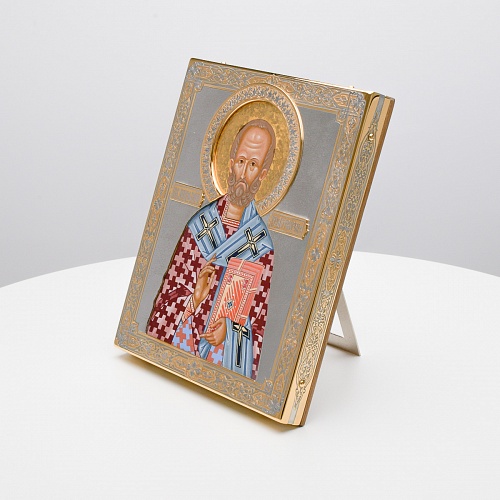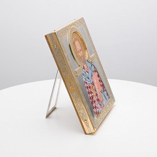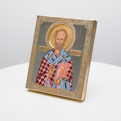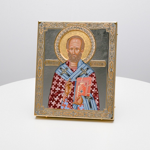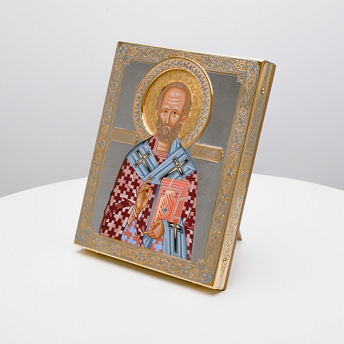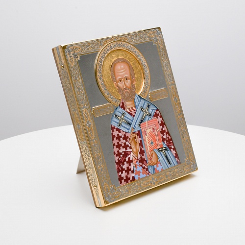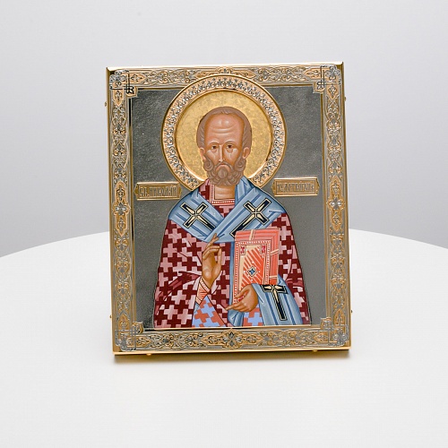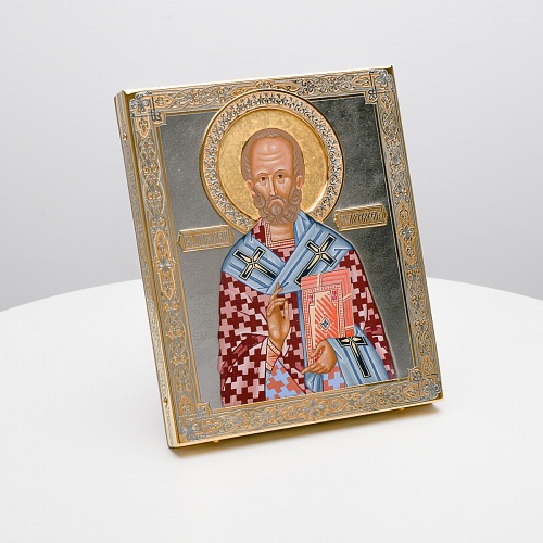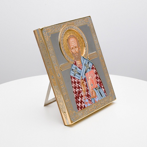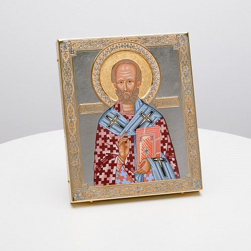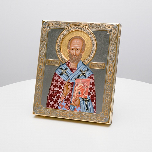 Оклад иконы Святителя Николая Чудотворца, выполненный мастерами компании “АиР” в г. Златоуст, придает ей особую ценность и торжественность. Оклад покрыт золотом высшей пробы (999,9°) толщиной в 1 микрон, что подчеркивает высокое мастерство и искусство создателей. Золотое покрытие не только украшает икону, но и символизирует вечность и непреходящую ценность духовного наследия. Оно защищает икону от внешних воздействий и придает ей дополнительное сияние, усиливая впечатление от образа святого. Такой оклад делает икону не только объектом религиозного почитания, но и произведением искусства, достойным восхищения и уважения.