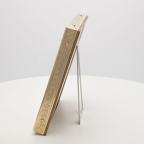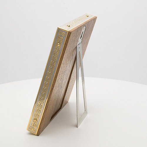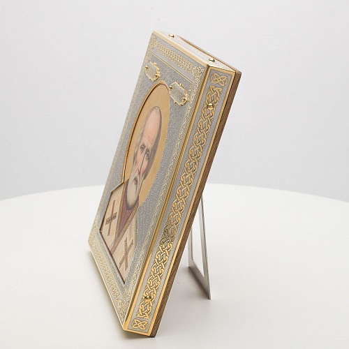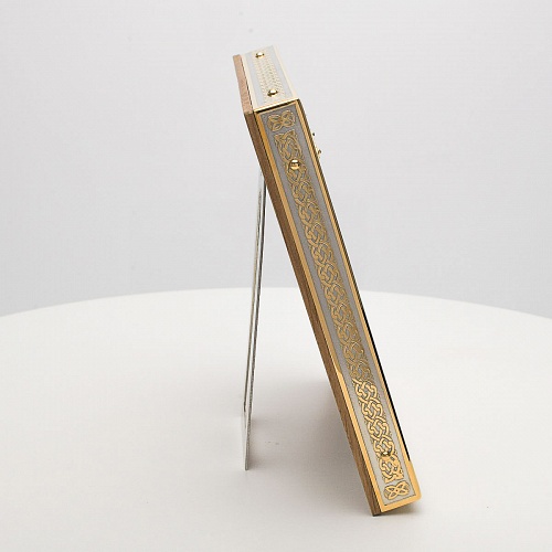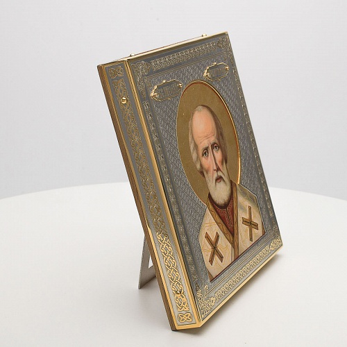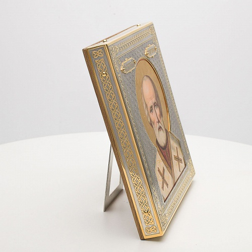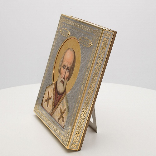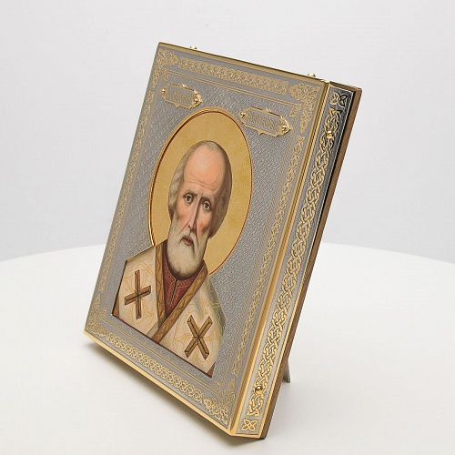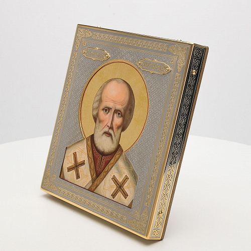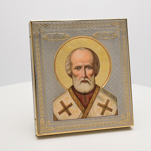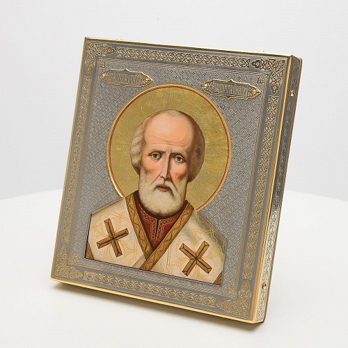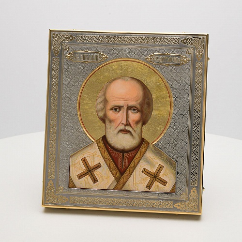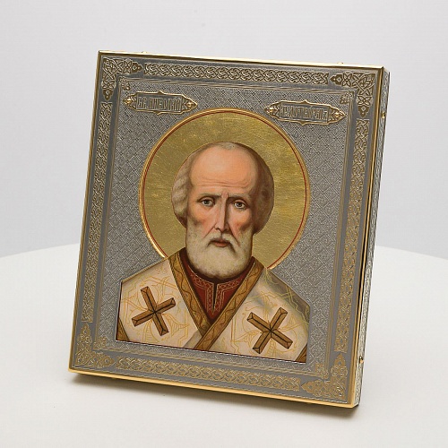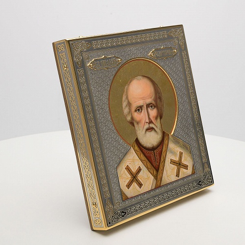 Оклад иконы Святителя Николая Чудотворца, выполненный мастерами компании “АиР” в г. Златоуст, придает ей особую ценность и торжественность. Оклад покрыт золотом высшей пробы (999,9°) толщиной в 1 микрон, что подчеркивает высокое мастерство и искусство создателей. Золотое покрытие не только украшает икону, но и символизирует вечность и непреходящую ценность духовного наследия. Оно защищает икону от внешних воздействий и придает ей дополнительное сияние, усиливая впечатление от образа святого. Такой оклад делает икону не только объектом религиозного почитания, но и произведением искусства, достойным восхищения и уважения.