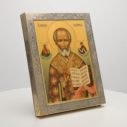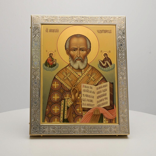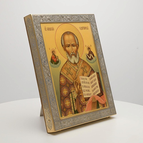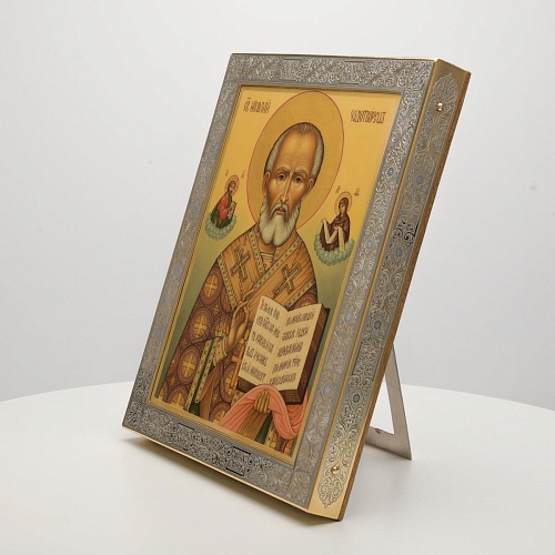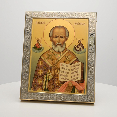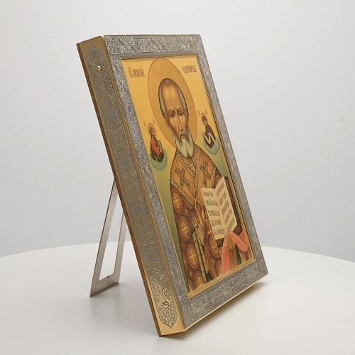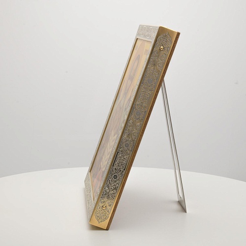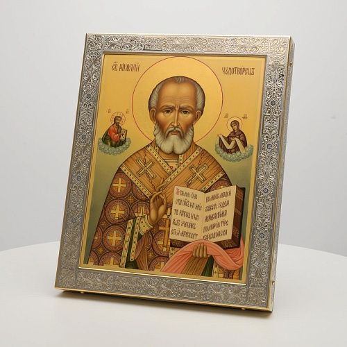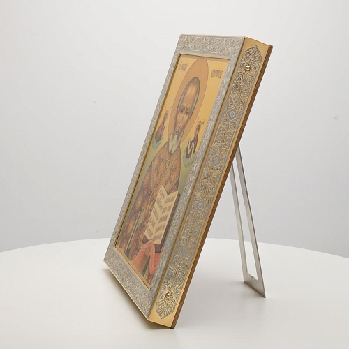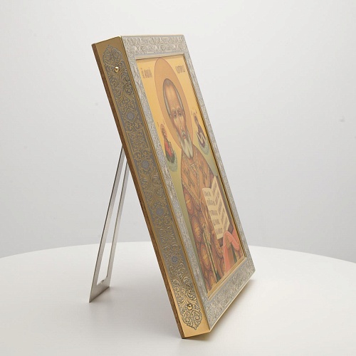 Оклад иконы Святителя Николая Чудотворца, выполненный мастерами компании “АиР” в г. Златоуст, придает ей особую ценность и торжественность. Оклад покрыт золотом высшей пробы (999,9°) толщиной в 1 микрон, что подчеркивает высокое мастерство и искусство создателей. Золотое покрытие не только украшает икону, но и символизирует вечность и непреходящую ценность духовного наследия. Оно защищает икону от внешних воздействий и придает ей дополнительное сияние, усиливая впечатление от образа святого. Такой оклад делает икону не только объектом религиозного почитания, но и произведением искусства, достойным восхищения и уважения.