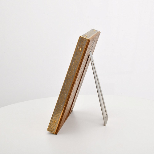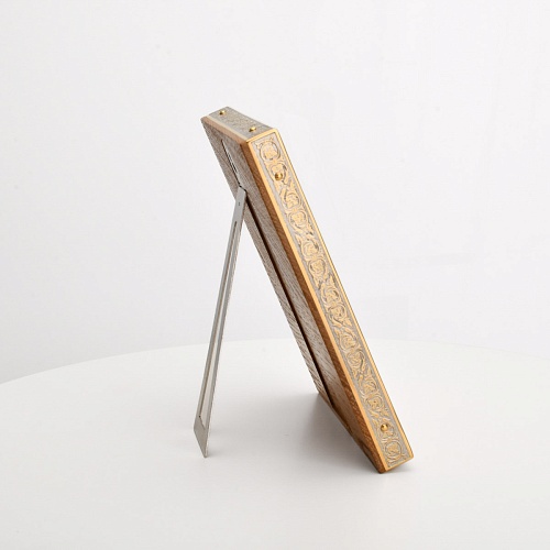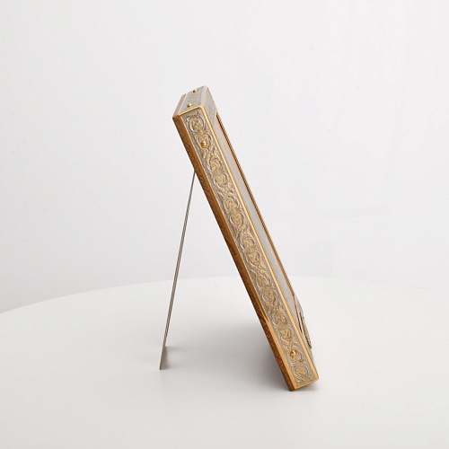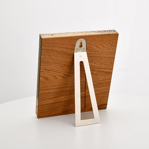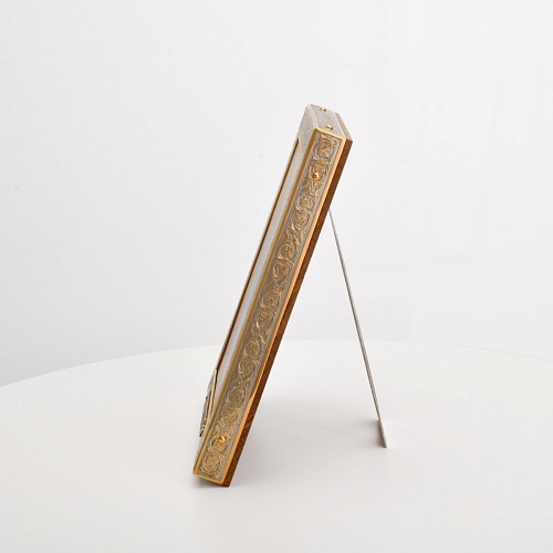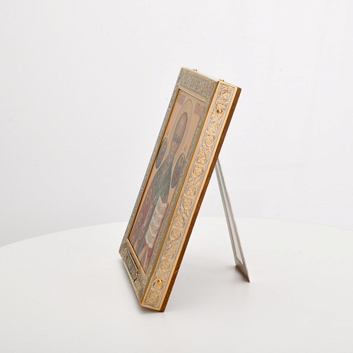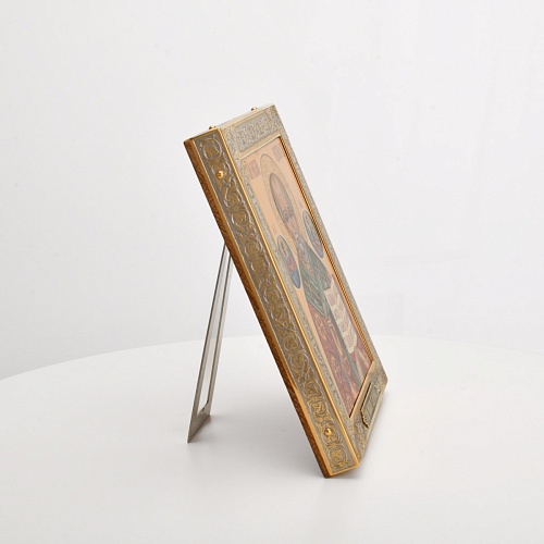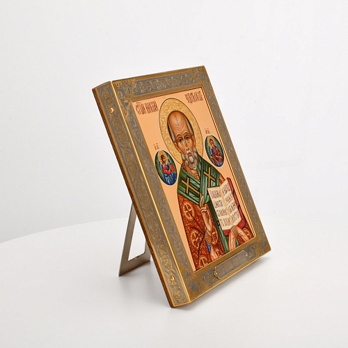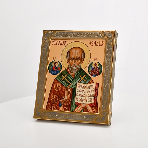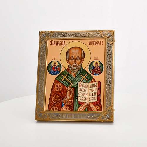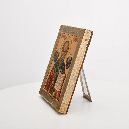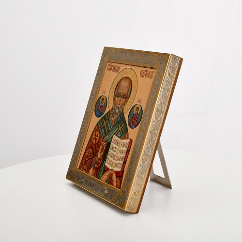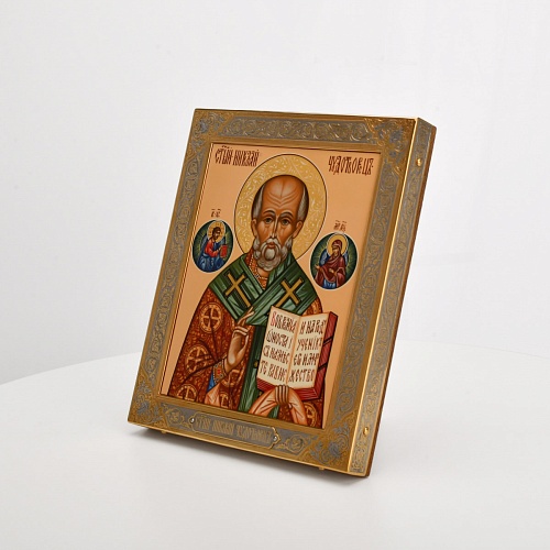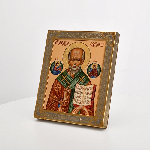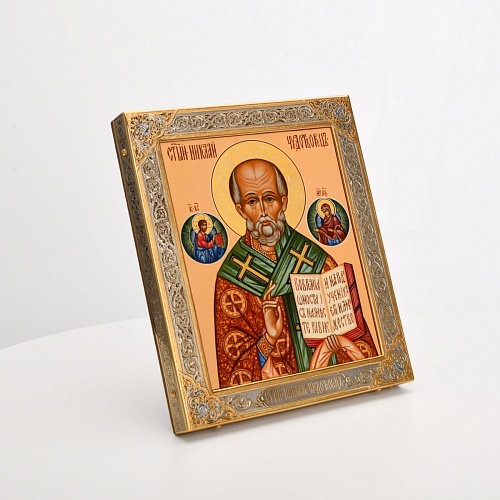 Оклад иконы Святителя Николая Чудотворца, выполненный мастерами компании “АиР” в г. Златоуст, придает ей особую ценность и торжественность. Оклад покрыт золотом высшей пробы (999,9°) толщиной в 1 микрон, что подчеркивает высокое мастерство и искусство создателей. Золотое покрытие не только украшает икону, но и символизирует вечность и непреходящую ценность духовного наследия. Оно защищает икону от внешних воздействий и придает ей дополнительное сияние, усиливая впечатление от образа святого. Такой оклад делает икону не только объектом религиозного почитания, но и произведением искусства, достойным восхищения и уважения.