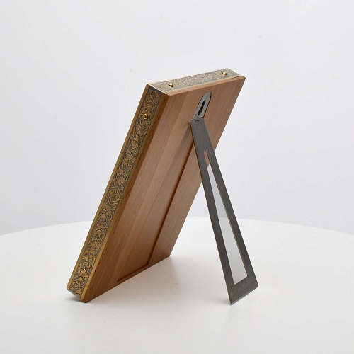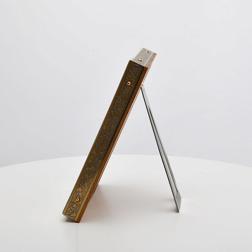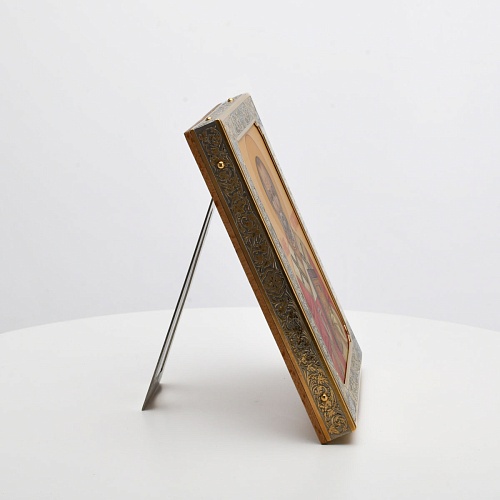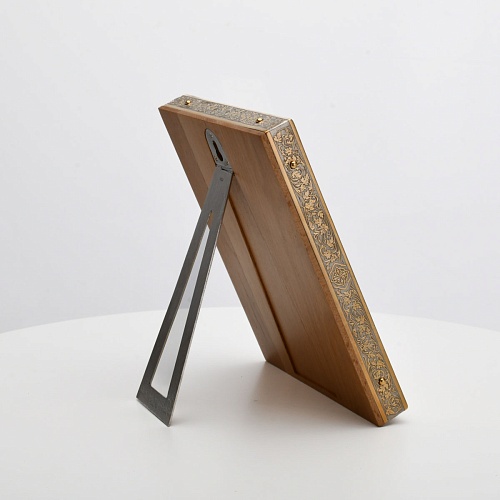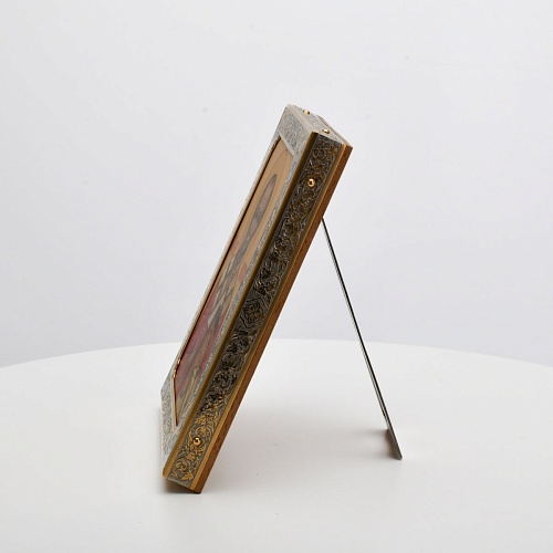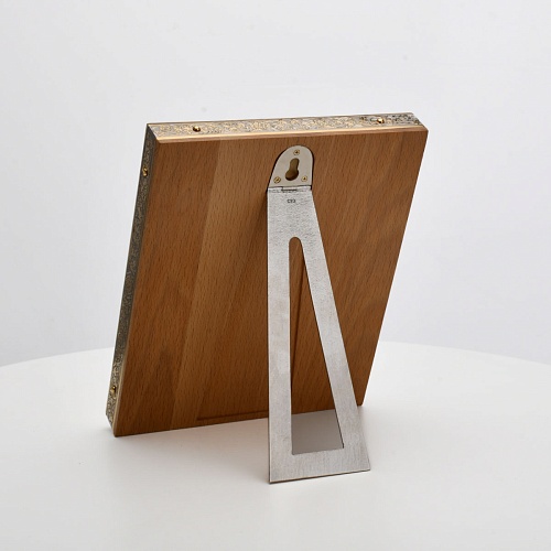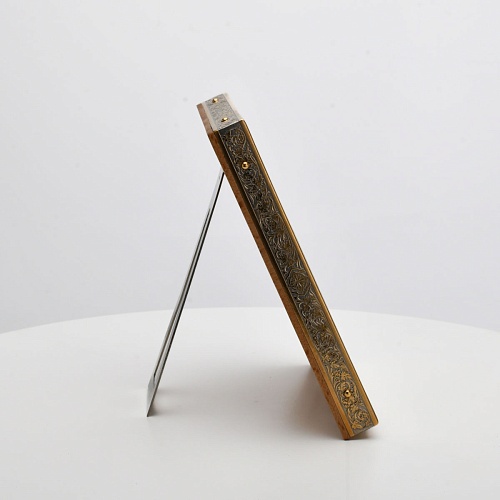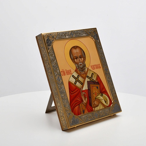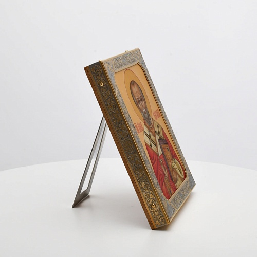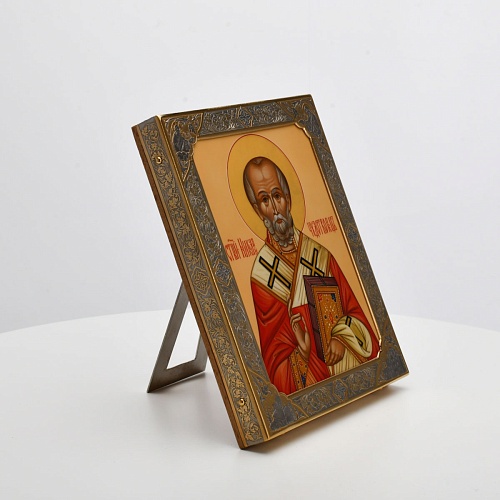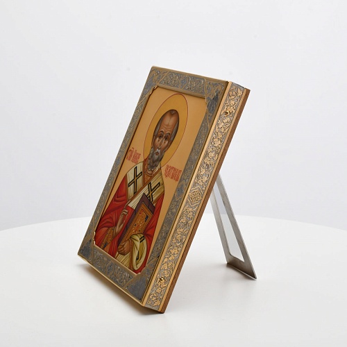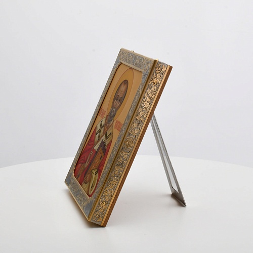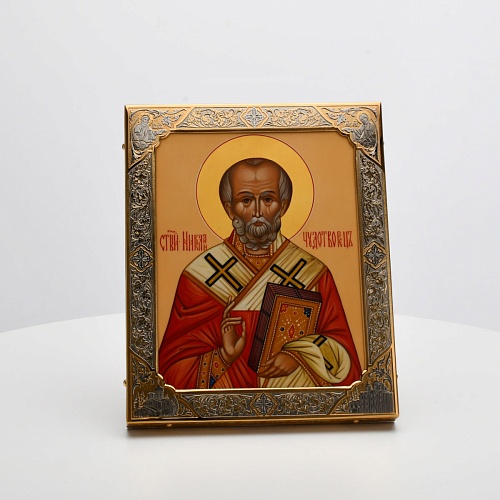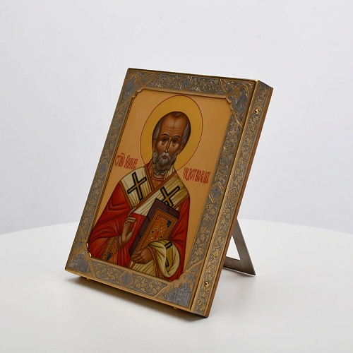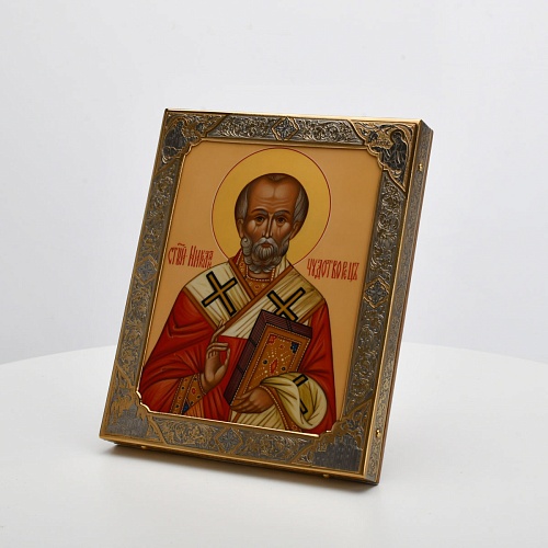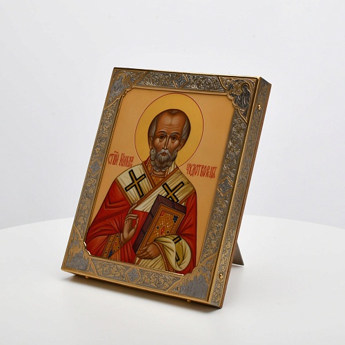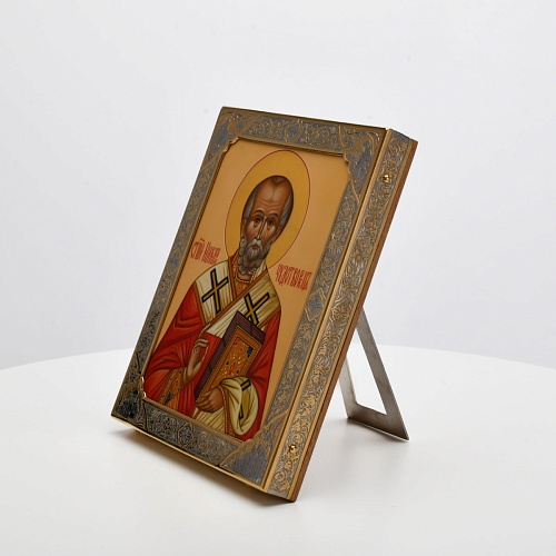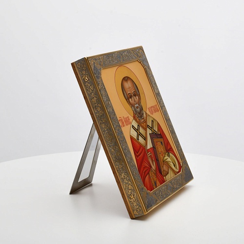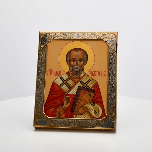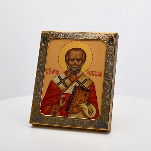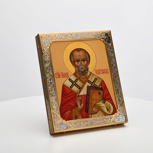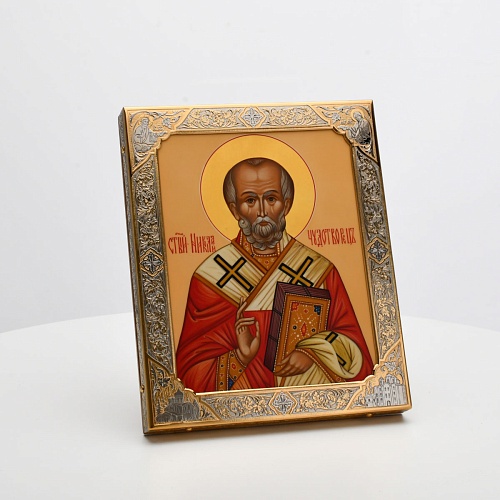 Оклад иконы Святителя Николая Чудотворца, выполненный мастерами компании “АиР” в г. Златоуст, придает ей особую ценность и торжественность. Оклад покрыт золотом высшей пробы (999,9°) толщиной в 1 микрон, что подчеркивает высокое мастерство и искусство создателей. Золотое покрытие не только украшает икону, но и символизирует вечность и непреходящую ценность духовного наследия. Оно защищает икону от внешних воздействий и придает ей дополнительное сияние, усиливая впечатление от образа святого. Такой оклад делает икону не только объектом религиозного почитания, но и произведением искусства, достойным восхищения и уважения.