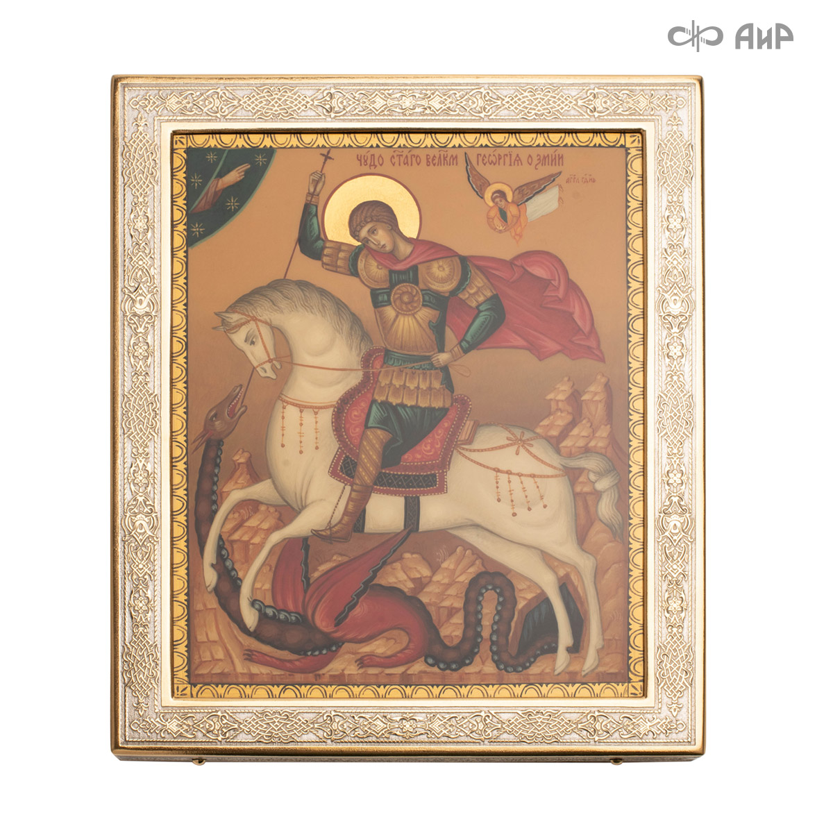 Современный оклад иконы Святого великомученика Георгия Победоносца, выполненный мастерами Компании «АиР», является настоящим произведением искусства. Он изготовлен с использованием высочайших технологий и материалов, каждый его элемент выполнен с тщательной проработкой деталей, что делает икону настоящим произведением искусства. Златоуст известен своими уникальными традициями художественного ремесла, и этот оклад является ярким примером мастерства и преданности своему делу. Мастера «АиР» использовали уникальные технологии и традиционные приёмы художественной обработки металлов, чтобы создать этот шедевр. Оклад покрыт золотом высшей пробы (999,9°) толщиной в 1 микрон, что придает иконе особую ценность и благородство. Золото символизирует чистоту, вечность и божественное сияние. Золотой оклад не только подчеркивает духовное значение иконы, но и делает её ещё более величественной и торжественной, привлекая внимание верующих и ценителей искусства.