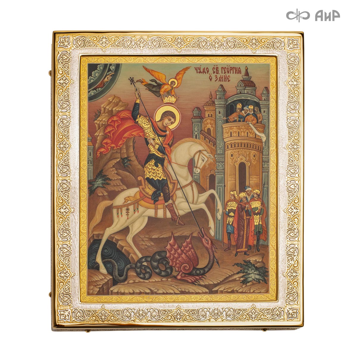 Современный оклад иконы Святого великомученика Георгия Победоносца, выполненный мастерами Компании «АиР», является настоящим произведением искусства. Он изготовлен с использованием высочайших технологий и материалов, каждый его элемент выполнен с тщательной проработкой деталей, что делает икону настоящим произведением искусства. Златоуст известен своими уникальными традициями художественного ремесла, и этот оклад является ярким примером мастерства и преданности своему делу. Мастера «АиР» использовали уникальные технологии и традиционные приёмы художественной обработки металлов, чтобы создать этот шедевр. Оклад покрыт золотом высшей пробы (999,9°) толщиной в 1 микрон, что придает иконе особую ценность и благородство. Золото символизирует чистоту, вечность и божественное сияние. Золотой оклад не только подчеркивает духовное значение иконы, но и делает её ещё более величественной и торжественной, привлекая внимание верующих и ценителей искусства.
