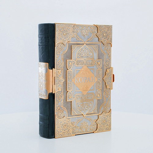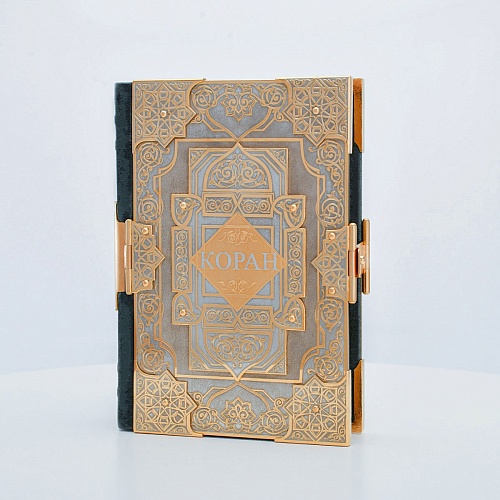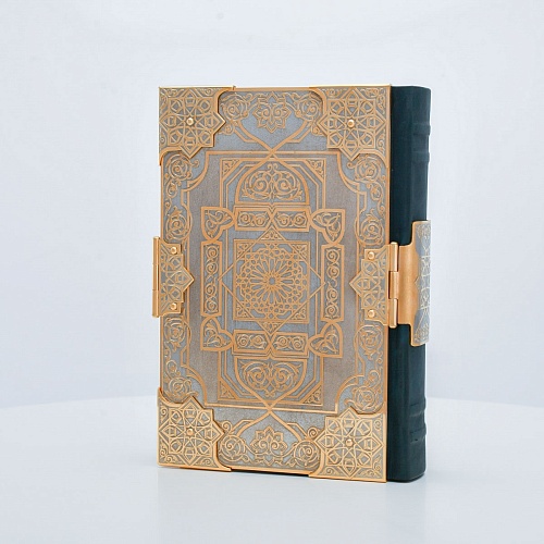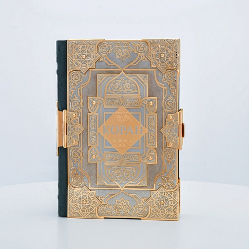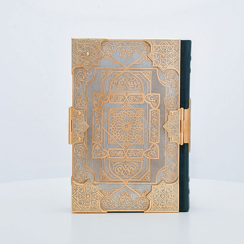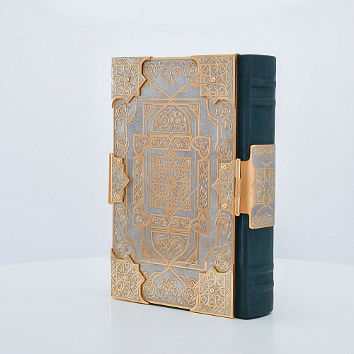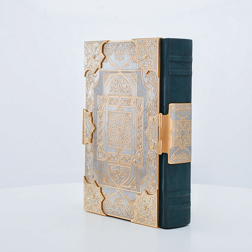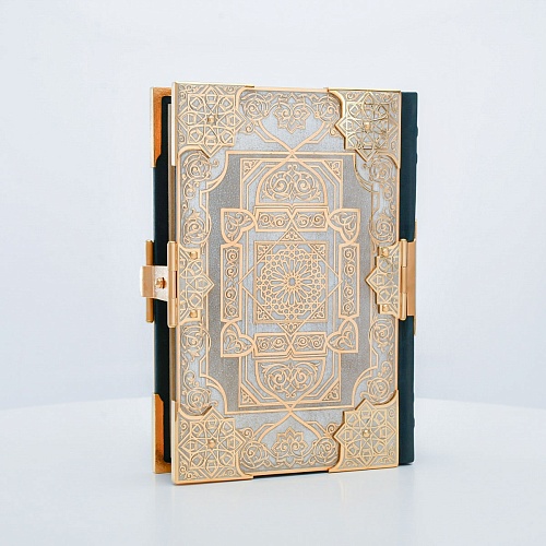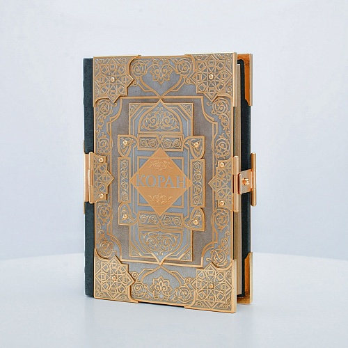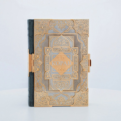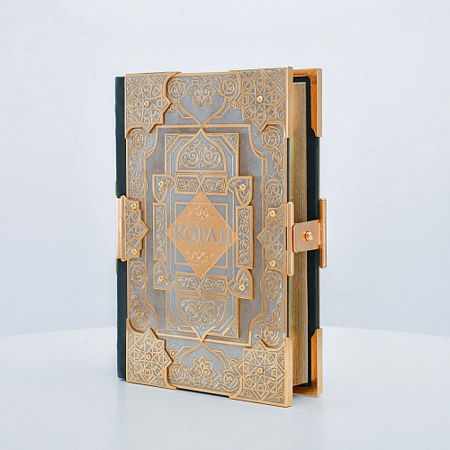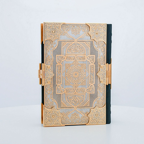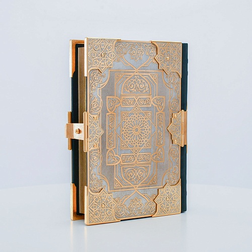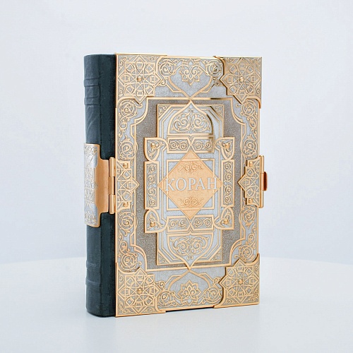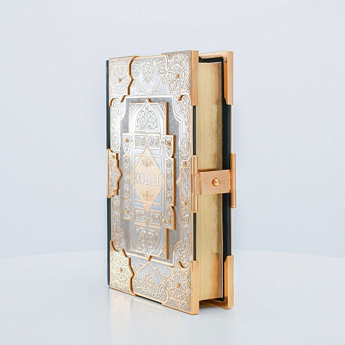 Книга – самый лучший подарок, особенно произведенная руками художников для последователей мусульманского вероисповедания. Оформление для Корана исполнено златоустовскими художниками в технике гравюры на поверхности долговечного металла. Оклад книги покрыт золотом высшей пробы, а тонкий, филигранный узор на обеих сторонах выполнен в восточных мотивах с арабской вязью.
