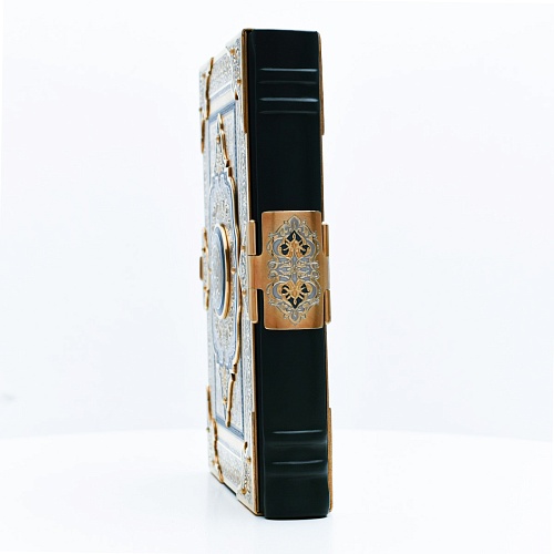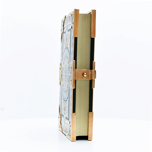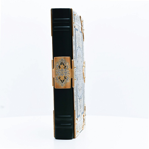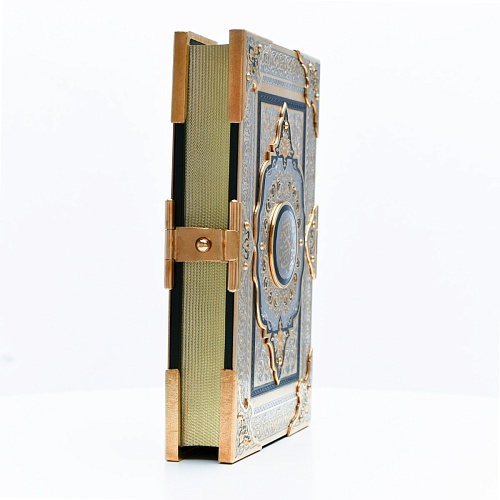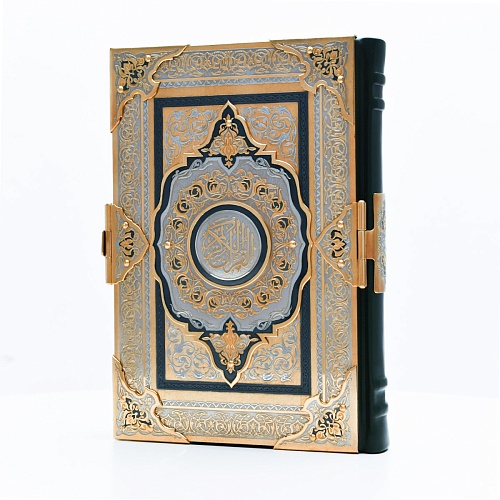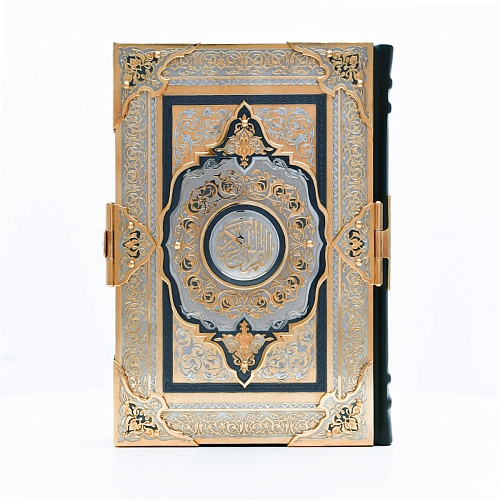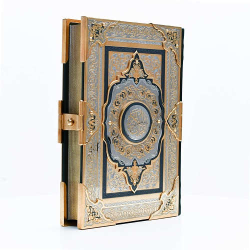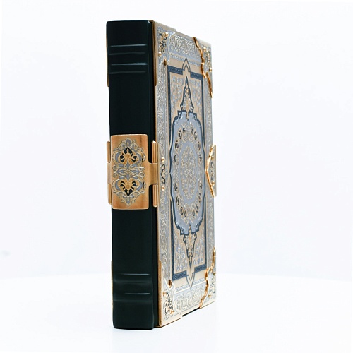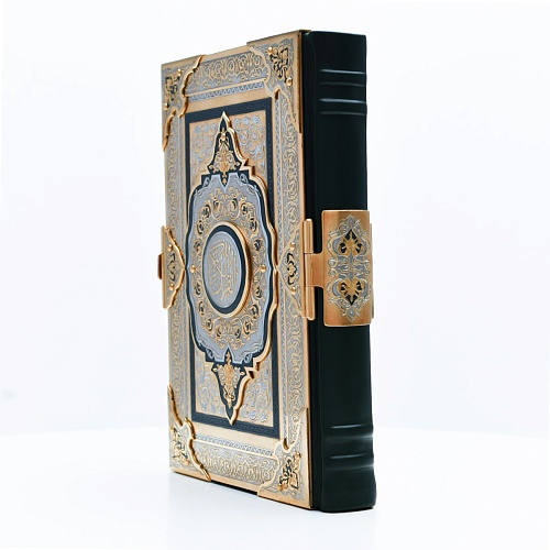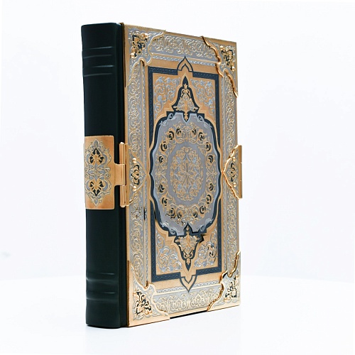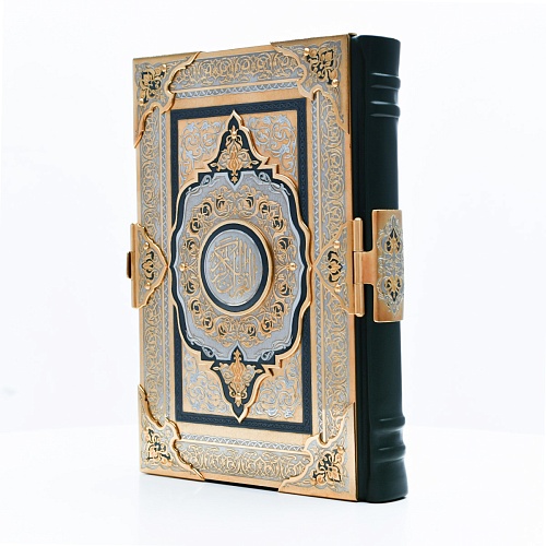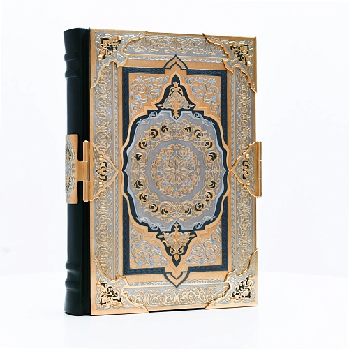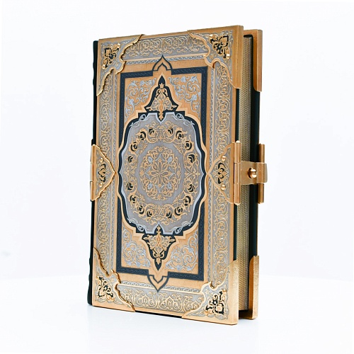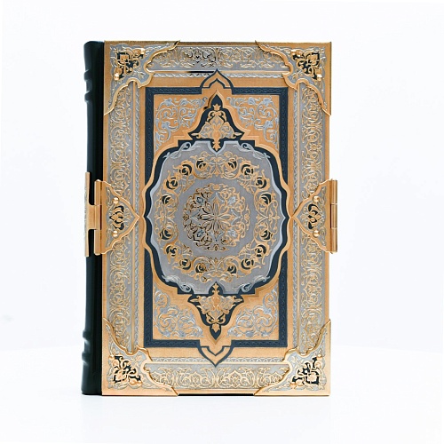 Книга – самый лучший подарок, особенно произведенная руками художников для последователей мусульманского вероисповедания. Оформление для Корана исполнено златоустовскими художниками в технике гравюры на поверхности долговечного металла. Оклад книги покрыт золотом высшей пробы, а тонкий, филигранный узор на обеих сторонах выполнен в восточных мотивах с арабской вязью.