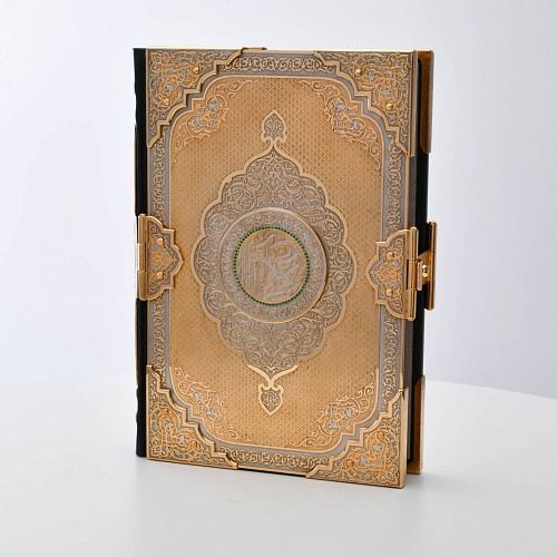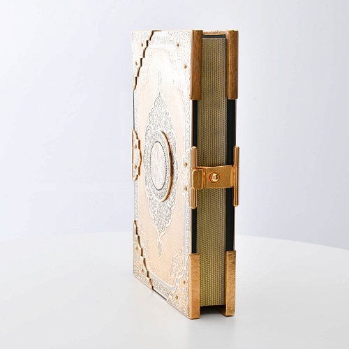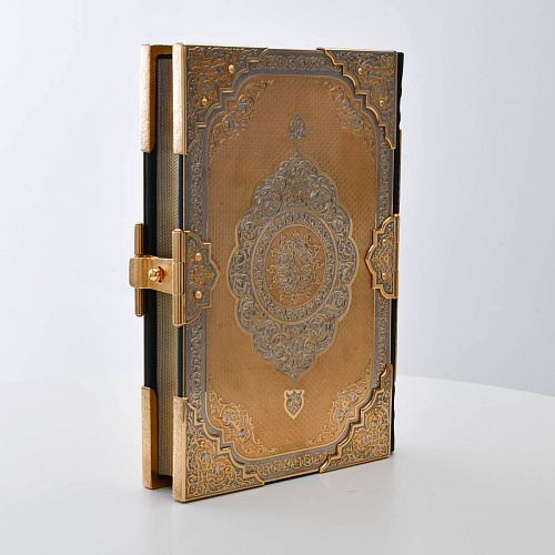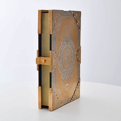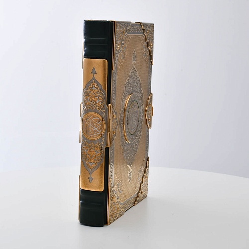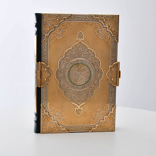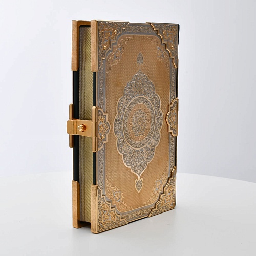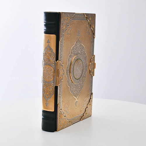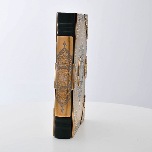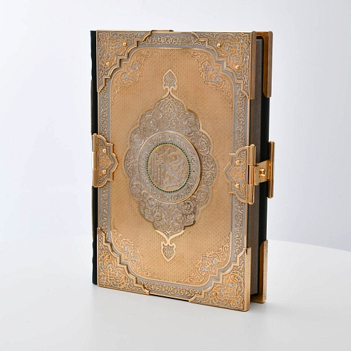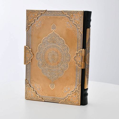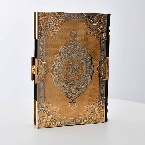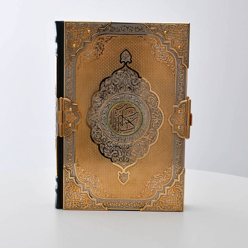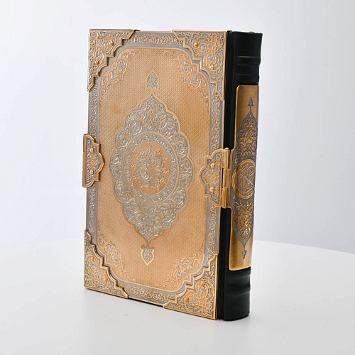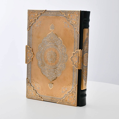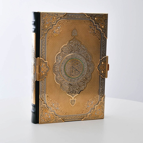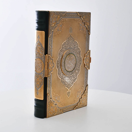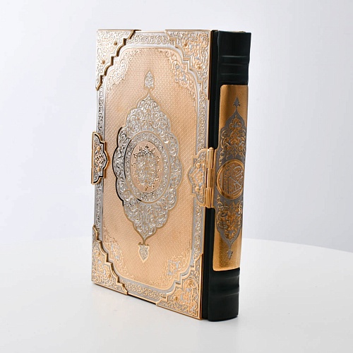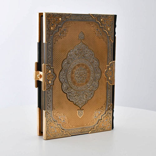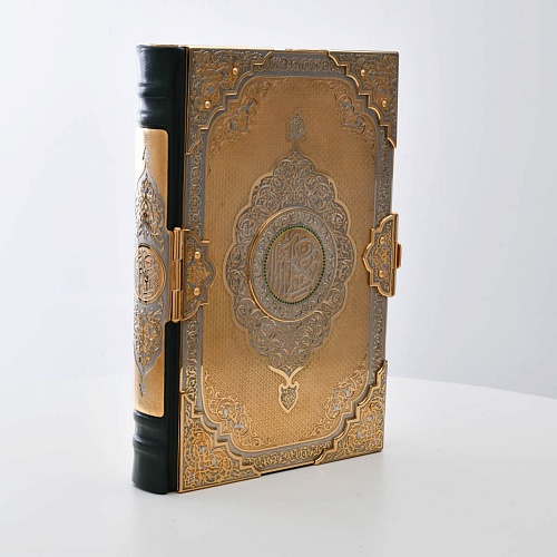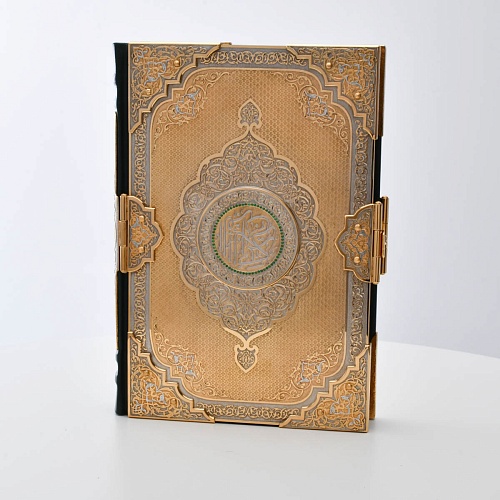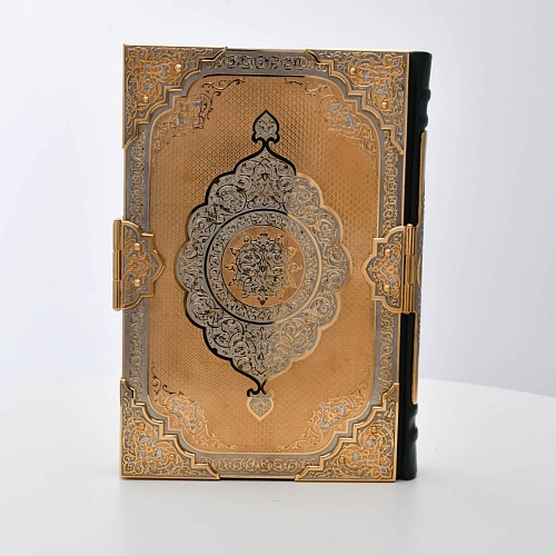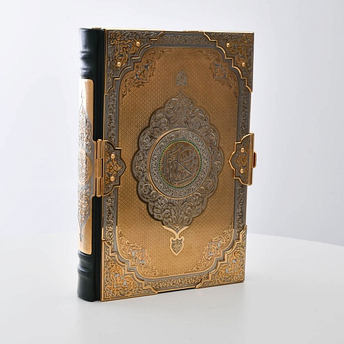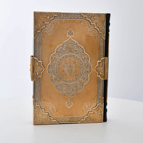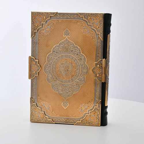 Книга – самый лучший подарок, особенно произведенная руками художников для последователей мусульманского вероисповедания. Оформление для Корана исполнено златоустовскими художниками в технике гравюры на поверхности долговечного металла. Оклад книги покрыт золотом высшей пробы, а тонкий, филигранный узор на обеих сторонах выполнен в восточных мотивах с арабской вязью.