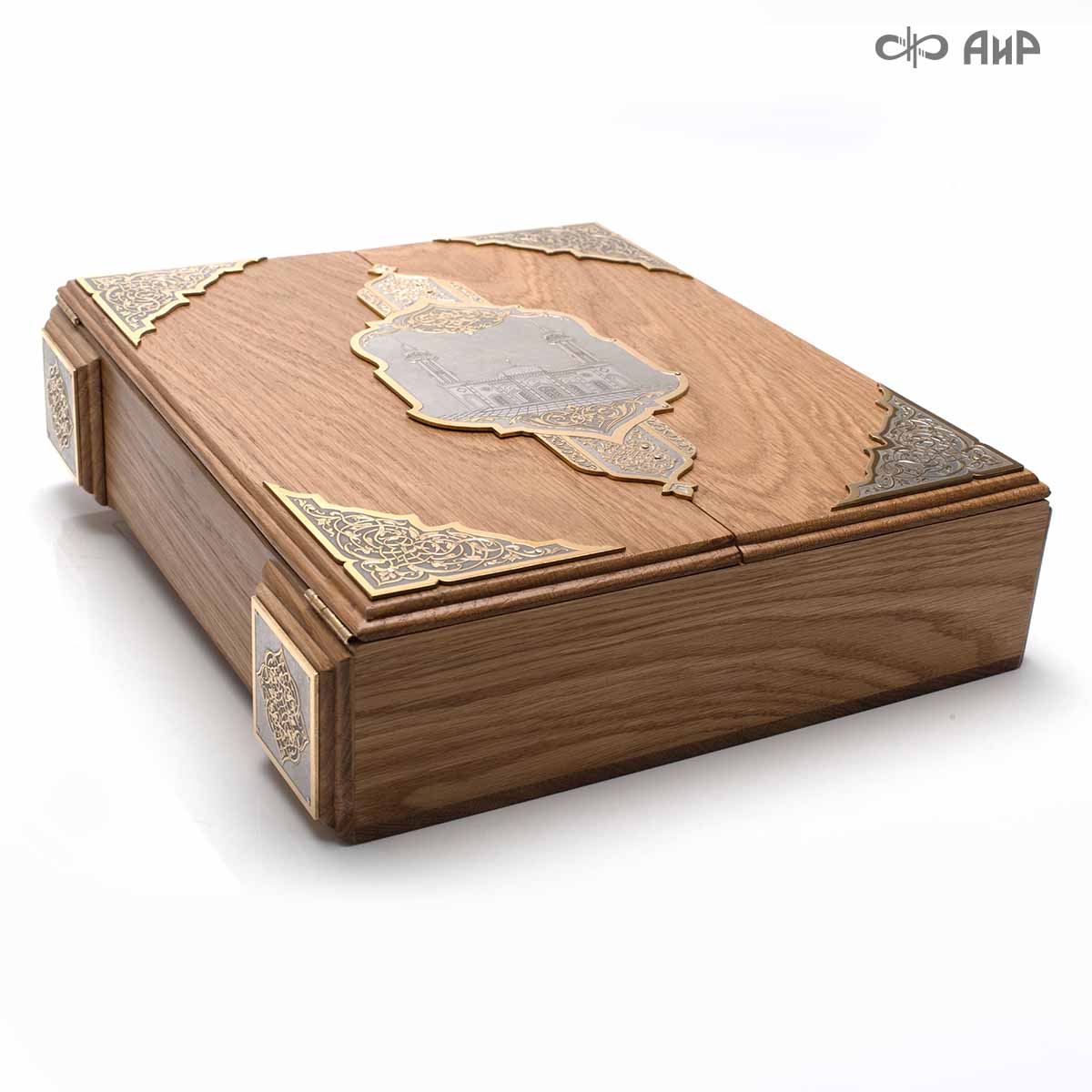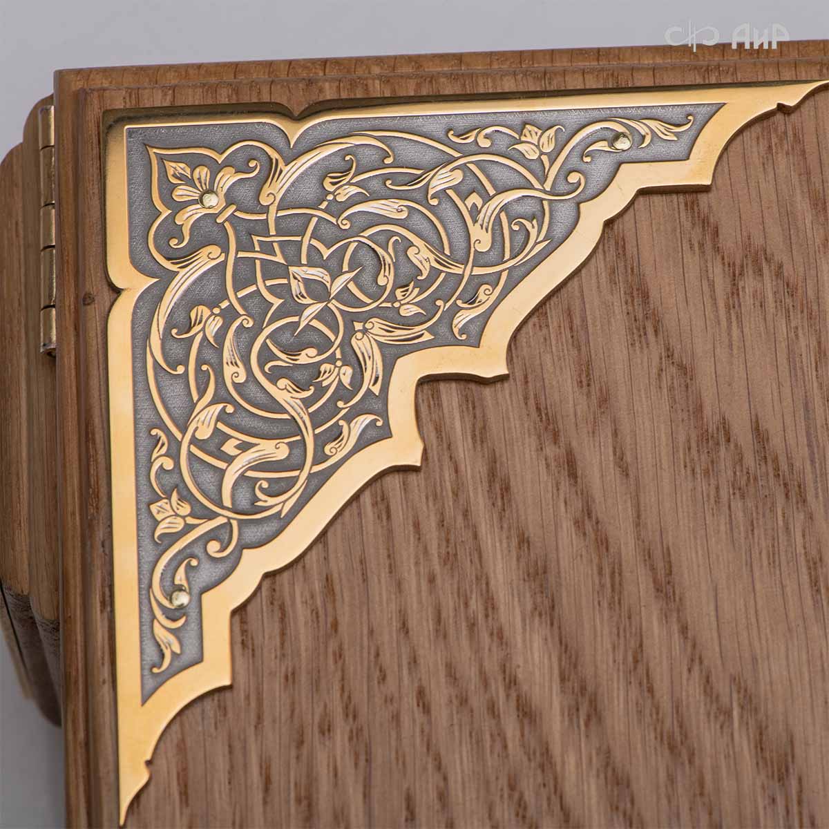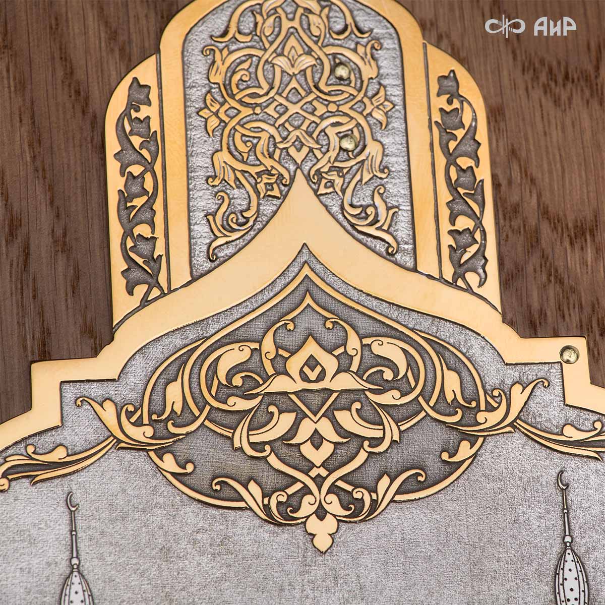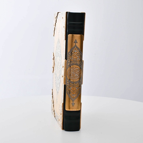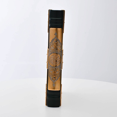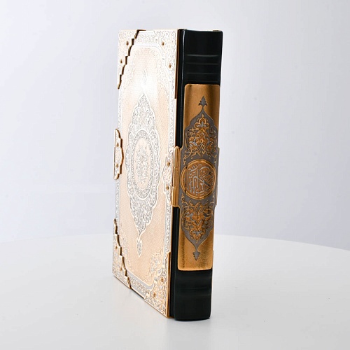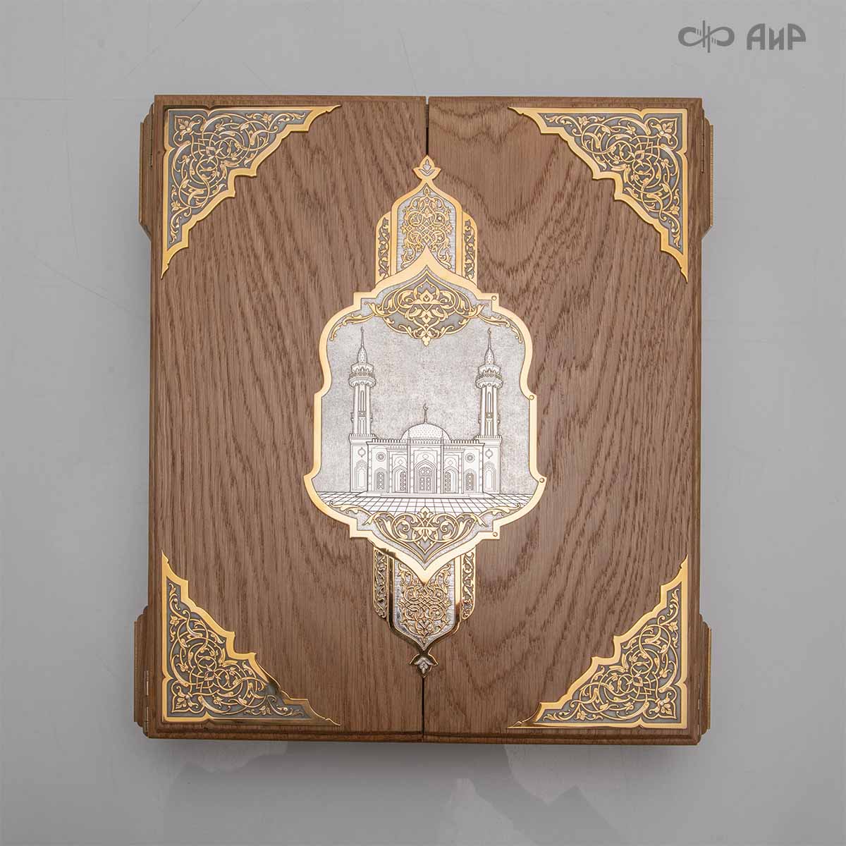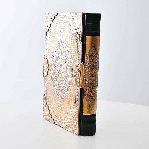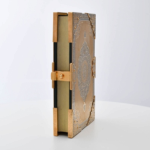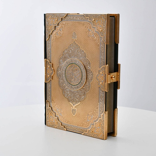 Книга – самый лучший подарок, особенно произведенная руками художников для последователей мусульманского вероисповедания. Оформление для Корана исполнено златоустовскими художниками в технике гравюры на поверхности долговечного металла. Оклад книги покрыт золотом высшей пробы, а тонкий, филигранный узор на обеих сторонах выполнен в восточных мотивах с арабской вязью.