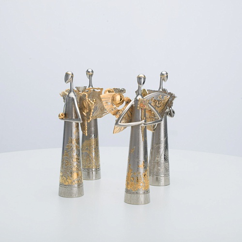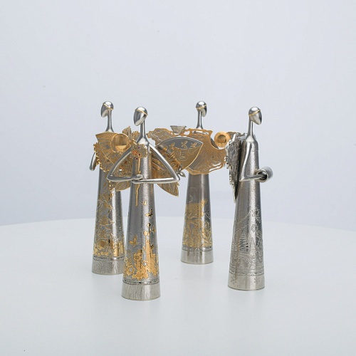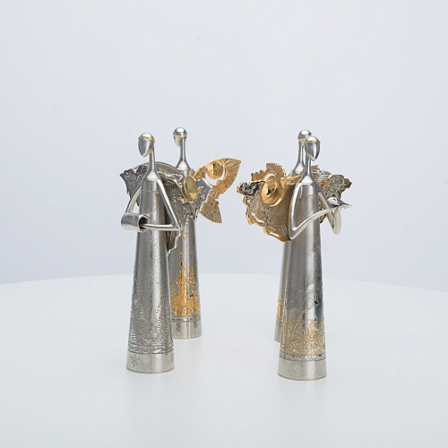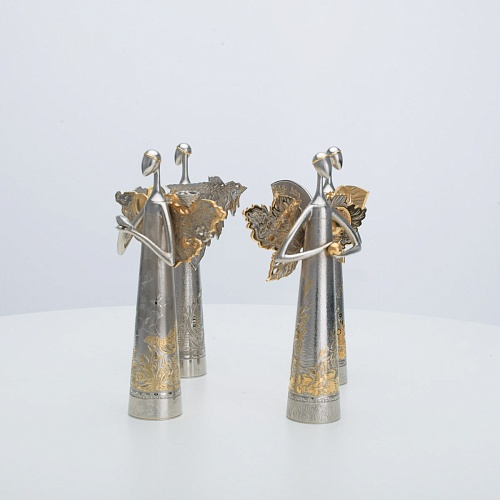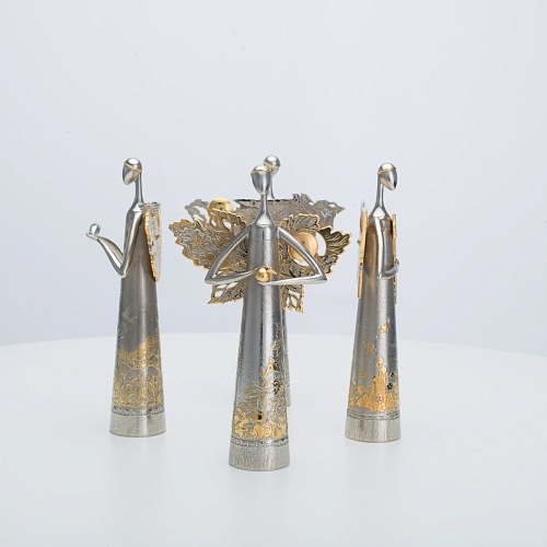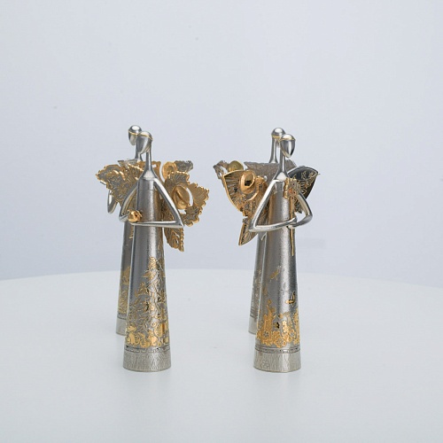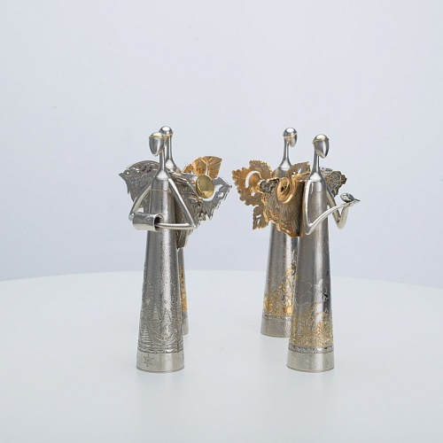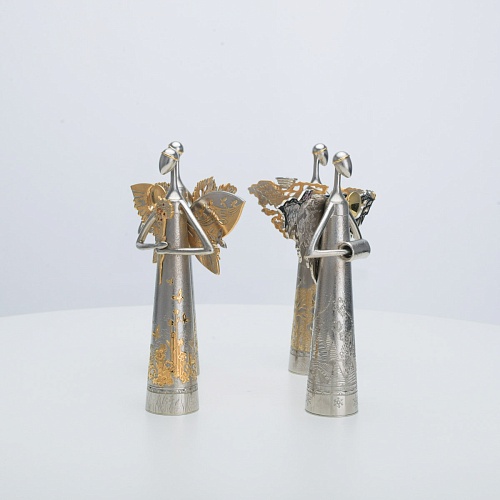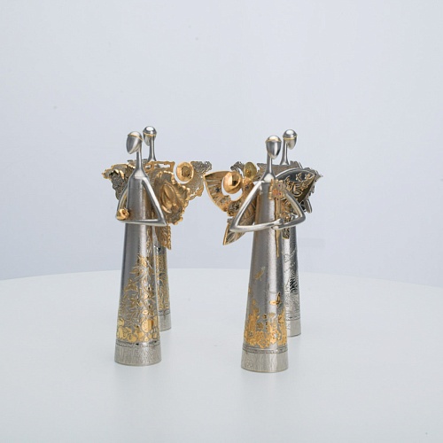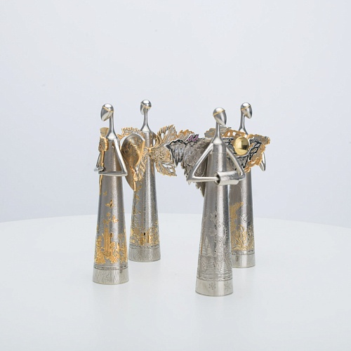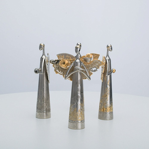 Сувенир «Ангел Зима» – это маленькое чудо, рожденное тонкой душой художника и сотворенное руками мастера-оружейника Компании «АиР». Филигранная работа видна во всем образе сувенира. Изящная фигурка Ангела в платье, украшенном елками и снежинками, заснеженная муфта, крылья в виде сосулек, с узорами в виде ветвей рябины и хвойных лап, на которых примостилась пара снегирей. Крылья «Ангела Зимы» тонко проработаны, особую воздушность изделию придает просечка по металлу. В грудки снегирей инкрустированы красные корунды.