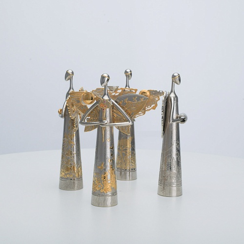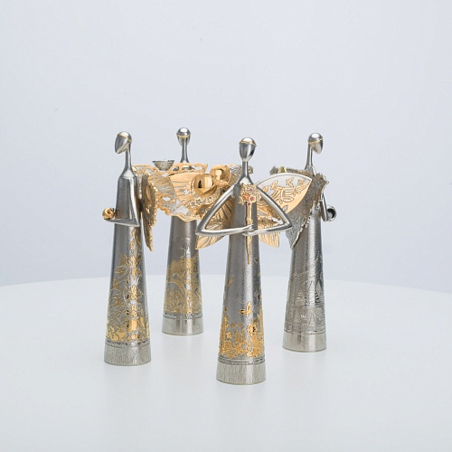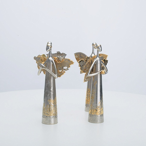 Сувенир «Ангел Лето» – это маленькое чудо, рожденное тонкой душой художника и сотворенное руками мастера-оружейника Компании «АиР». Филигранная работа видна во всем образе сувенира. Изящная фигурка Ангела в платье, украшенном цветами, травами и бабочками, красочный букет полевых цветов с инкрустированными фианитами и гранатом. Крылья Ангела выполнены в форме бабочки, где под лучами солнца распускаются соцветия и кружатся в легком танце мотыльки. Крылья «Ангела Лето» тонко проработаны, особую воздушность изделию придает просечка по металлу.