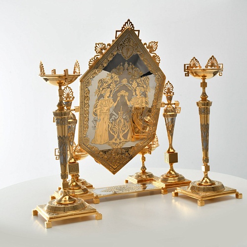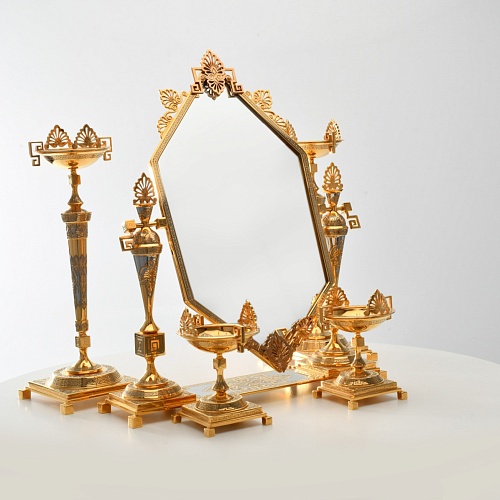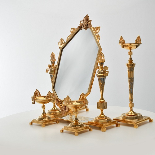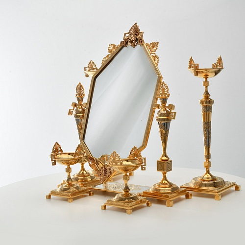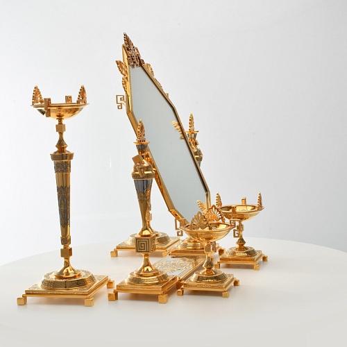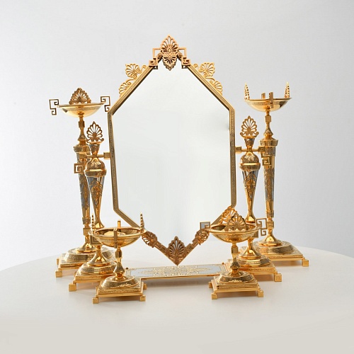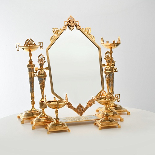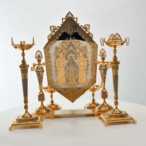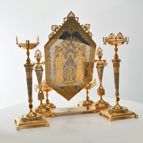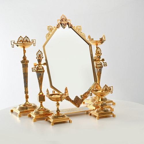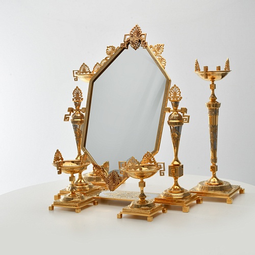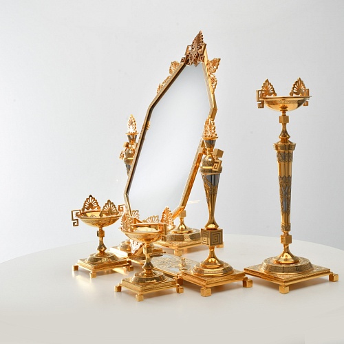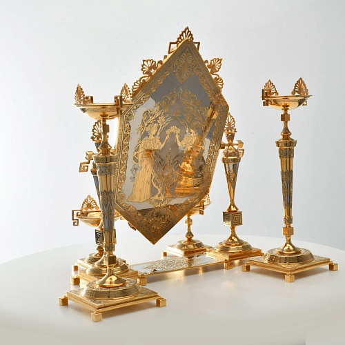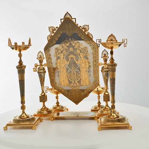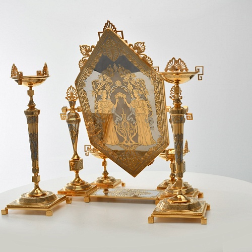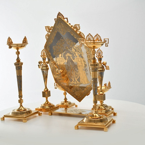 На обратной стороне зеркала изображена античная сцена с юными девушками в цветущем саду, что символизирует вечную молодость и неувядающую красоту души. Подсвечники имеют разную высоту – в этом задумка авторов набора, можно создать разноуровневое освещение для особых случаев или просто романтического настроения.