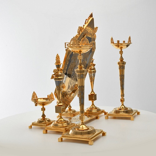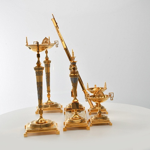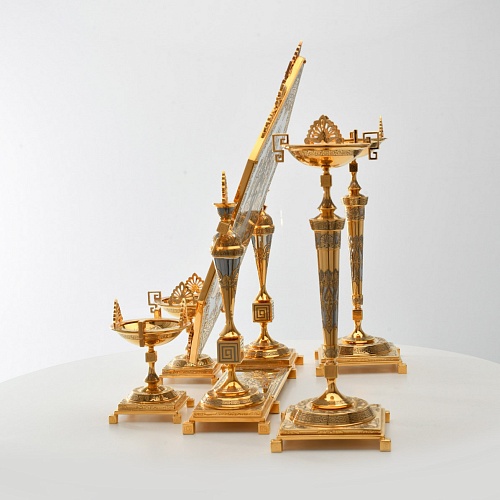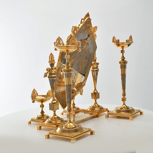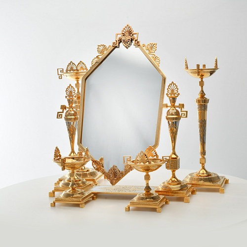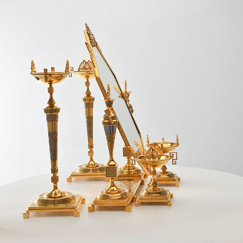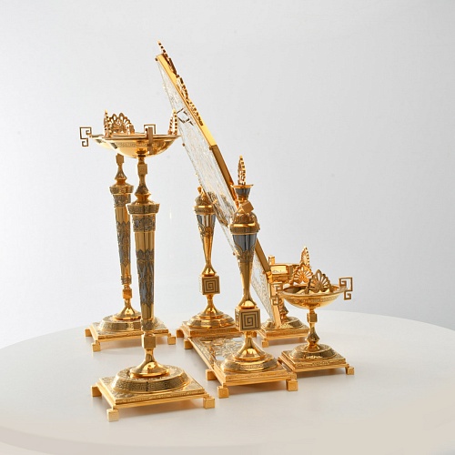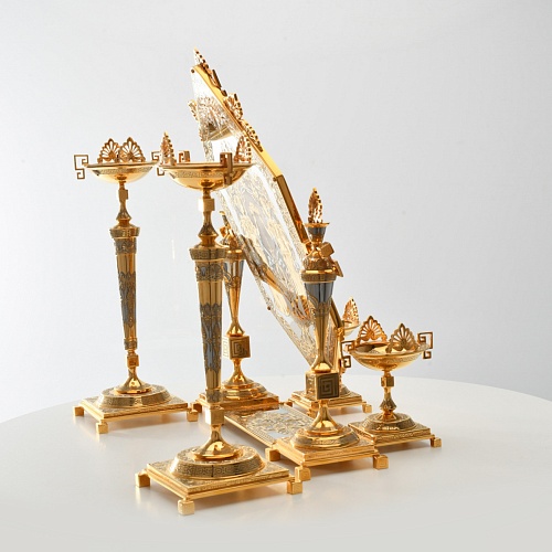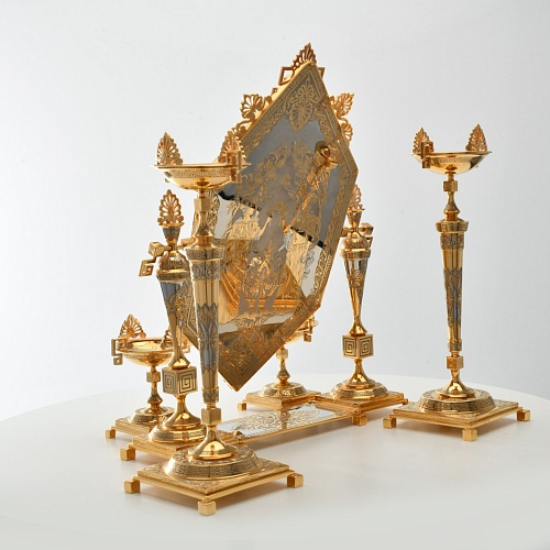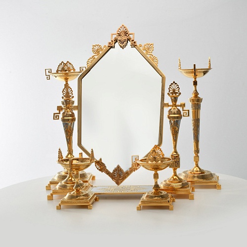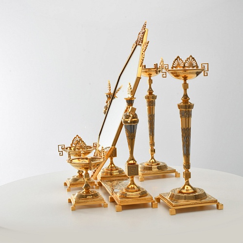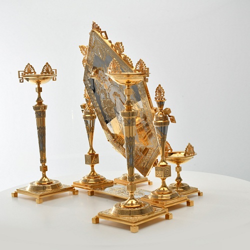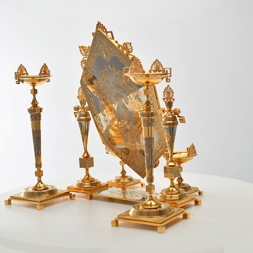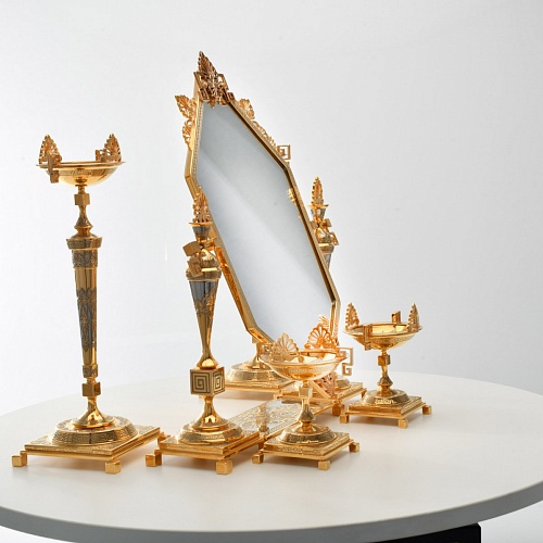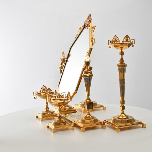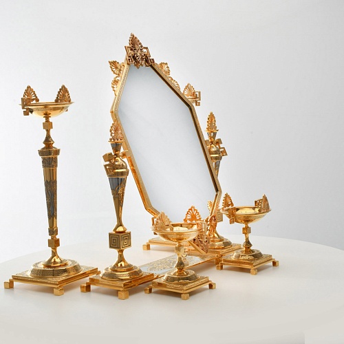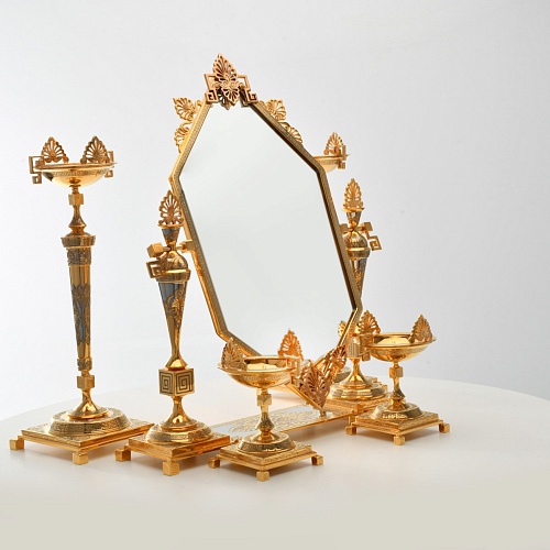 На обратной стороне зеркала изображена античная сцена с юными девушками в цветущем саду, что символизирует вечную молодость и неувядающую красоту души. Подсвечники имеют разную высоту – в этом задумка авторов набора, можно создать разноуровневое освещение для особых случаев или просто романтического настроения.