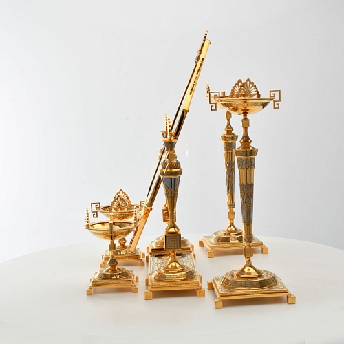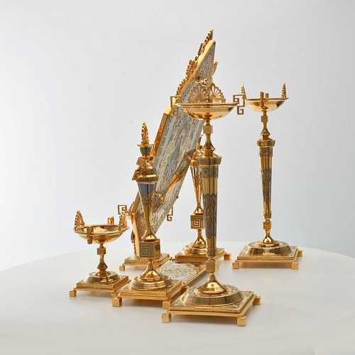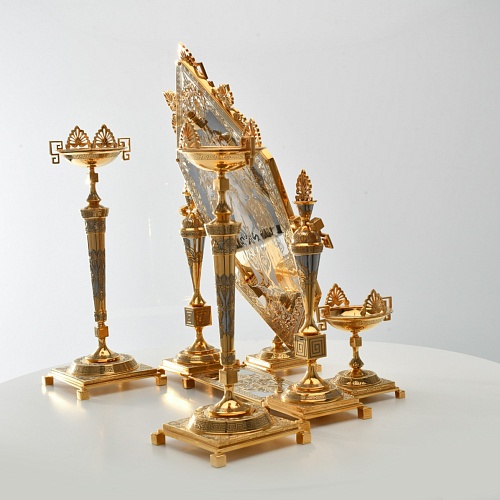 Набор «Греческий» выполнен в высокохудожественном стиле златоустовской гравюры на металле. Все его составные части пронизаны духом античной культуры, богато украшены самым распространенным в Древней Греции ортогональным орнаментом – меандром. Меандровая лента орнамента имела глубокий магический смысл, она отражала непрерывное течение человеческой жизни. Прямизна и строгая геометрия узора символизировали прямой путь человека и добродетель. Помимо меандра, изделие украшено декоративным элементом, похожим одновременно на морскую раковину – символ богини любви Афродиты и на раскрытый хвост павлина – атрибут верховной богини Геры, жены Зевса, покровительницы брака.