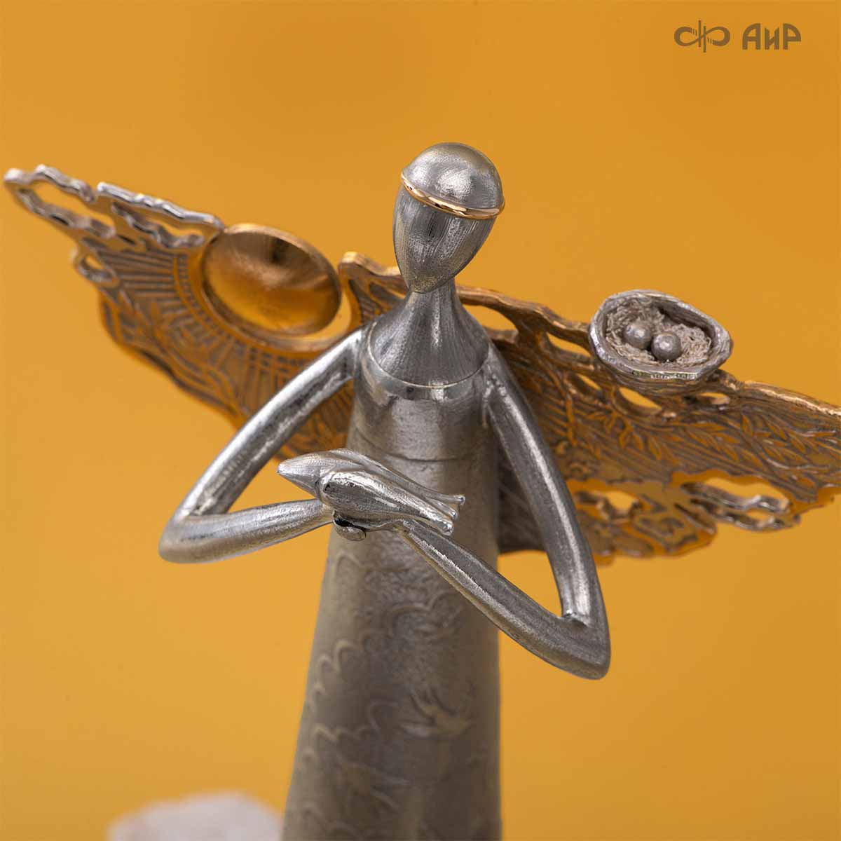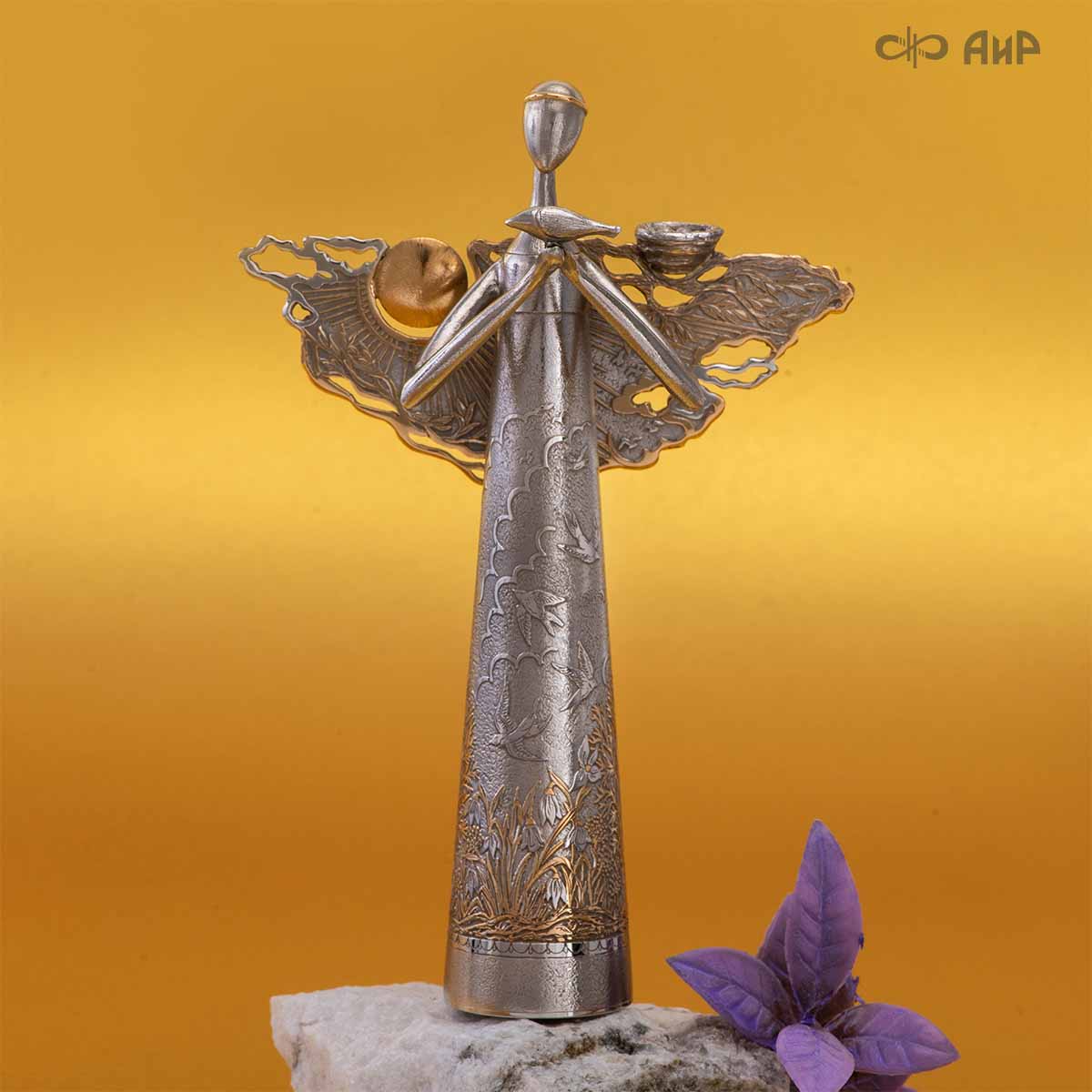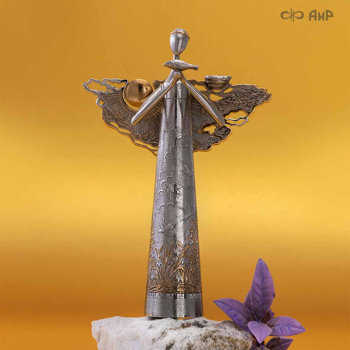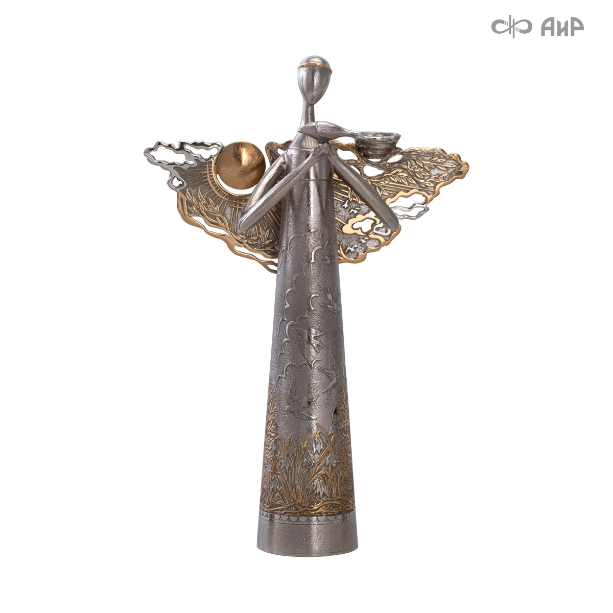 Сувенир «Ангел Весна» – это маленькое чудо, рожденное тонкой душой художника и сотворенное руками мастера-оружейника Компании «АиР». Филигранная работа видна во всем образе сувенира. Изящная фигурка Ангела одета в платье, украшенное подснежниками и ласточками, пташка доверчиво пригрелась на руках Ангела. Крылья Ангела выполнены в виде весенних грозовых туч, сквозь которые все сильнее светит солнце, перелетные птицы возвращаются домой, чтобы свить гнезда.