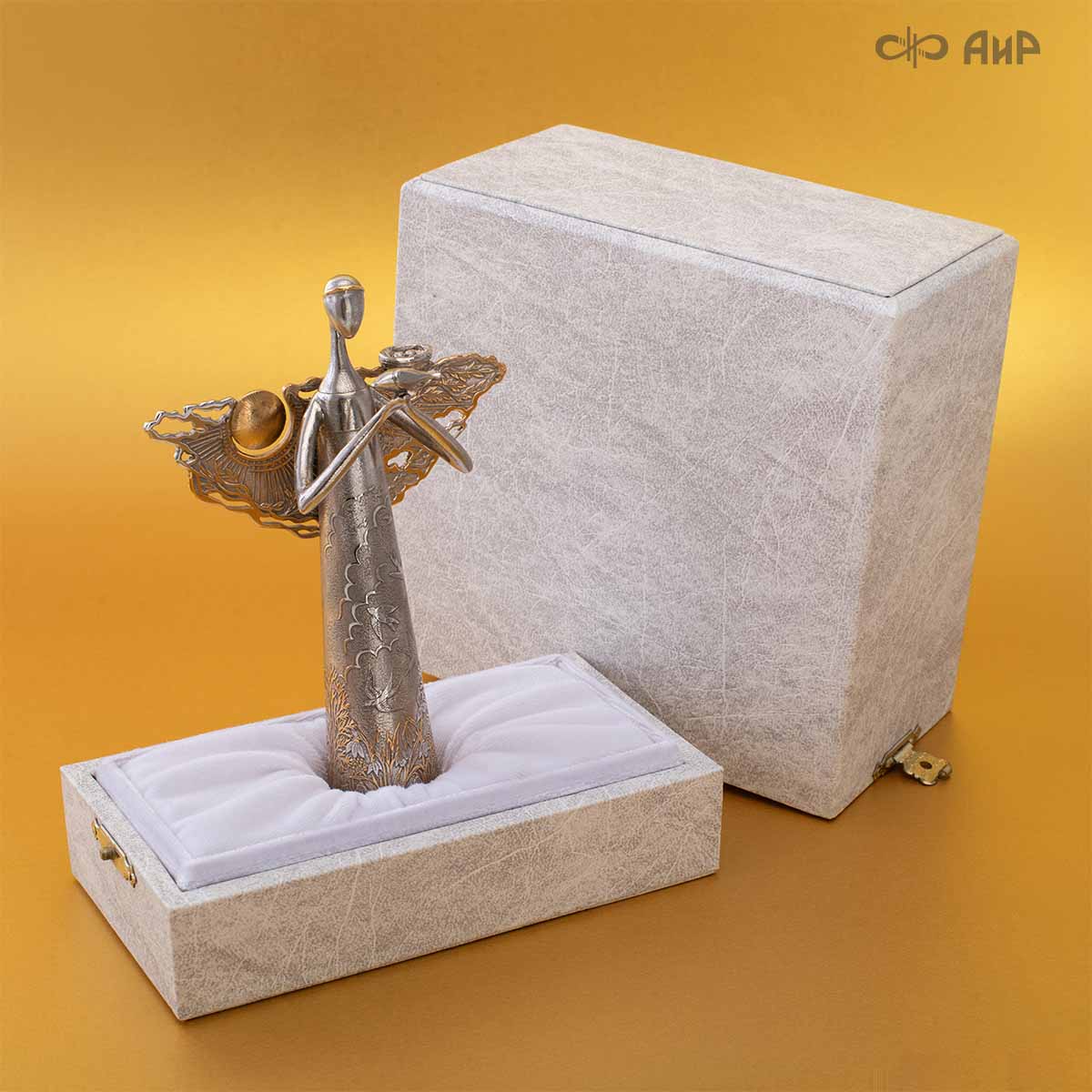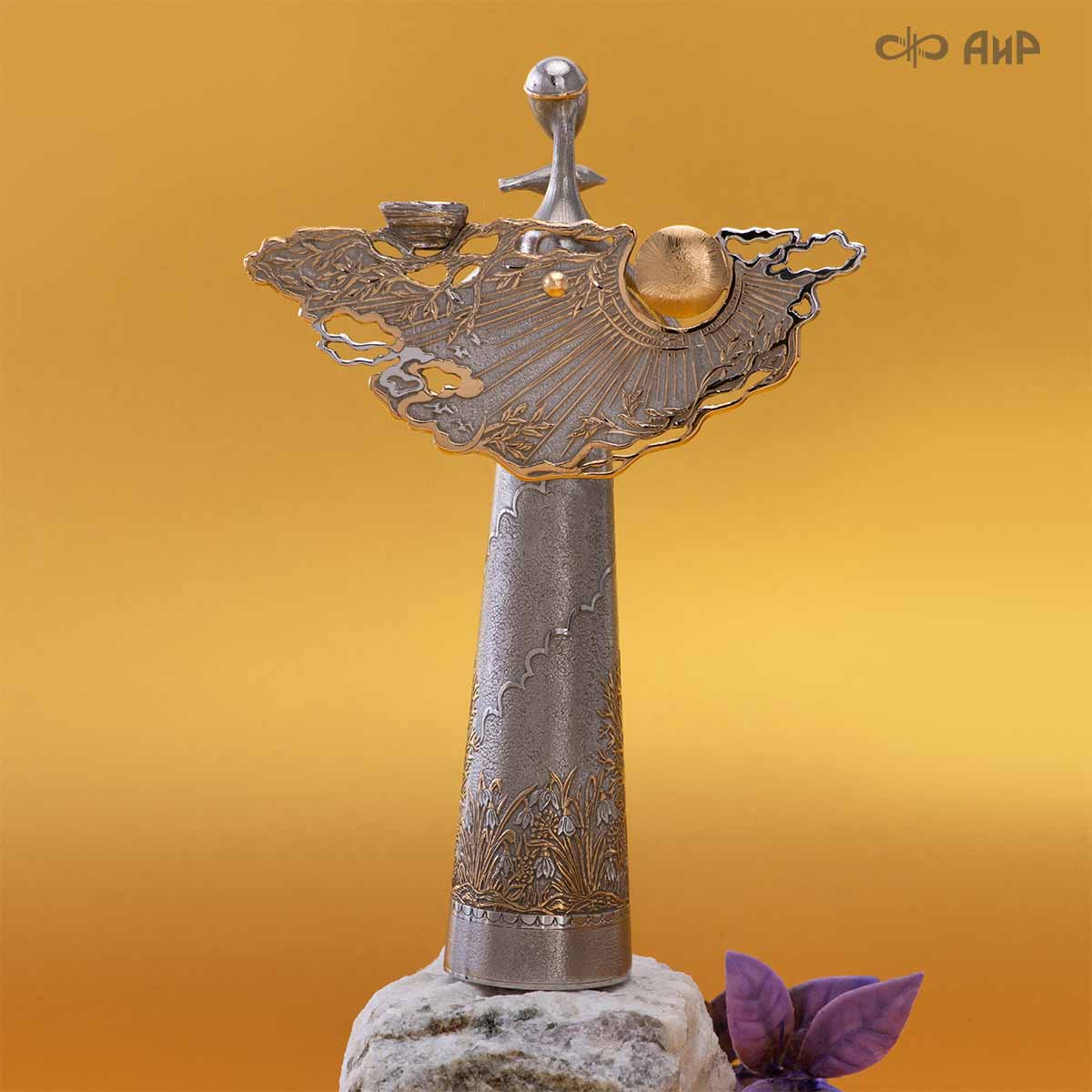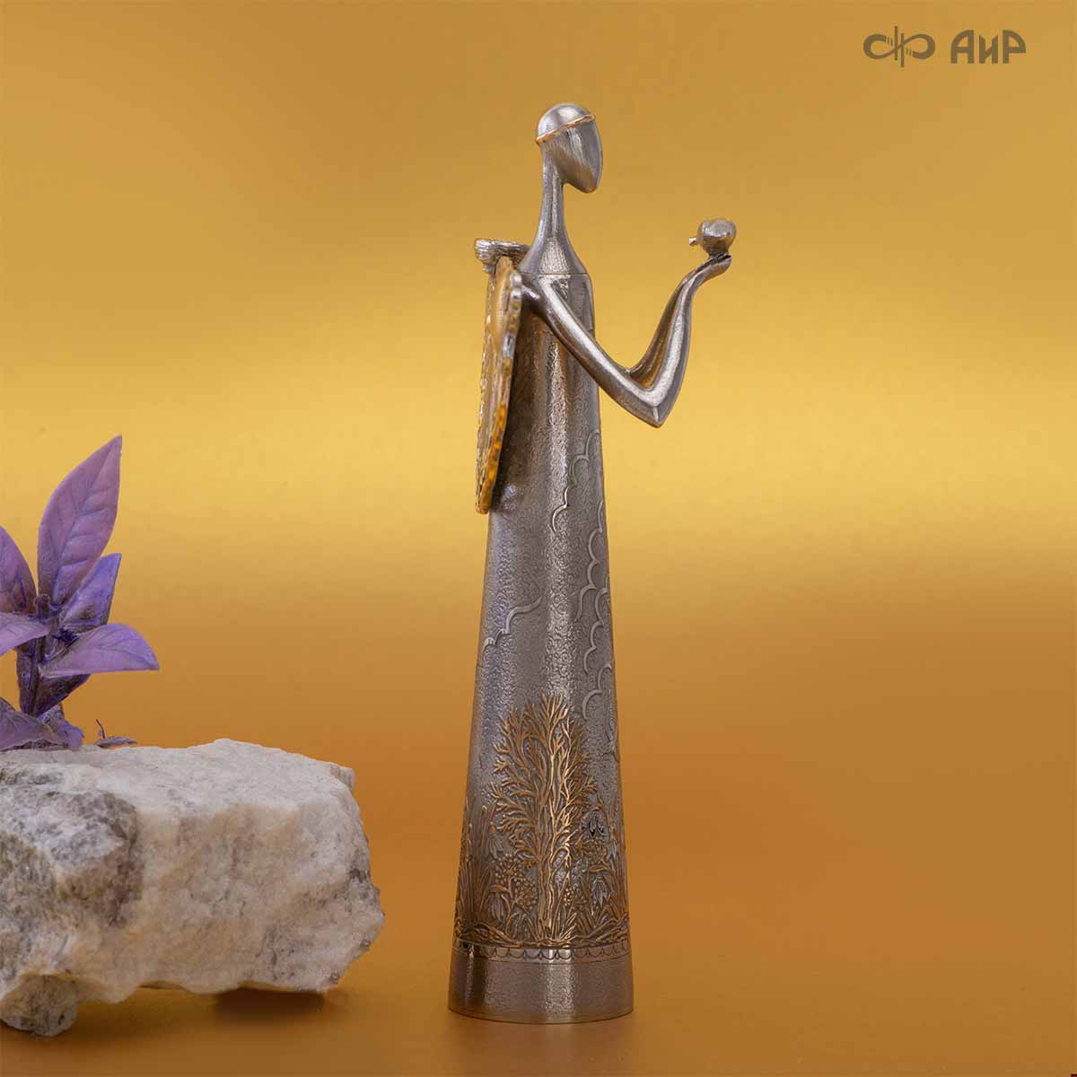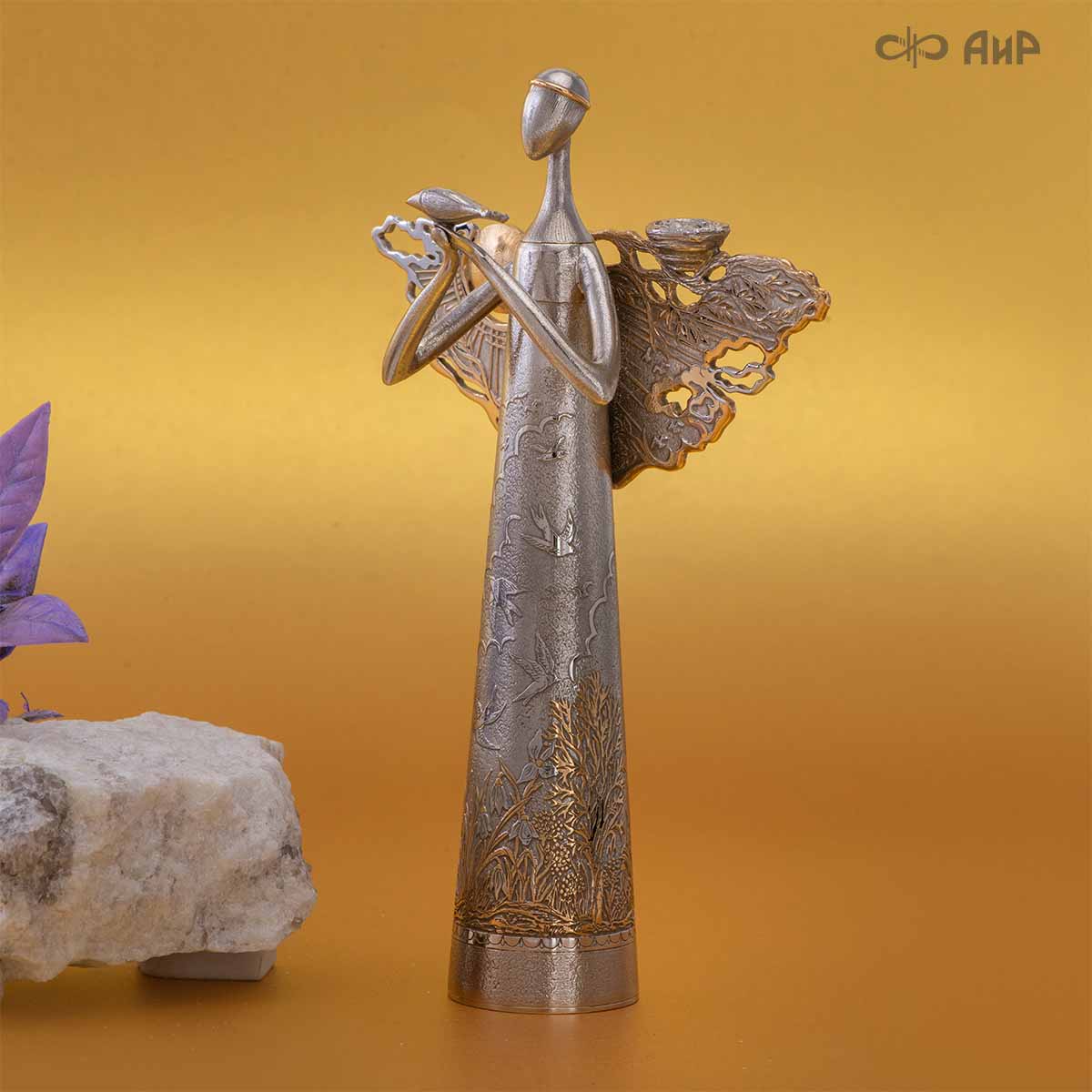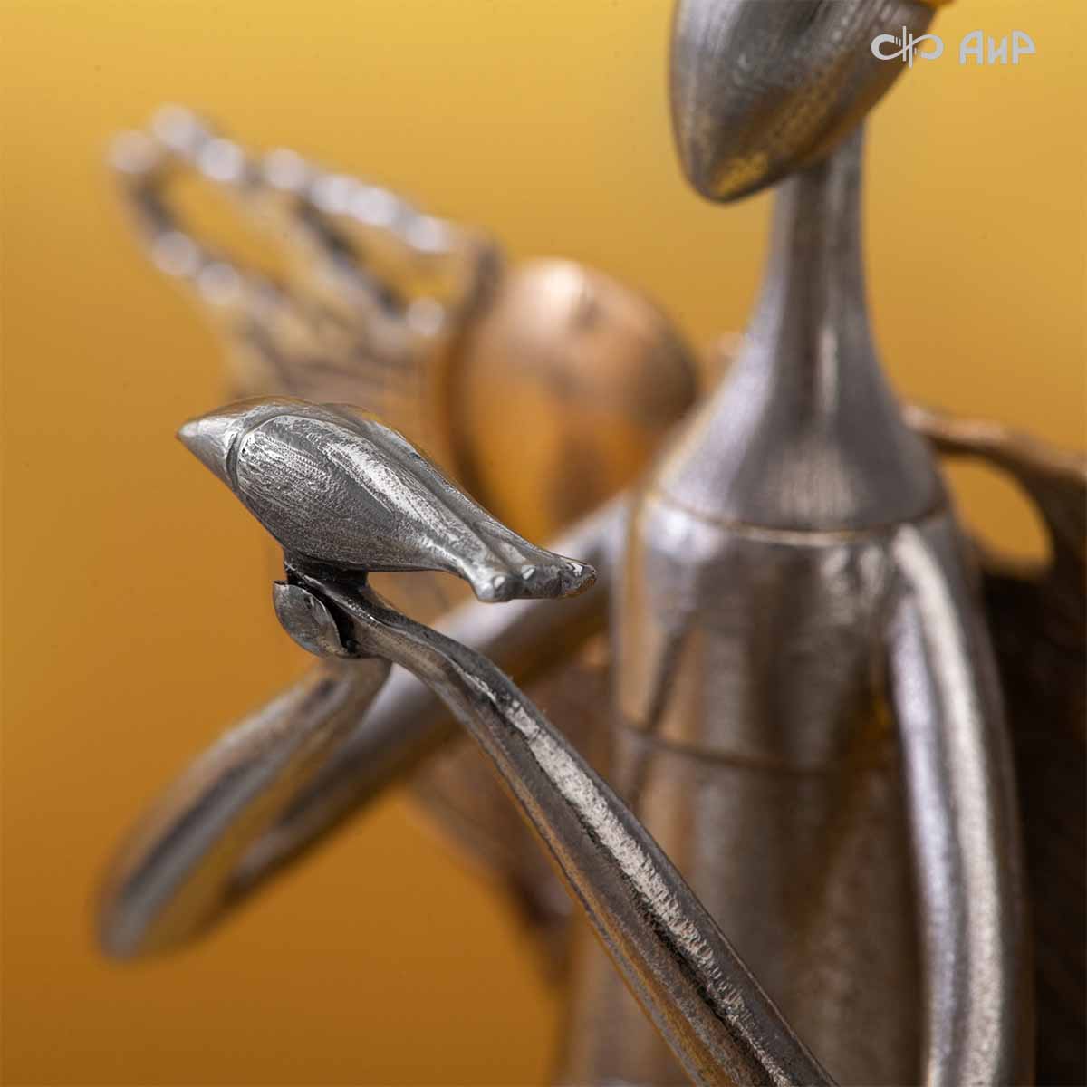Сувенир «Ангел Весна» – это маленькое чудо, рожденное тонкой душой художника и сотворенное руками мастера-оружейника Компании «АиР». Филигранная работа видна во всем образе сувенира. Изящная фигурка Ангела одета в платье, украшенное подснежниками и ласточками, пташка доверчиво пригрелась на руках Ангела. Крылья Ангела выполнены в виде весенних грозовых туч, сквозь которые все сильнее светит солнце, перелетные птицы возвращаются домой, чтобы свить гнезда.