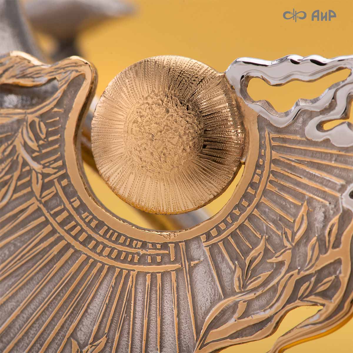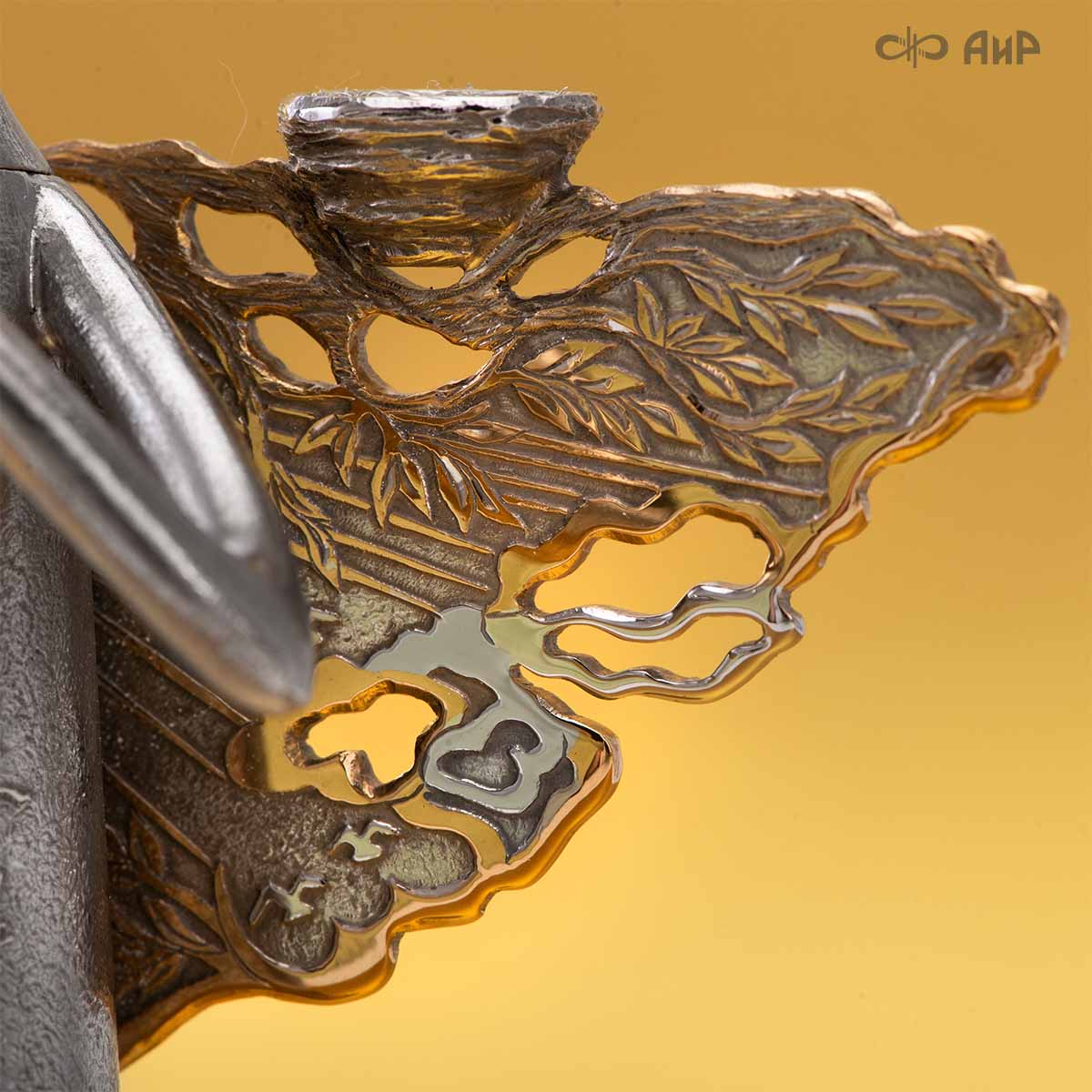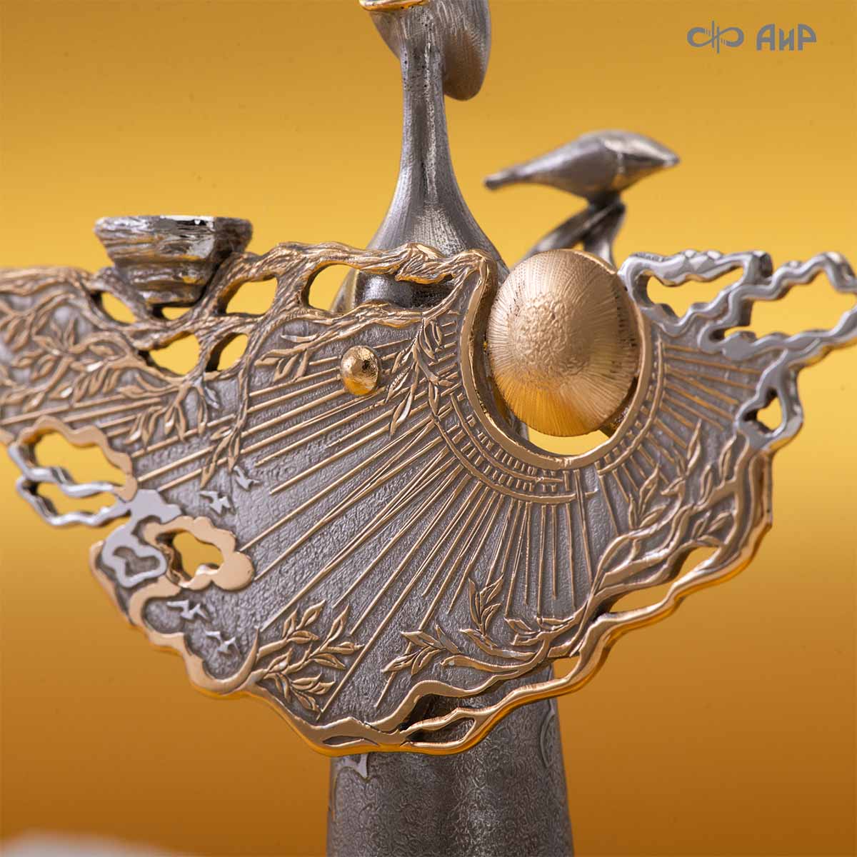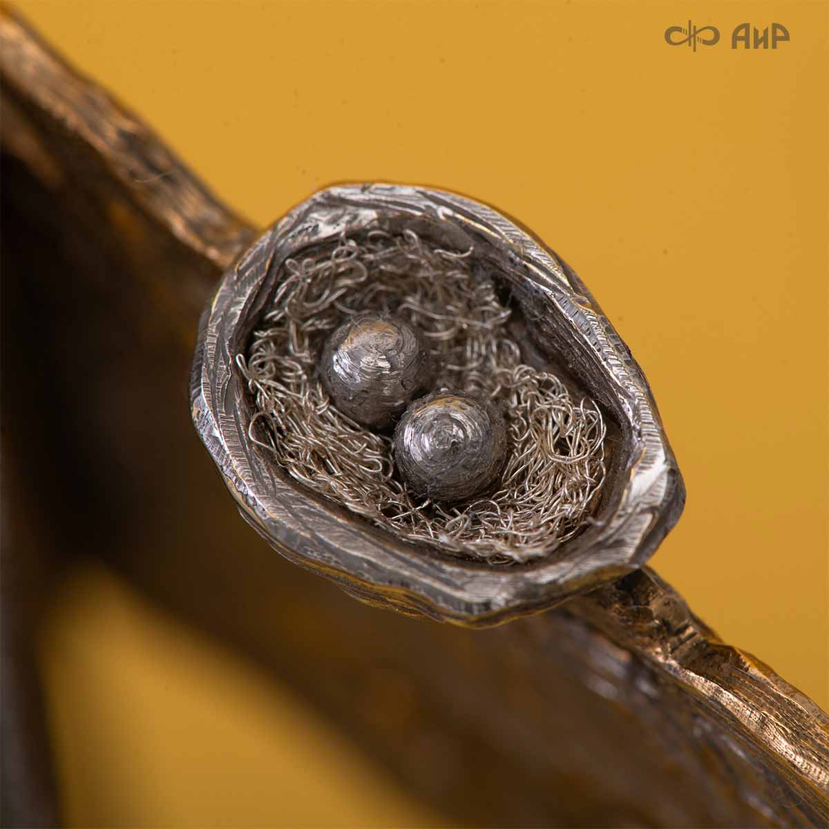 Сувенир «Ангел Весна» – это маленькое чудо, рожденное тонкой душой художника и сотворенное руками мастера-оружейника Компании «АиР». Филигранная работа видна во всем образе сувенира. Изящная фигурка Ангела одета в платье, украшенное подснежниками и ласточками, пташка доверчиво пригрелась на руках Ангела. Крылья Ангела выполнены в виде весенних грозовых туч, сквозь которые все сильнее светит солнце, перелетные птицы возвращаются домой, чтобы свить гнезда.