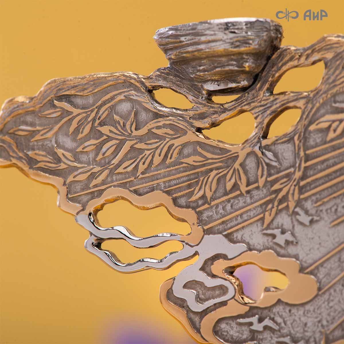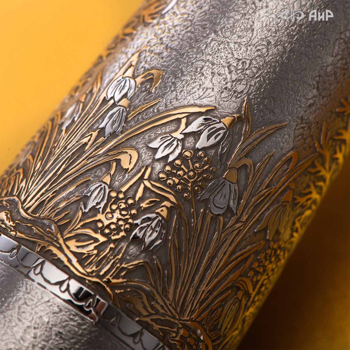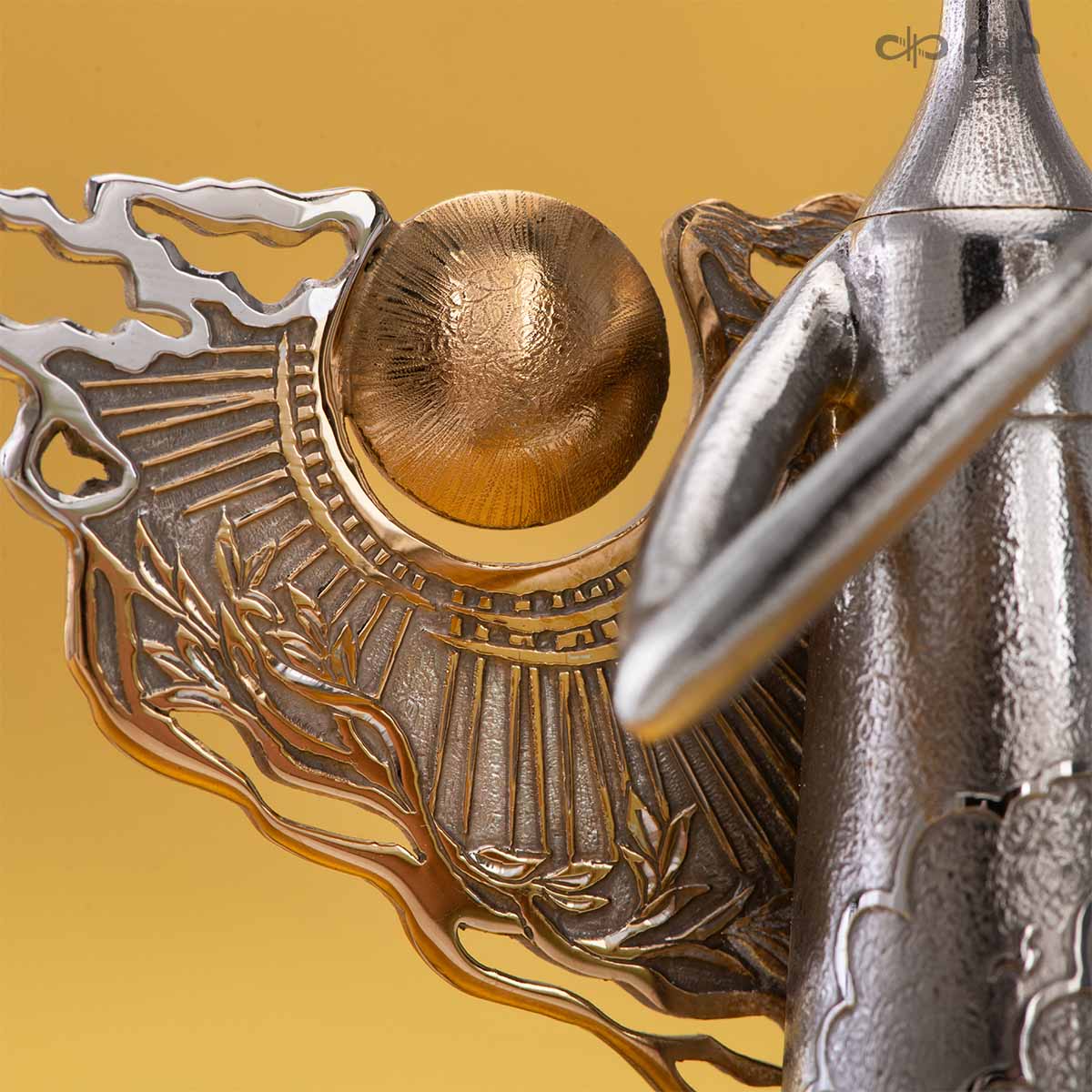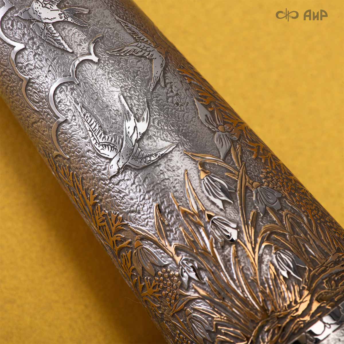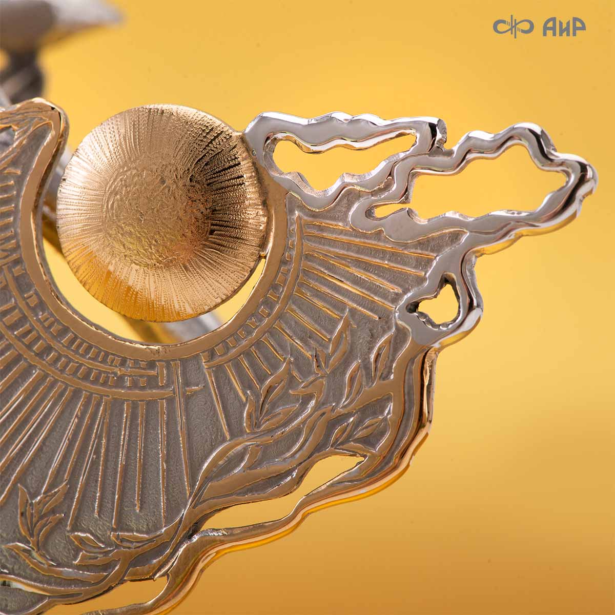 Сувенир «Ангел Весна» – это маленькое чудо, рожденное тонкой душой художника и сотворенное руками мастера-оружейника Компании «АиР». Филигранная работа видна во всем образе сувенира. Изящная фигурка Ангела одета в платье, украшенное подснежниками и ласточками, пташка доверчиво пригрелась на руках Ангела. Крылья Ангела выполнены в виде весенних грозовых туч, сквозь которые все сильнее светит солнце, перелетные птицы возвращаются домой, чтобы свить гнезда.
