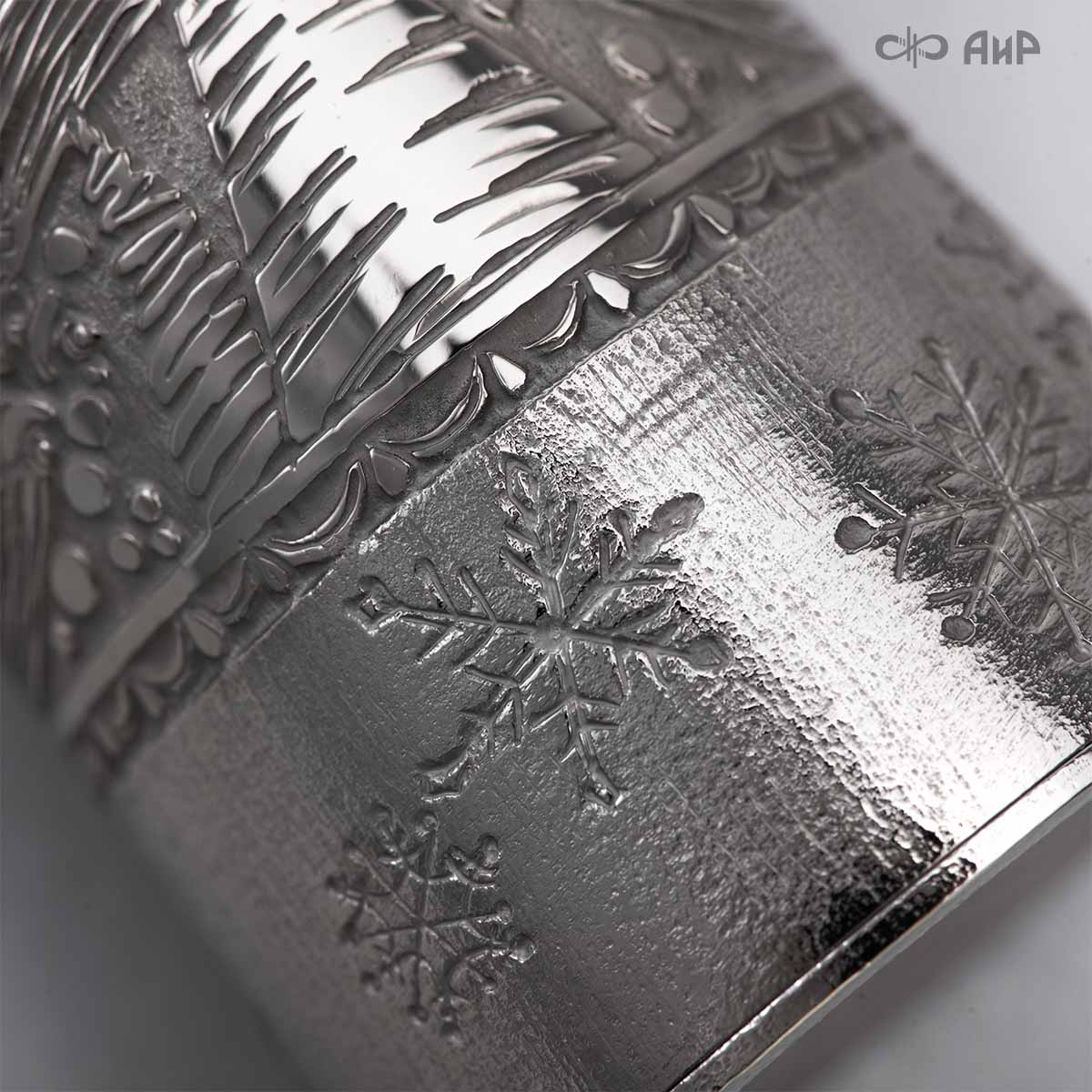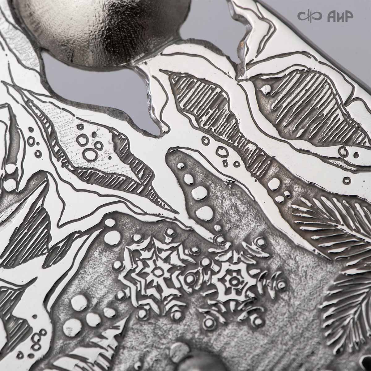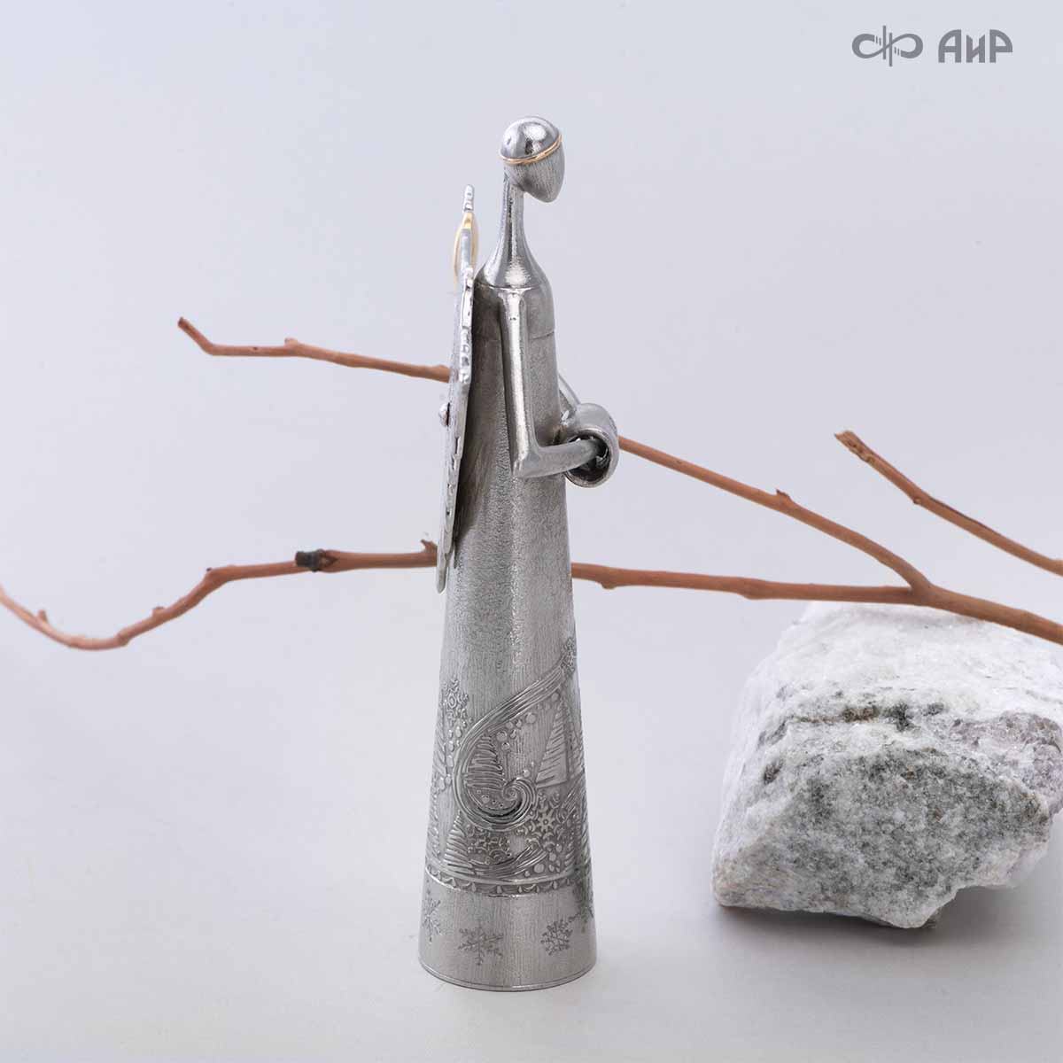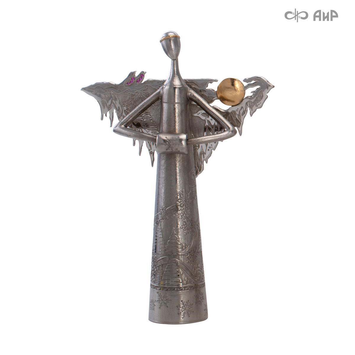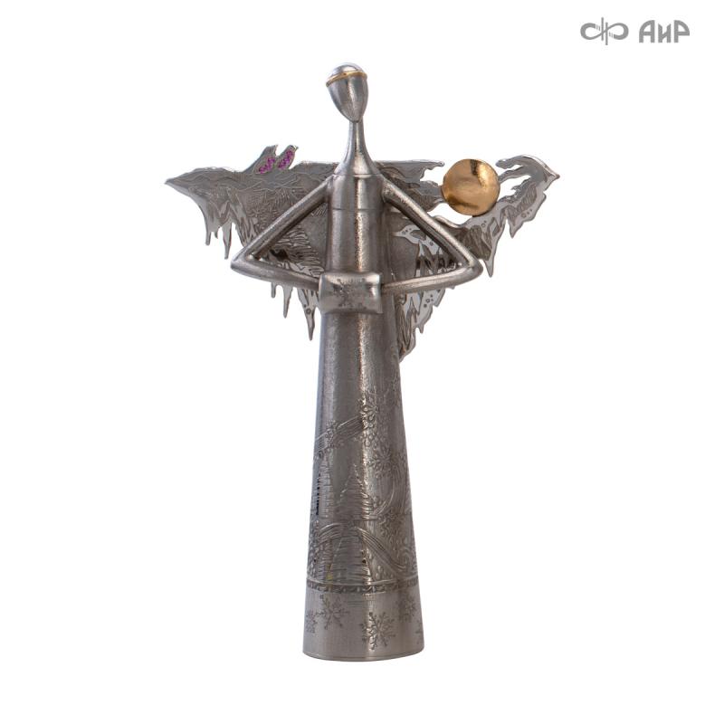Сувенир «Ангел Зима» – это маленькое чудо, рожденное тонкой душой художника и сотворенное руками мастера-оружейника Компании «АиР». Филигранная работа видна во всем образе сувенира. Изящная фигурка Ангела в платье, украшенном елками и снежинками, заснеженная муфта, крылья в виде сосулек, с узорами в виде ветвей рябины и хвойных лап, на которых примостилась пара снегирей.