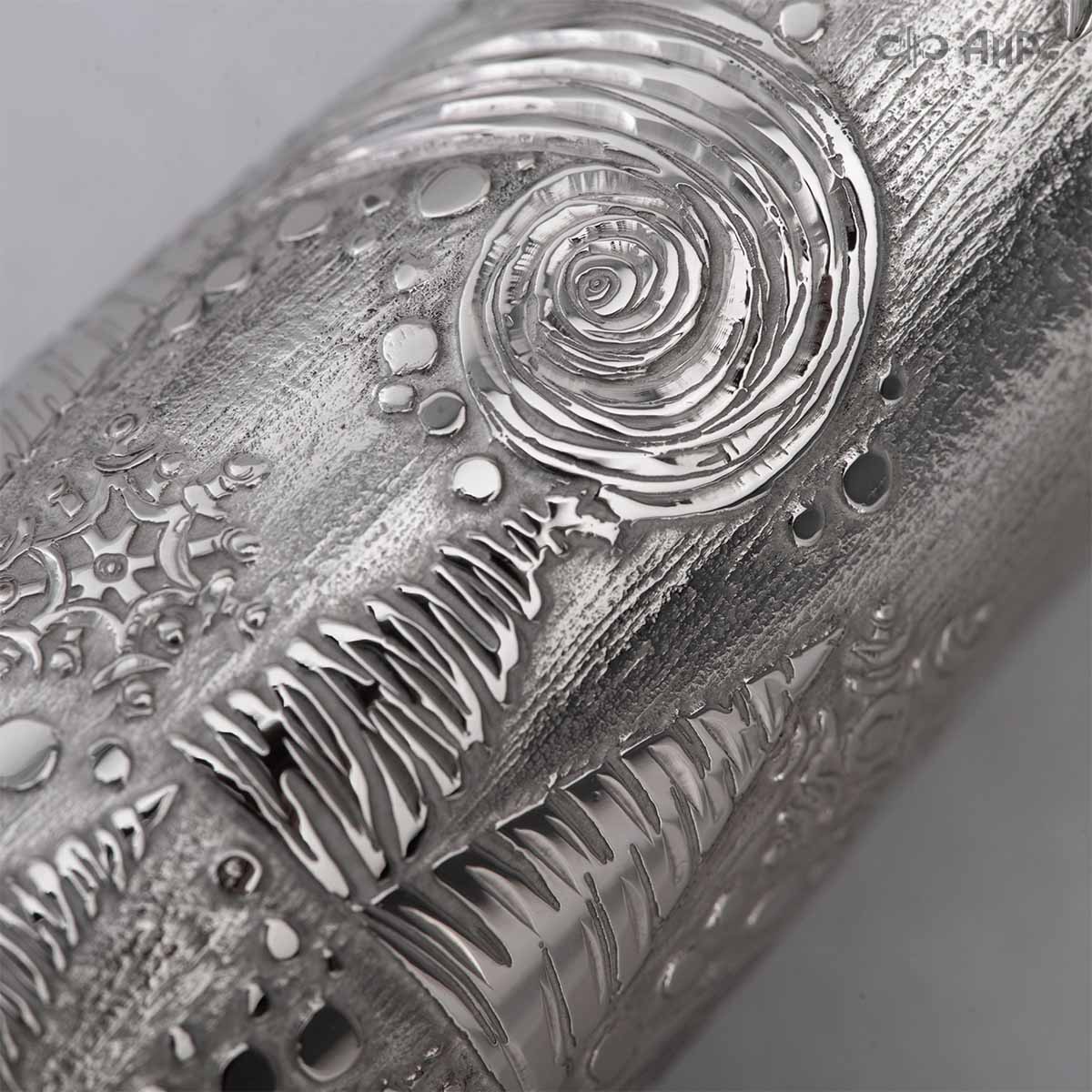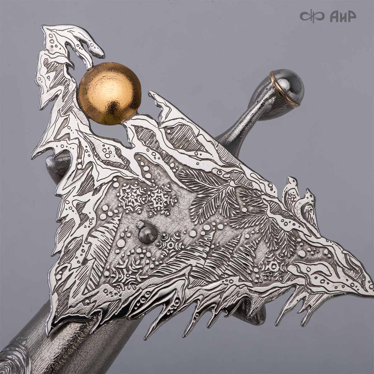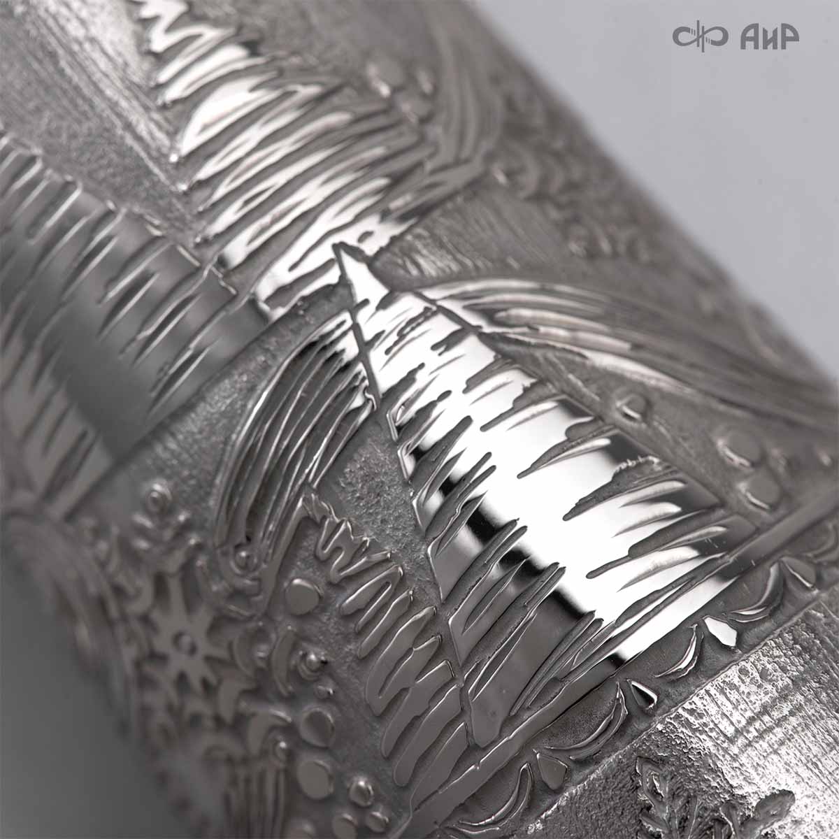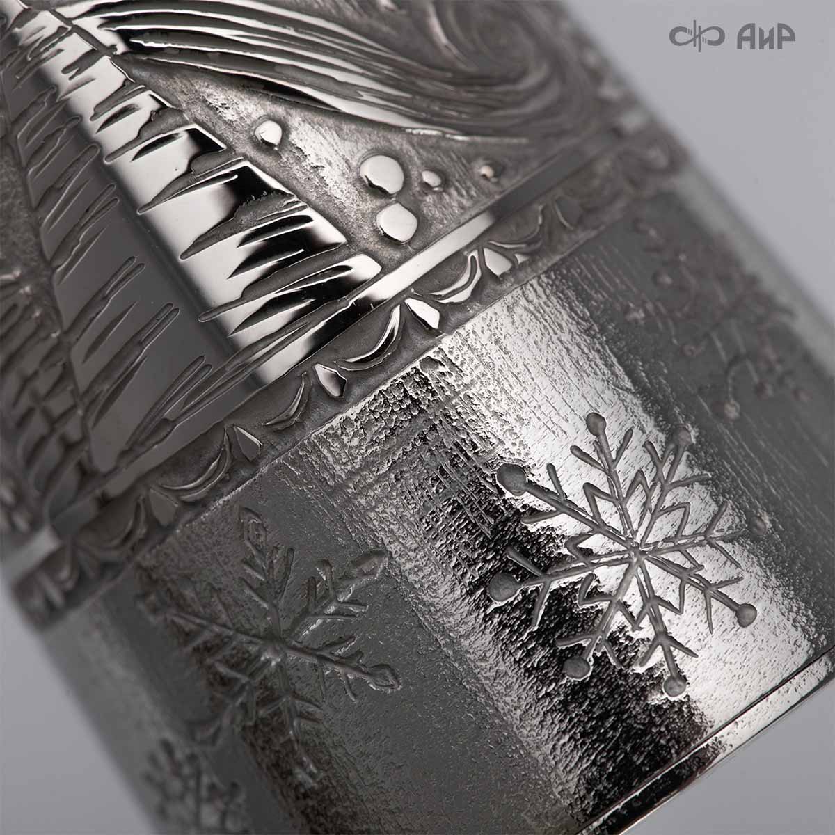 Сувенир «Ангел Зима» – это маленькое чудо, рожденное тонкой душой художника и сотворенное руками мастера-оружейника Компании «АиР». Филигранная работа видна во всем образе сувенира. Изящная фигурка Ангела в платье, украшенном елками и снежинками, заснеженная муфта, крылья в виде сосулек, с узорами в виде ветвей рябины и хвойных лап, на которых примостилась пара снегирей.
