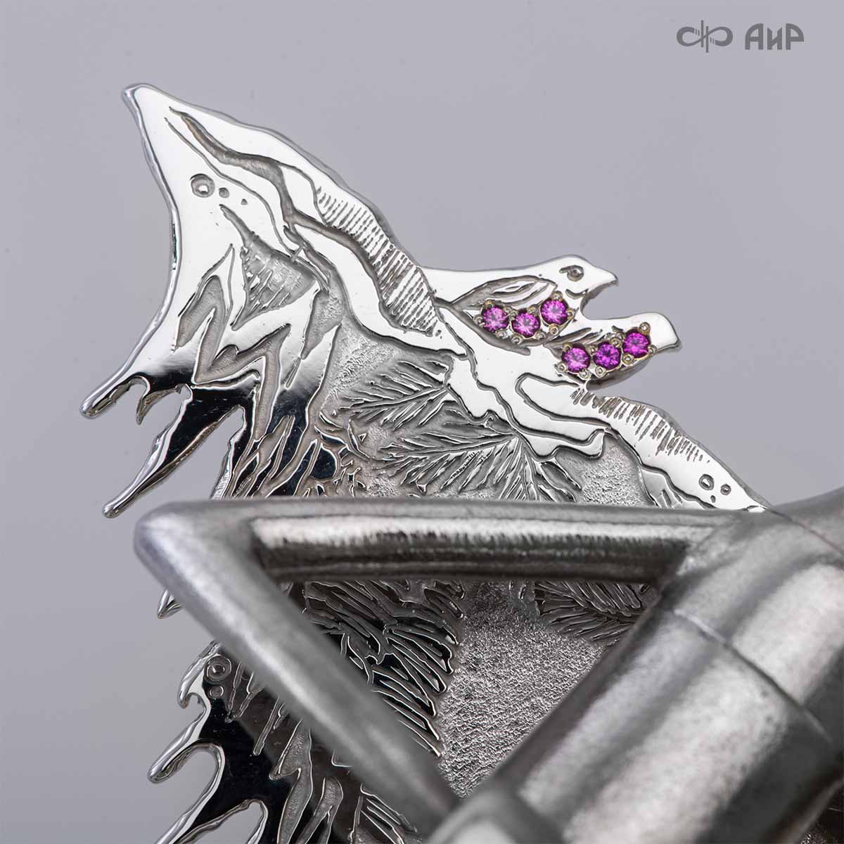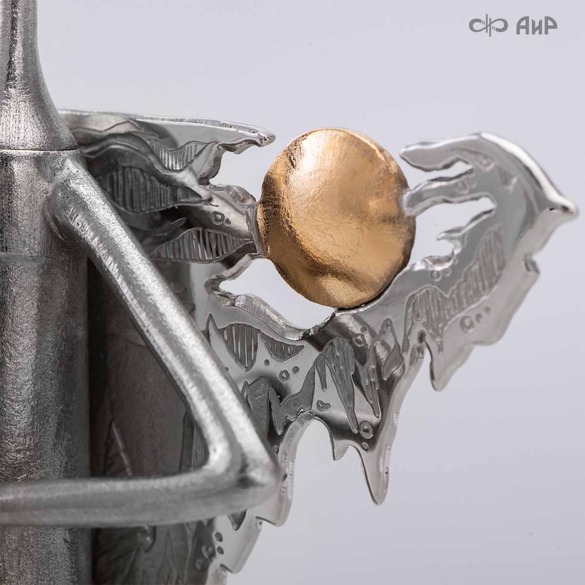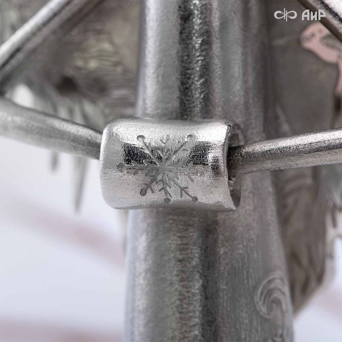 Крылья «Ангела Зимы» тонко проработаны, особую воздушность изделию придает просечка по металлу. В грудки снегирей инкрустированы гранаты. У Ангела нет четко прорисованного лица, это дань традиции – такими чистыми, без лица, мастерили рукодельных кукол еще в древности наши предки. Это означает, что у Ангела всегда будет то настроение в душе и выражение на лице, какое оно у владельца.