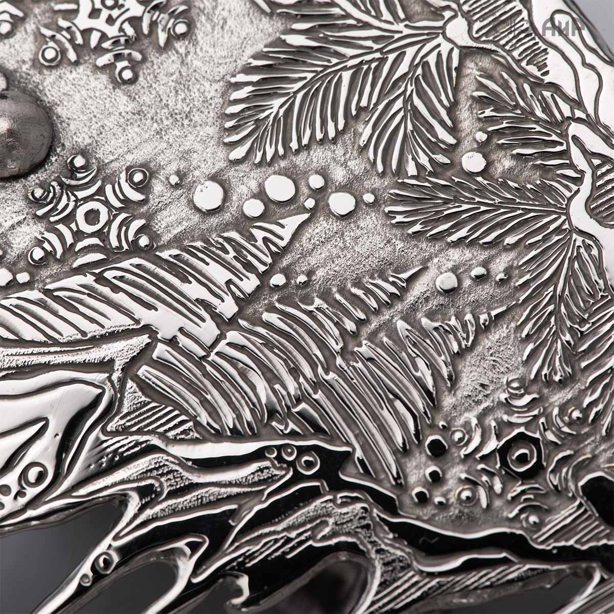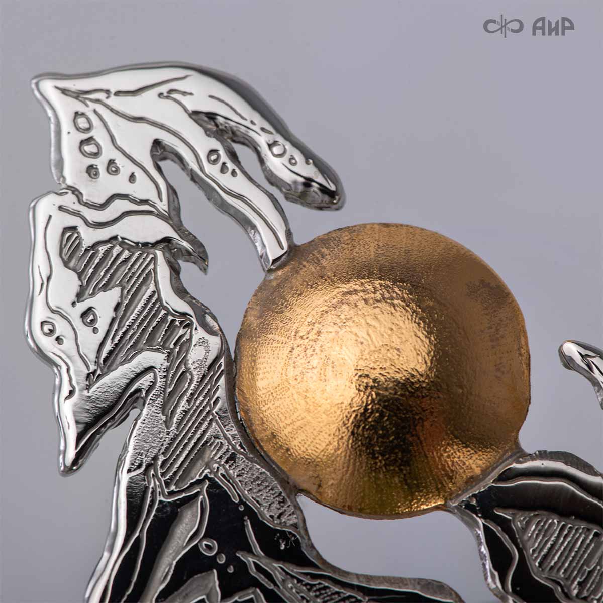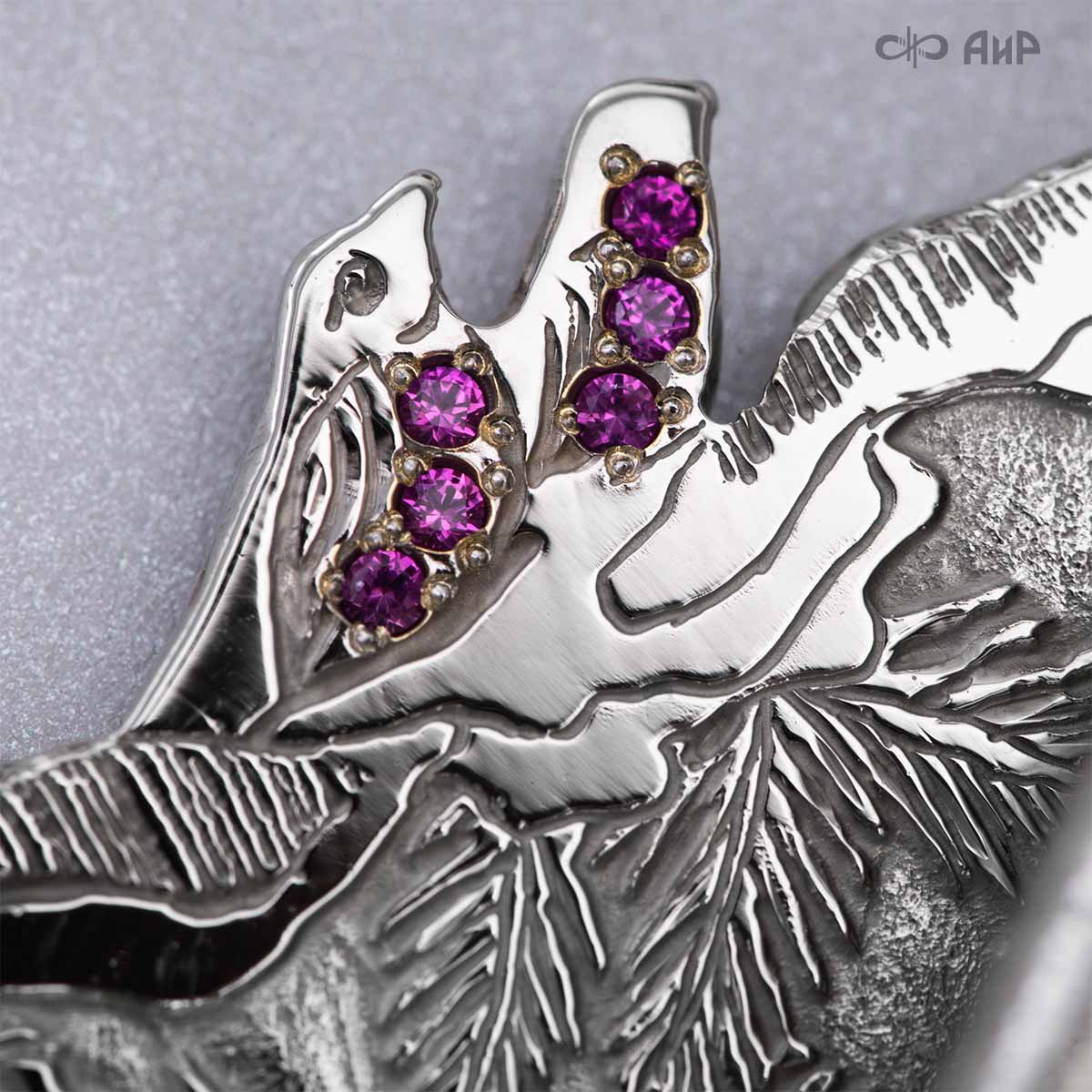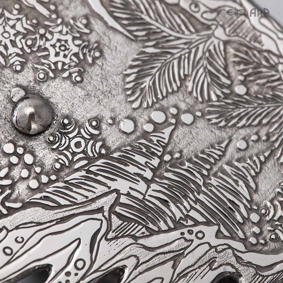 Крылья «Ангела Зимы» тонко проработаны, особую воздушность изделию придает просечка по металлу. В грудки снегирей инкрустированы гранаты. У Ангела нет четко прорисованного лица, это дань традиции – такими чистыми, без лица, мастерили рукодельных кукол еще в древности наши предки. Это означает, что у Ангела всегда будет то настроение в душе и выражение на лице, какое оно у владельца.