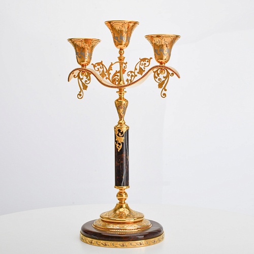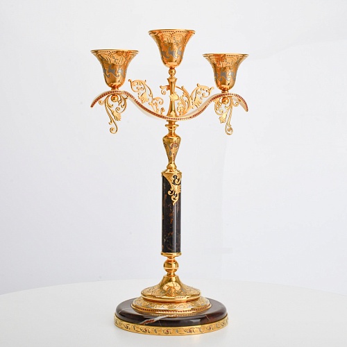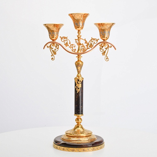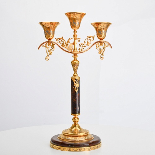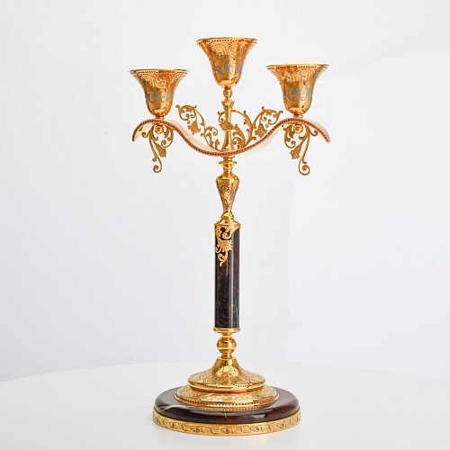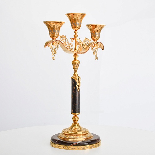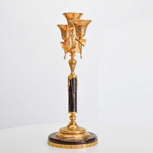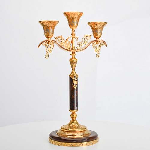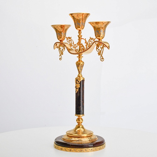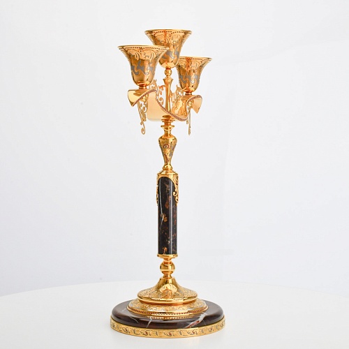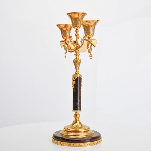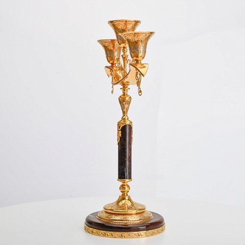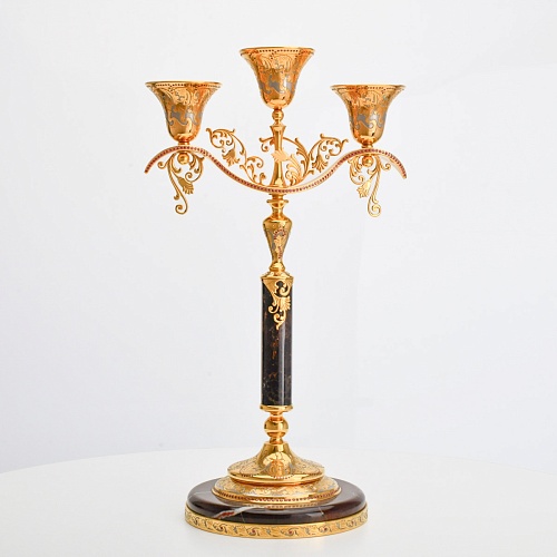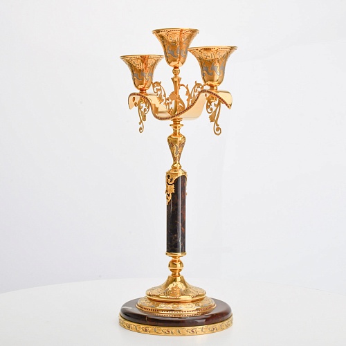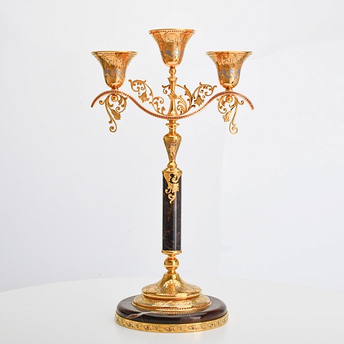 Изящный трехрожковый подсвечник представляет собой сочетание самого известного и распространенного самоцвета на земле – яшмы и тонко обработанных, декорированных деталей из металла. Чаши подсвечника представляют собой перевернутые колокольчики, которые помещены на единую дугу, украшенную прорезными элементами и инкрустированную родолитами, которые еще называют «розовый гранат».