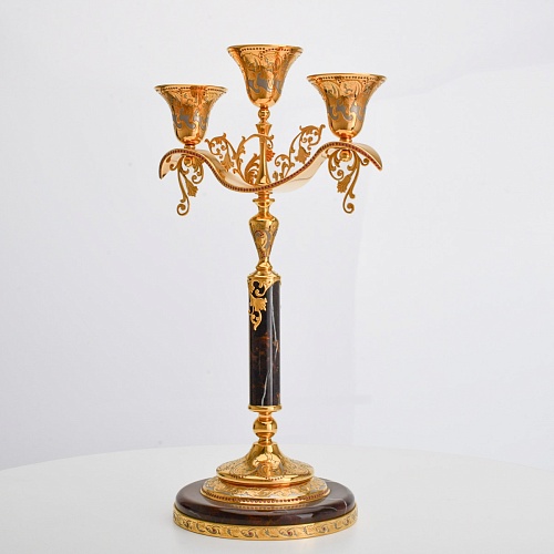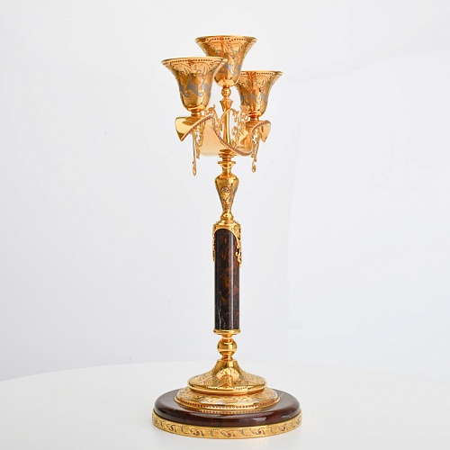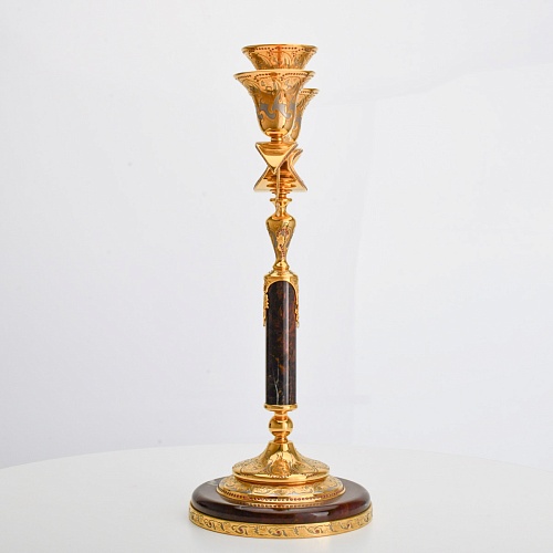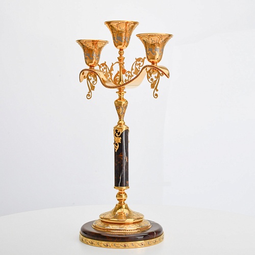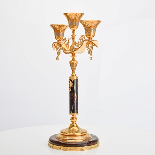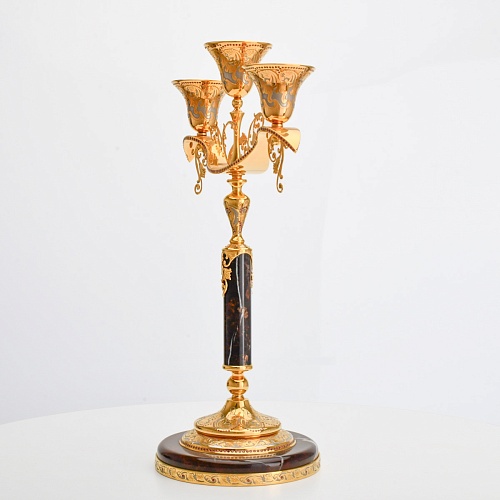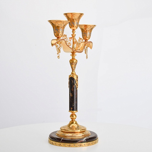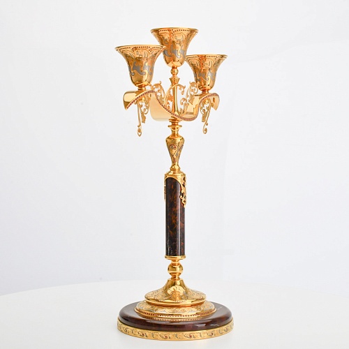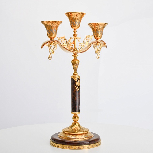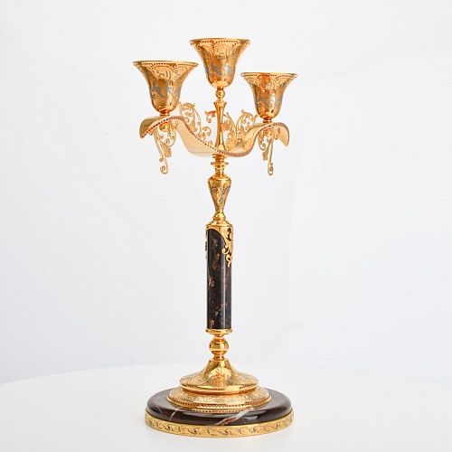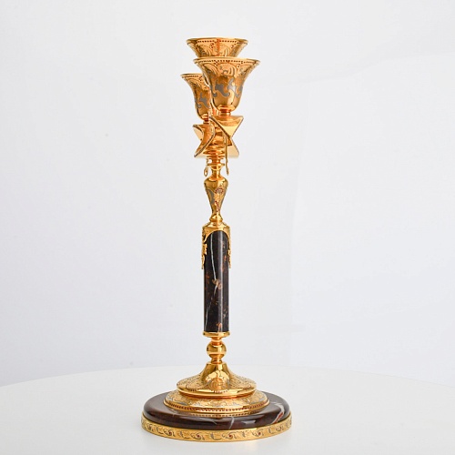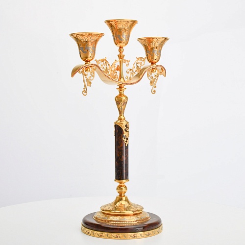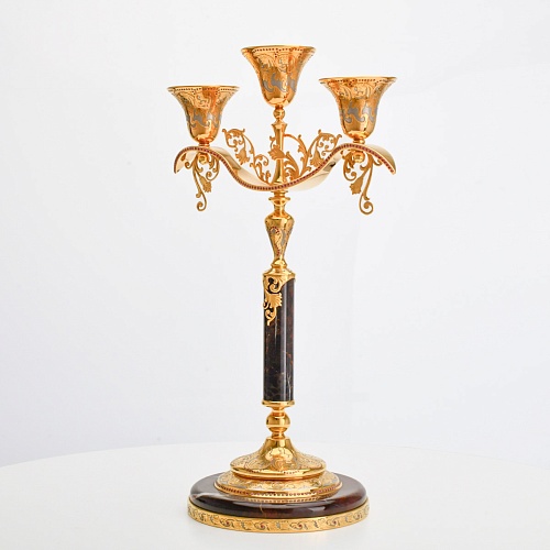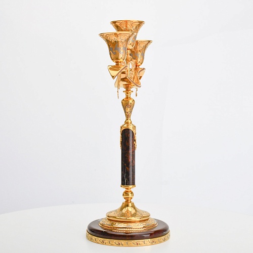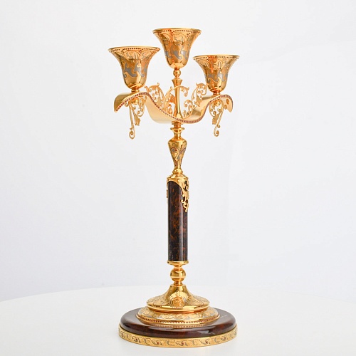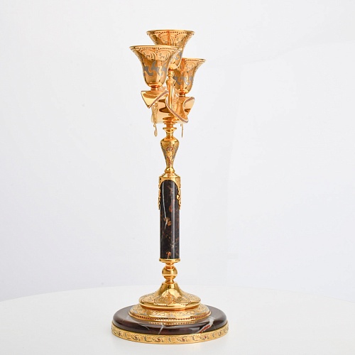 Изящный трехрожковый подсвечник представляет собой сочетание самого известного и распространенного самоцвета на земле – яшмы и тонко обработанных, декорированных деталей из металла. Чаши подсвечника представляют собой перевернутые колокольчики, которые помещены на единую дугу, украшенную прорезными элементами и инкрустированную родолитами, которые еще называют «розовый гранат».