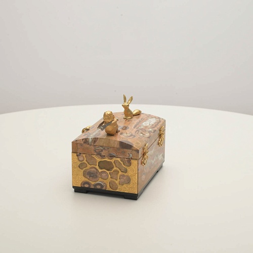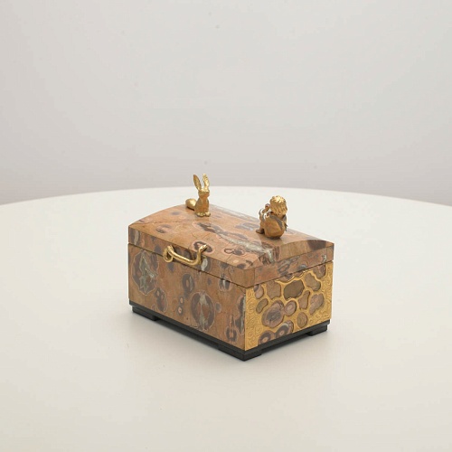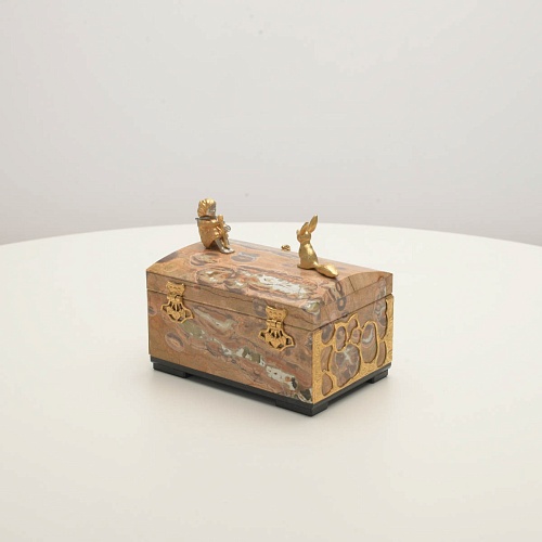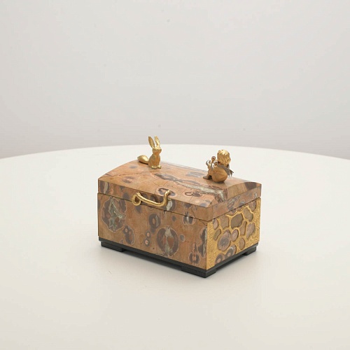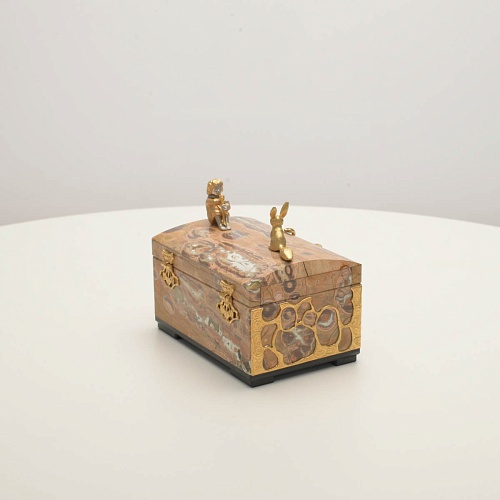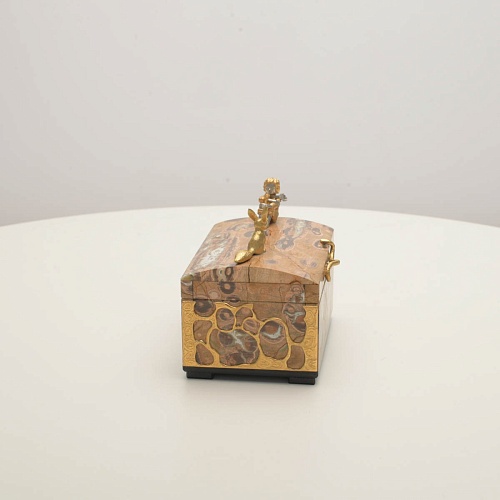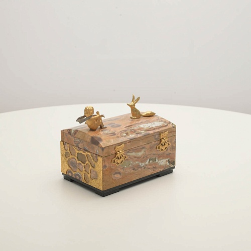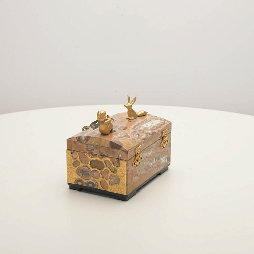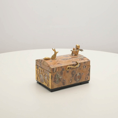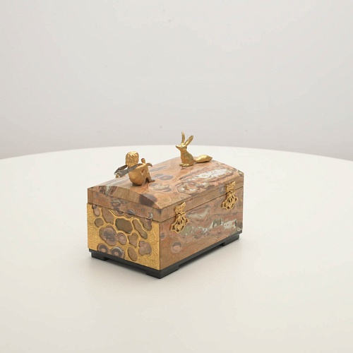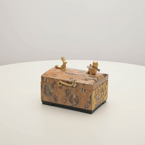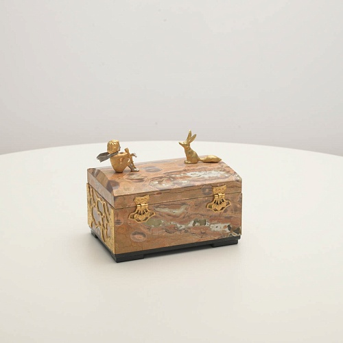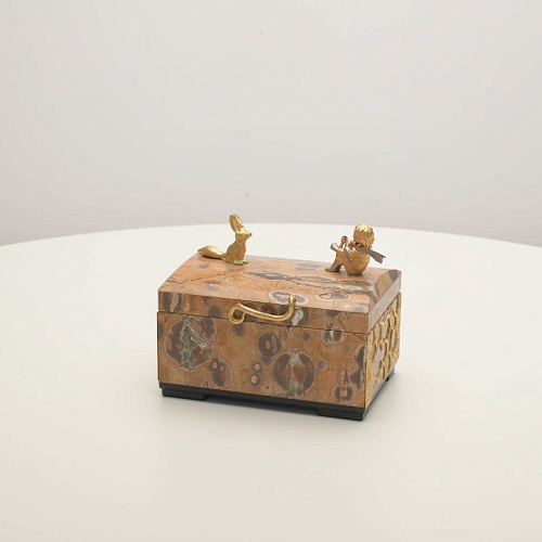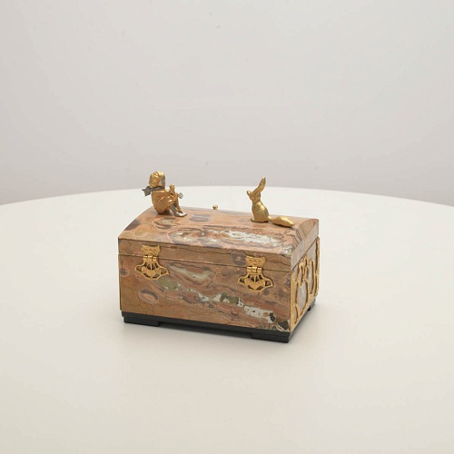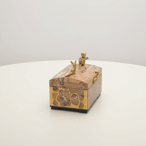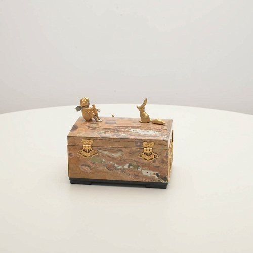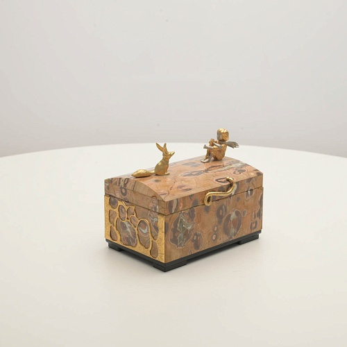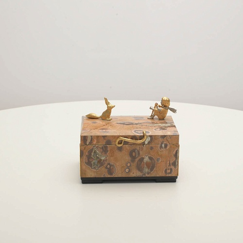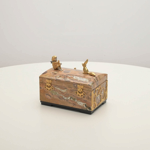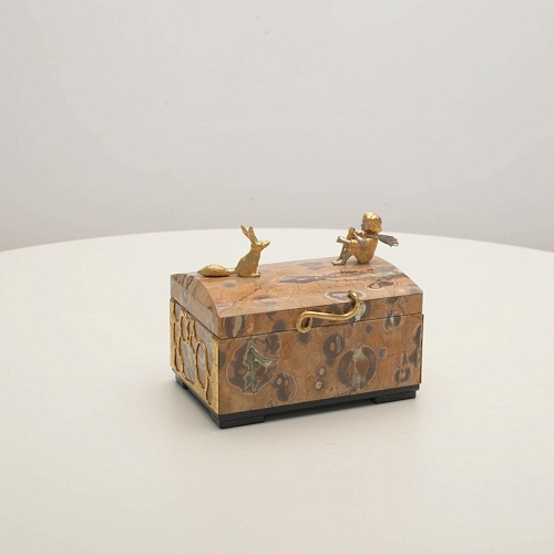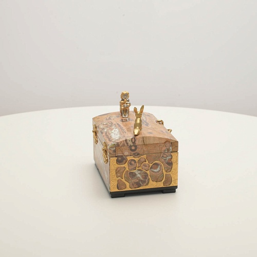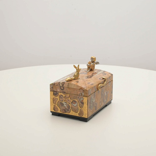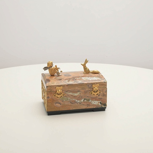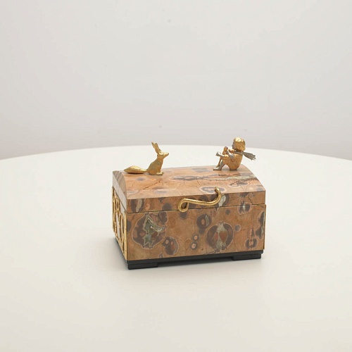 Шкатулка изготовлена из риолита (вулканическая яшма) редкой красоты. Боковые стороны шкатулки украшены просечными накладками в стиле златоустовской гравюры на металле. С особым изяществом исполнены фигурки персонажей бессмертной сказки Антуана Сент-Экзюпери: Маленького принца, Розы, Лиса и Змеи. Элементы шкатулки покрыты золотом и серебром, которые придают всему изделию элегантный вид.