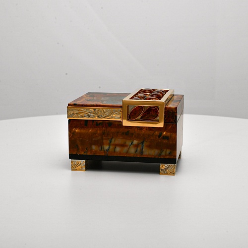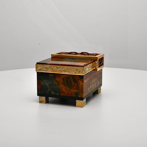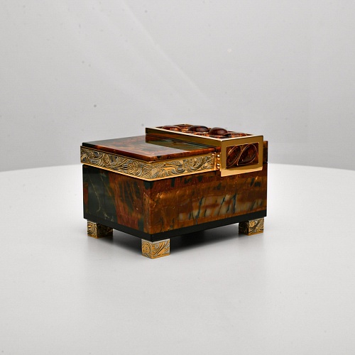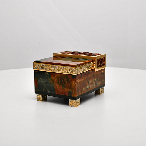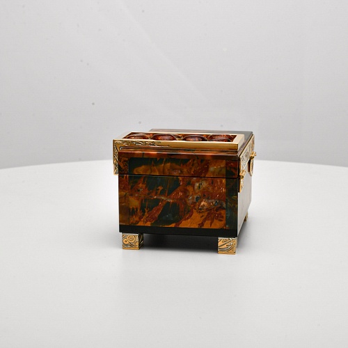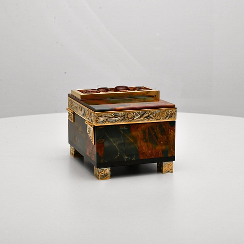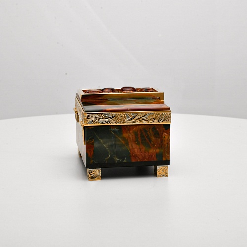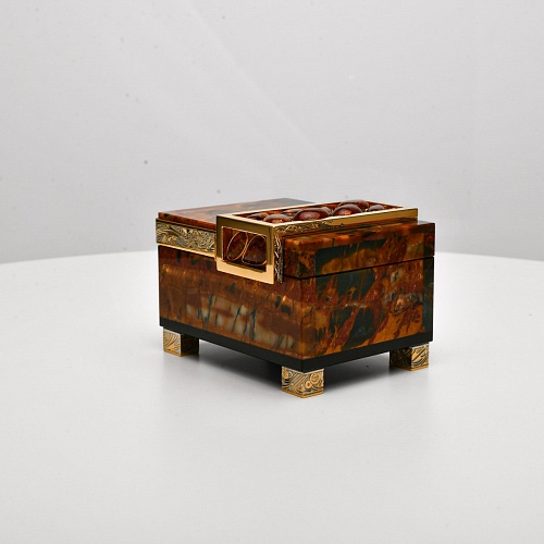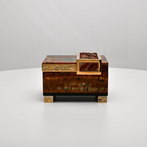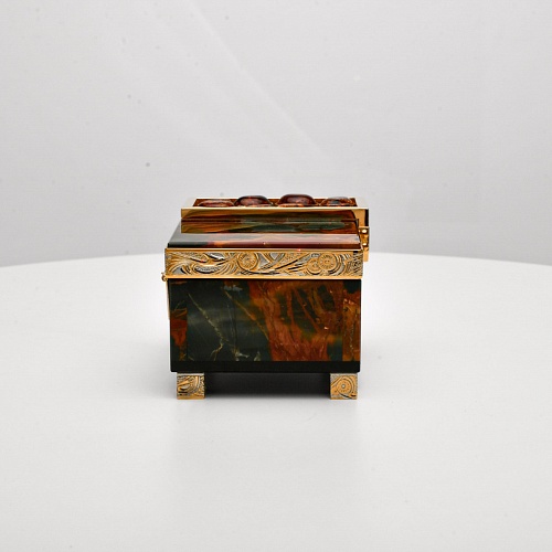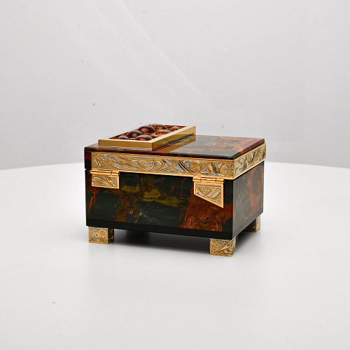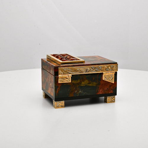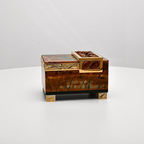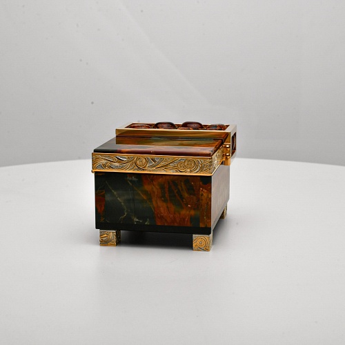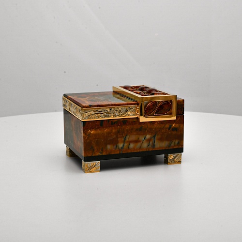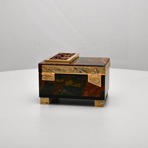 Шкатулка "Энергия солнца" изготовлена из яшмы Пикассо редкой красоты и украшена кабошонами янтаря. Ножки, боковые стороны и крышка шкатулки украшены накладками в стиле златоустовской гравюры на металле. Эта шкатулка хранит тепло рук мастеров, она - как кладовая солнца, которое запечатано в янтаре и природном камне.