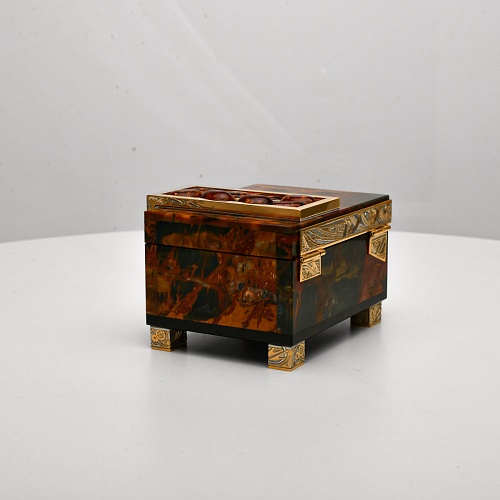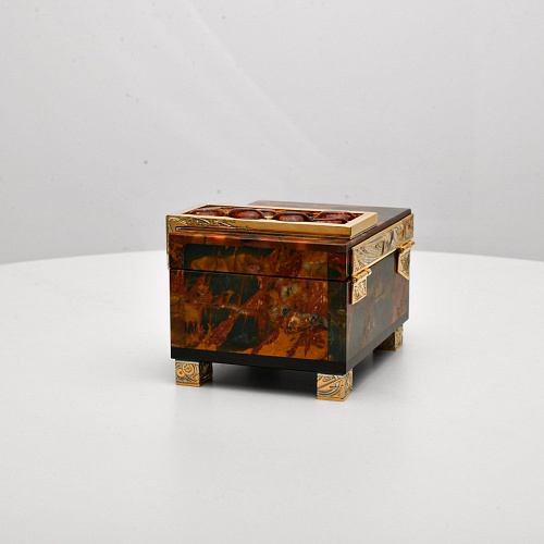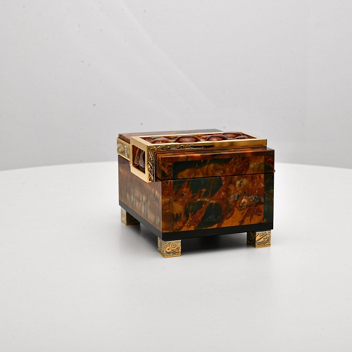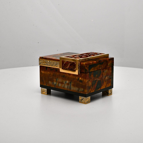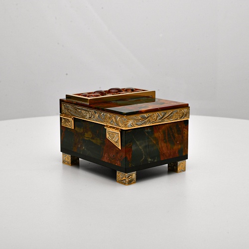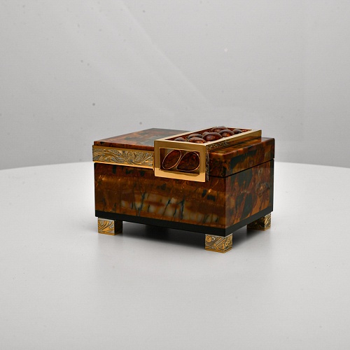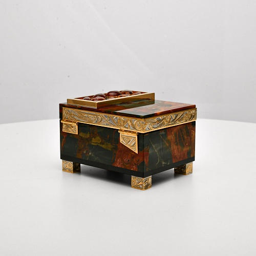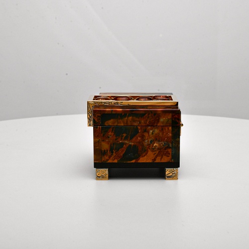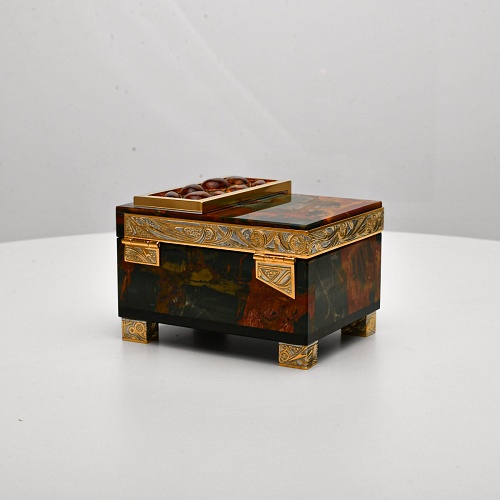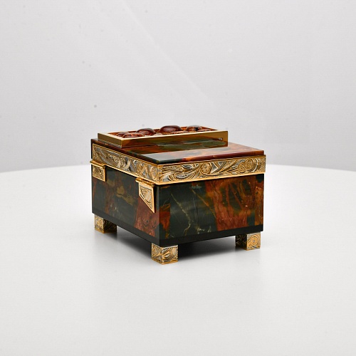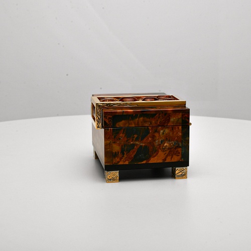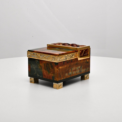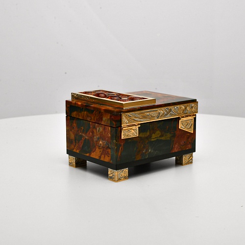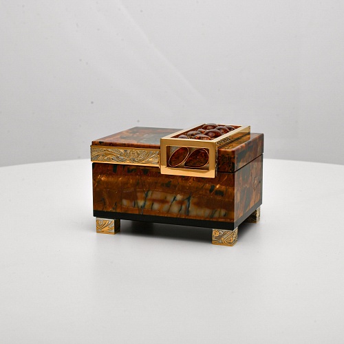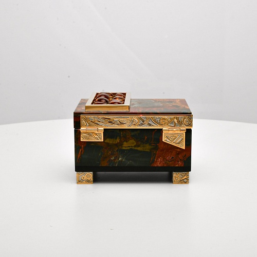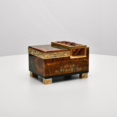 Шкатулка "Энергия солнца" изготовлена из яшмы Пикассо редкой красоты и украшена кабошонами янтаря. Ножки, боковые стороны и крышка шкатулки украшены накладками в стиле златоустовской гравюры на металле. Эта шкатулка хранит тепло рук мастеров, она - как кладовая солнца, которое запечатано в янтаре и природном камне.