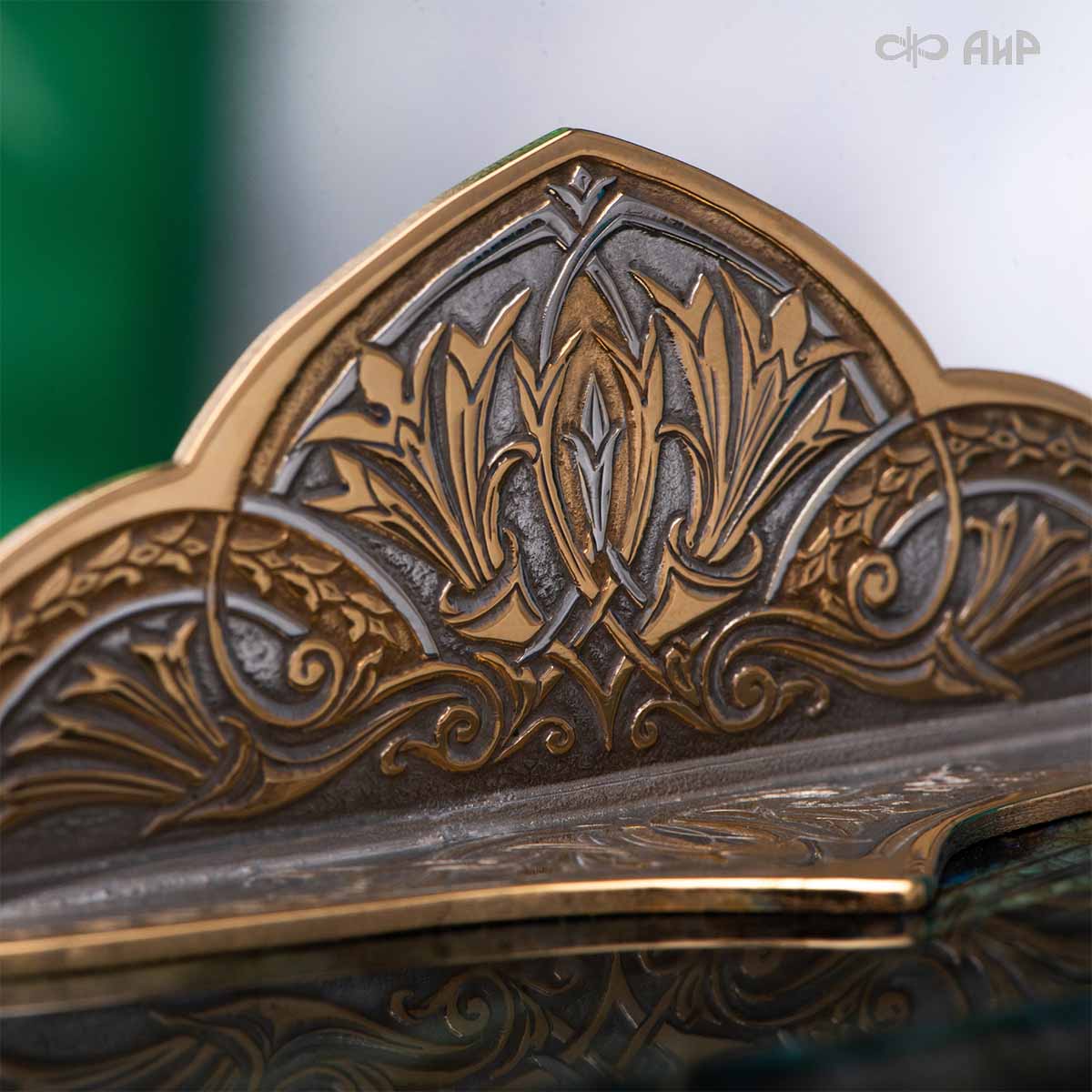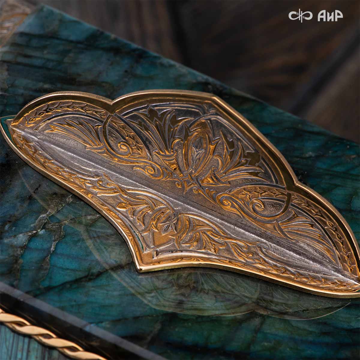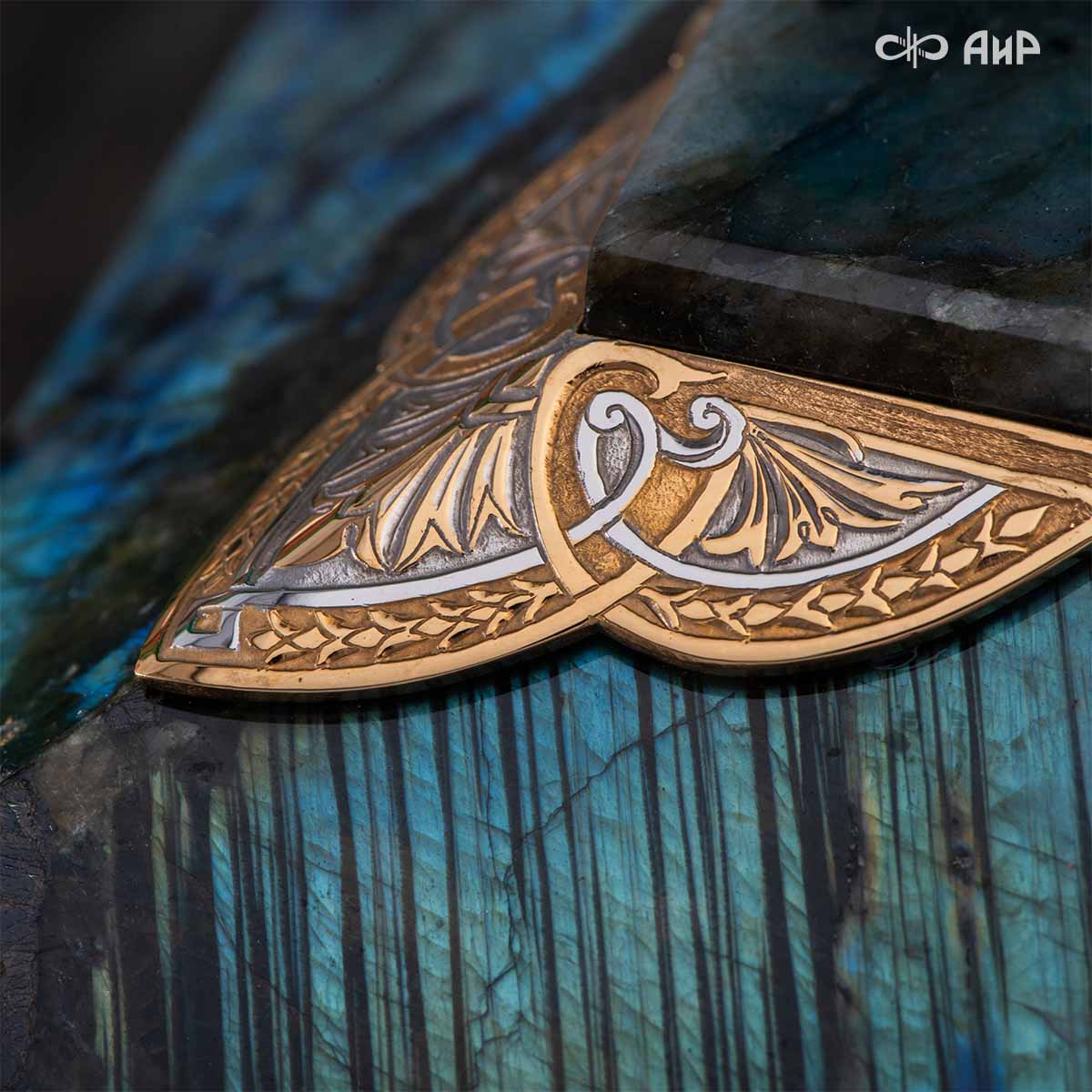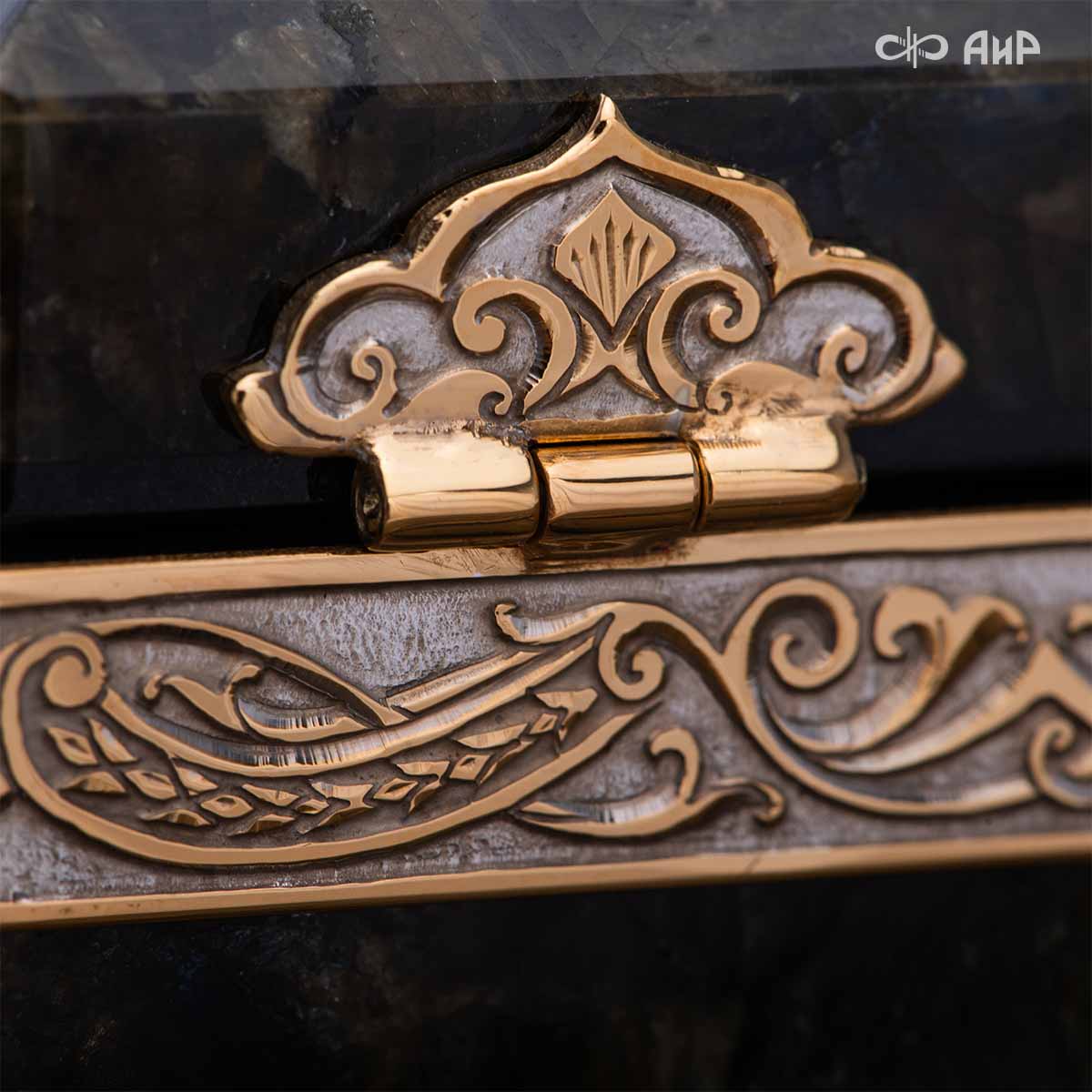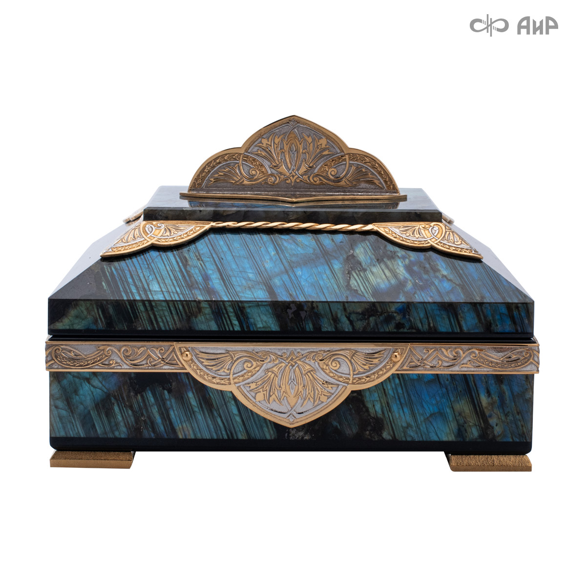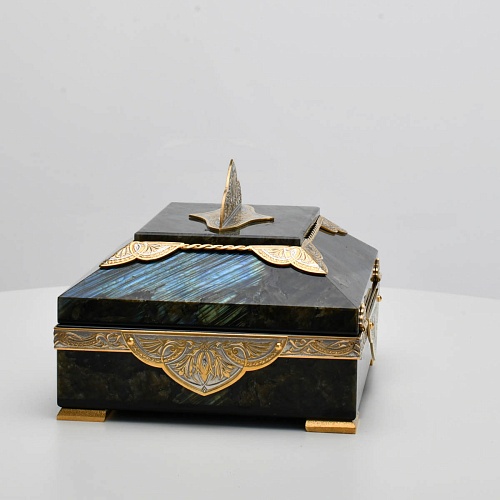 Шкатулка "Таинственная ночь" изготовлена из лабрадорита редкой красоты и украшена декоративными накладками с изображением цветочных орнаментов. Такая вещь, безусловно, украсит собой интерьер и станет изящным местом хранения для самых любимых и дорогих украшений.