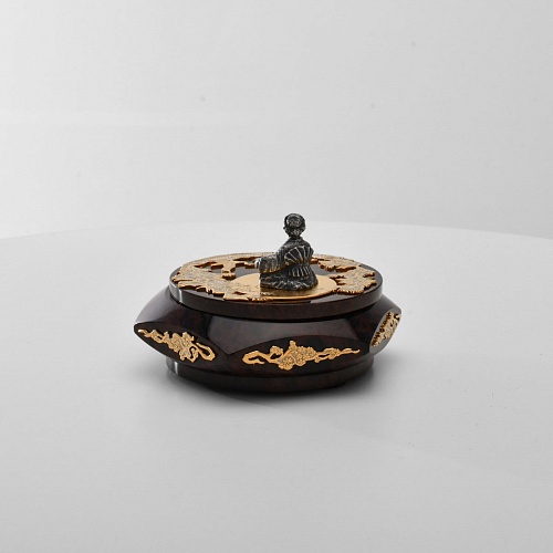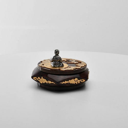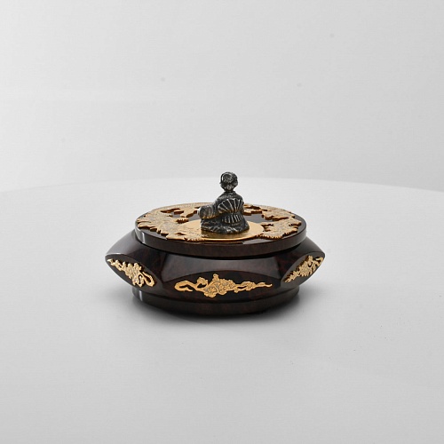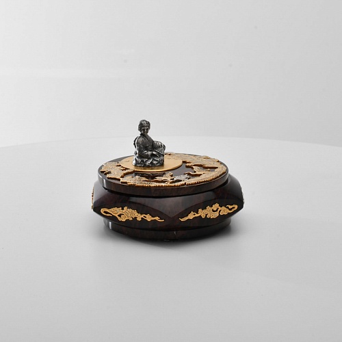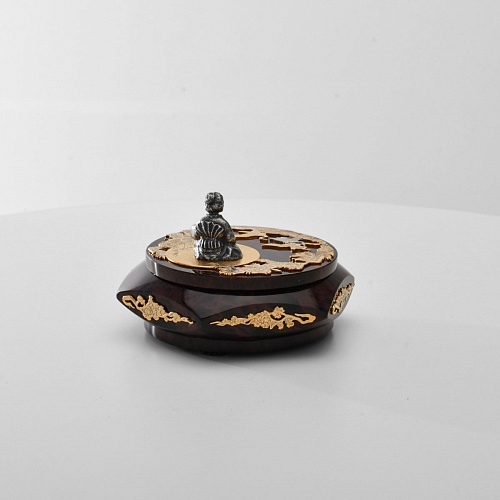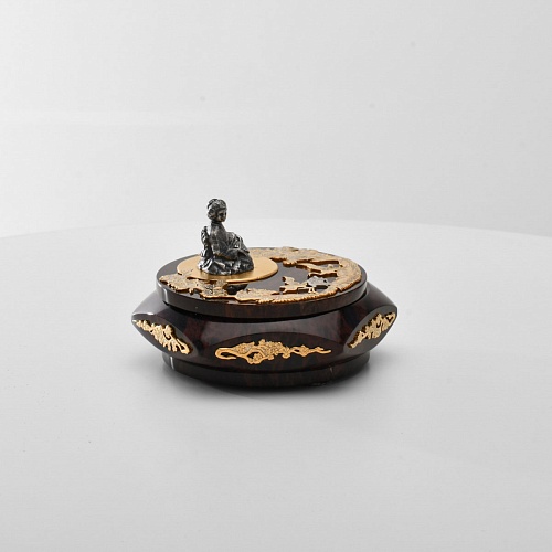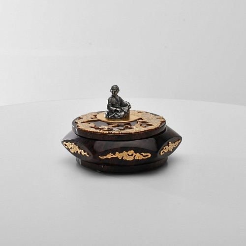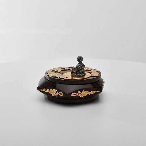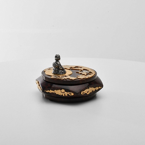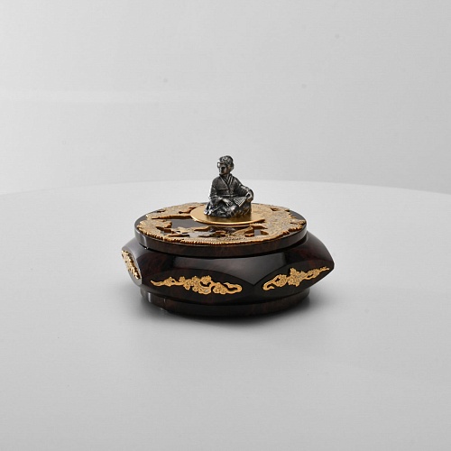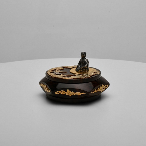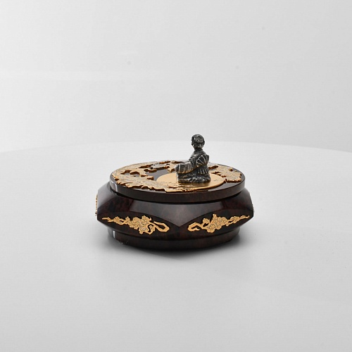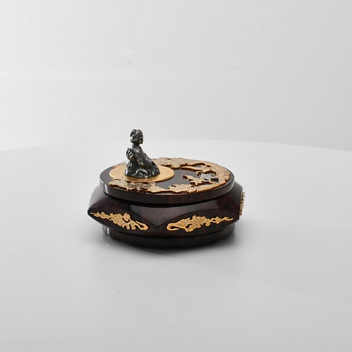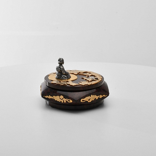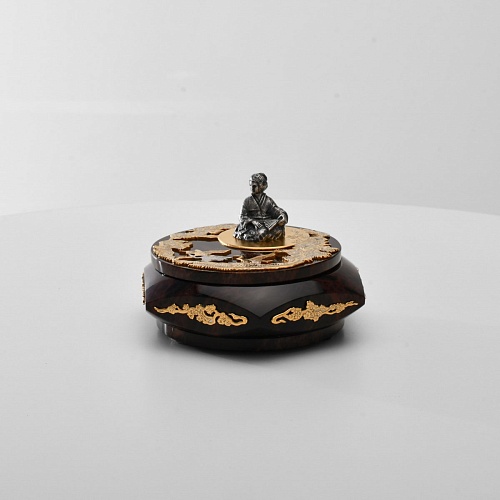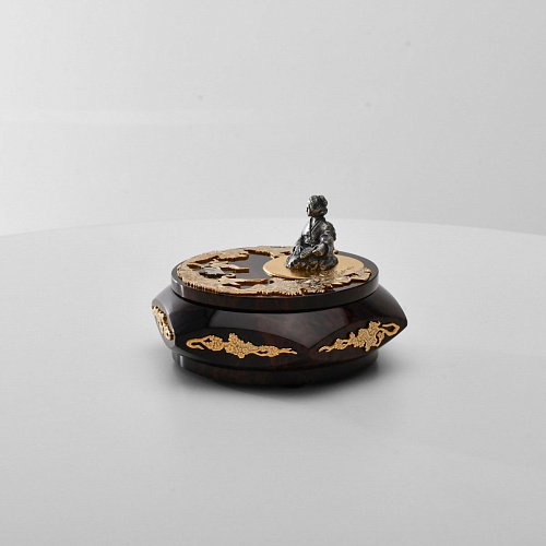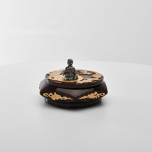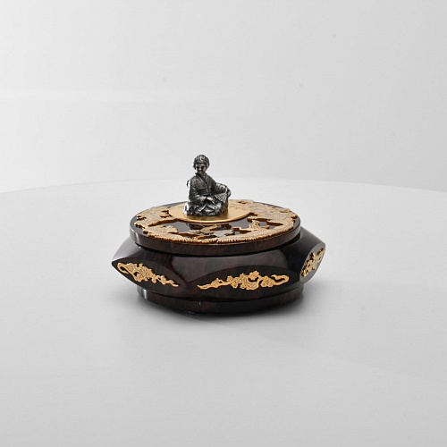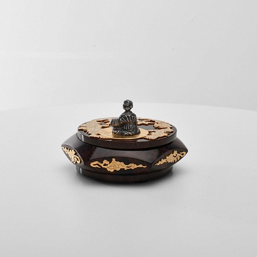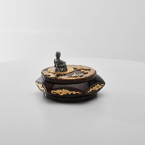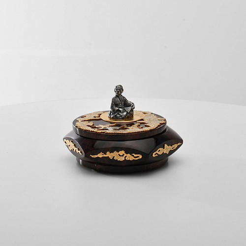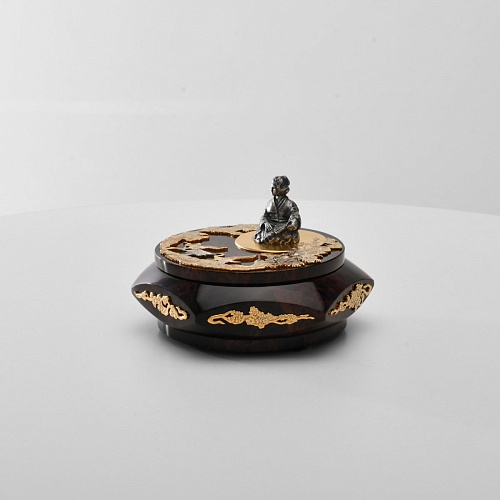 Шкатулка "Журавли" изготовлена из обсидиана редкой красоты и украшена декоративными просечными накладками с изображением танцующих журавлей, ветвей сосны и цветущей сакуры. В центре на крышке шкатулки расположилась миниатюрная фигурка гейши с веером, в традиционном японском кимоно. Ее глаза прикрыты, как будто она слушает тихую музыку японской лютни (сямисэн), под которую кружатся журавли.